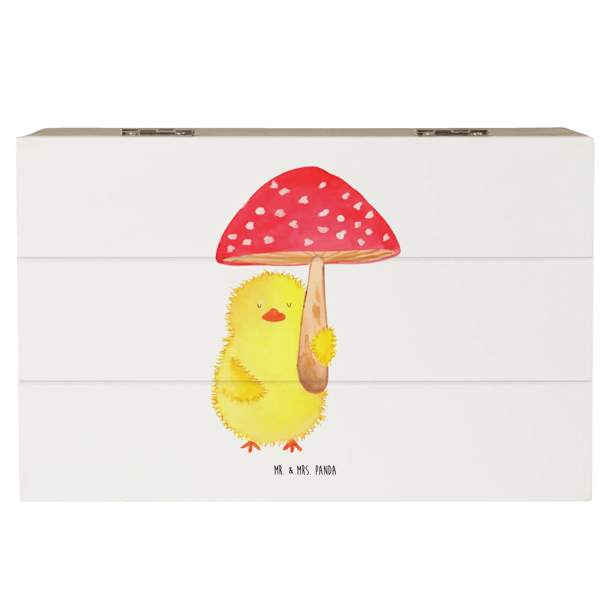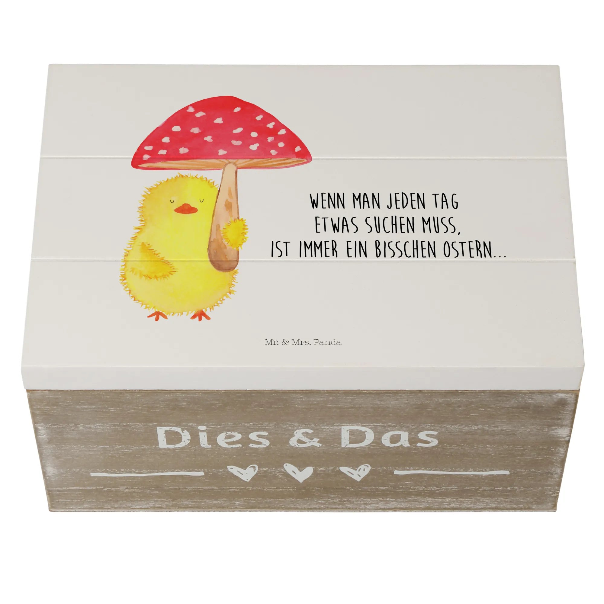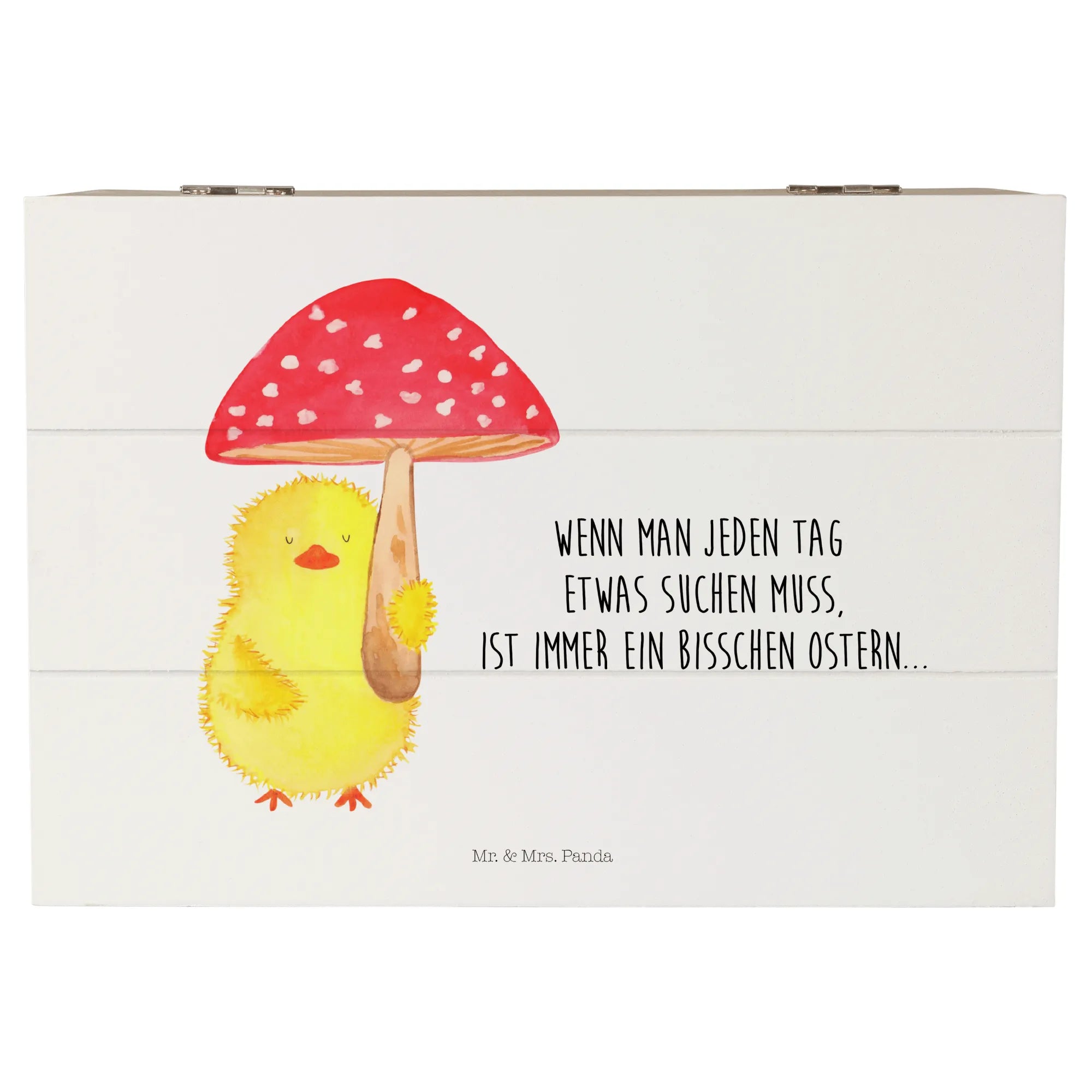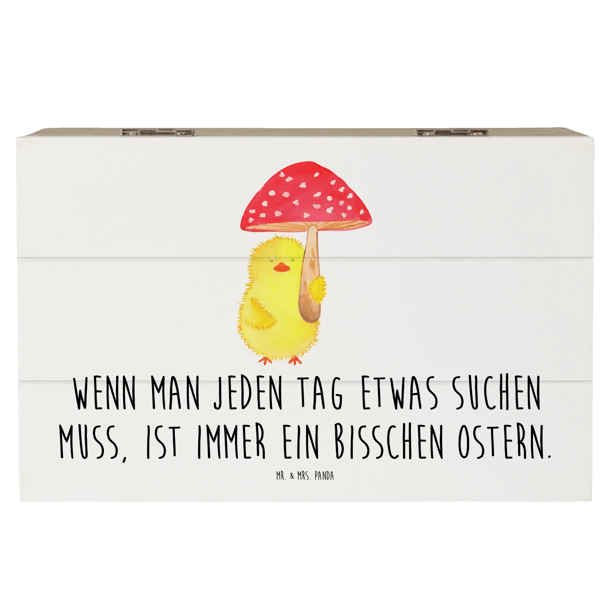 Du suchst das perfekte Geschenk für das Osterfest oder eine besondere Gelegenheit? Die wunderschöne Holzkiste mit dem süßen Küken Fliegenpilz-Motiv von Mr. & Mrs. Panda ist genau das richtige!