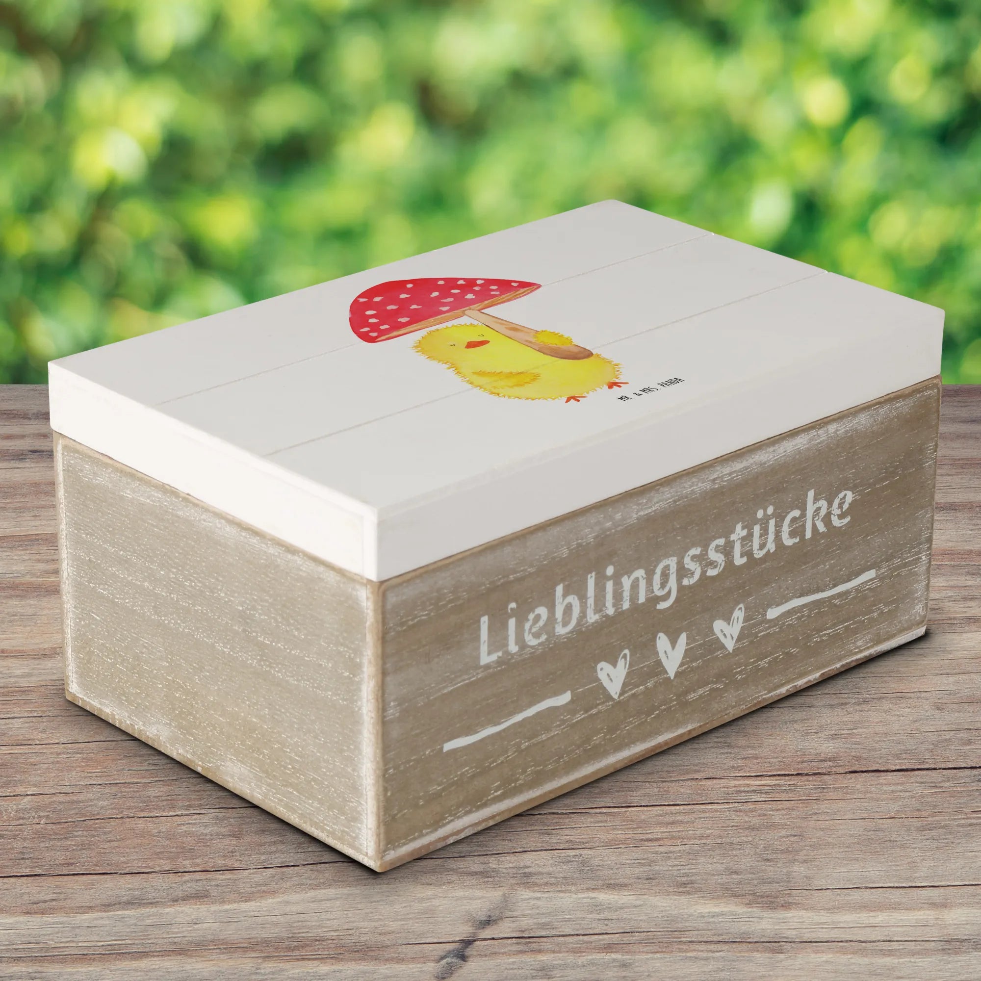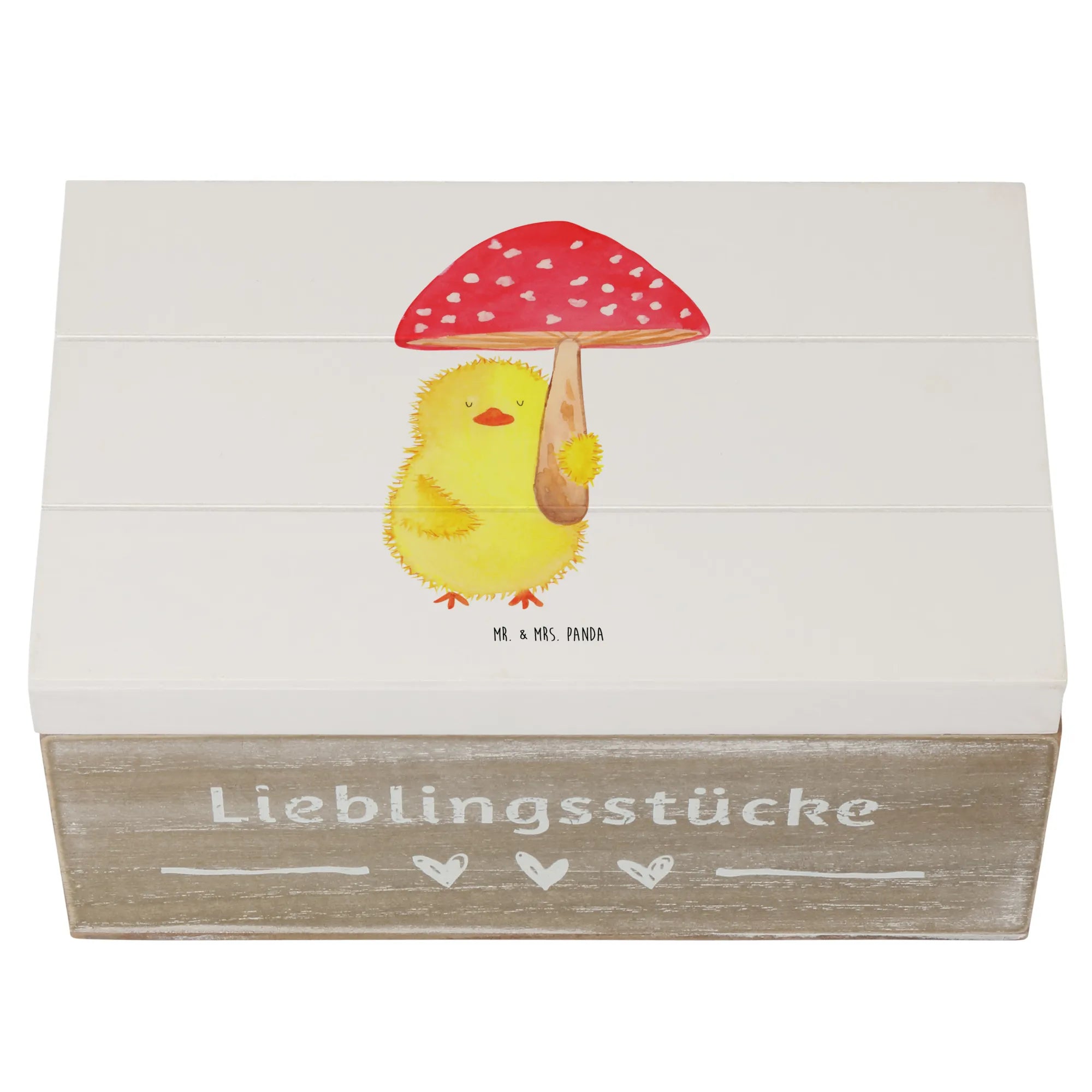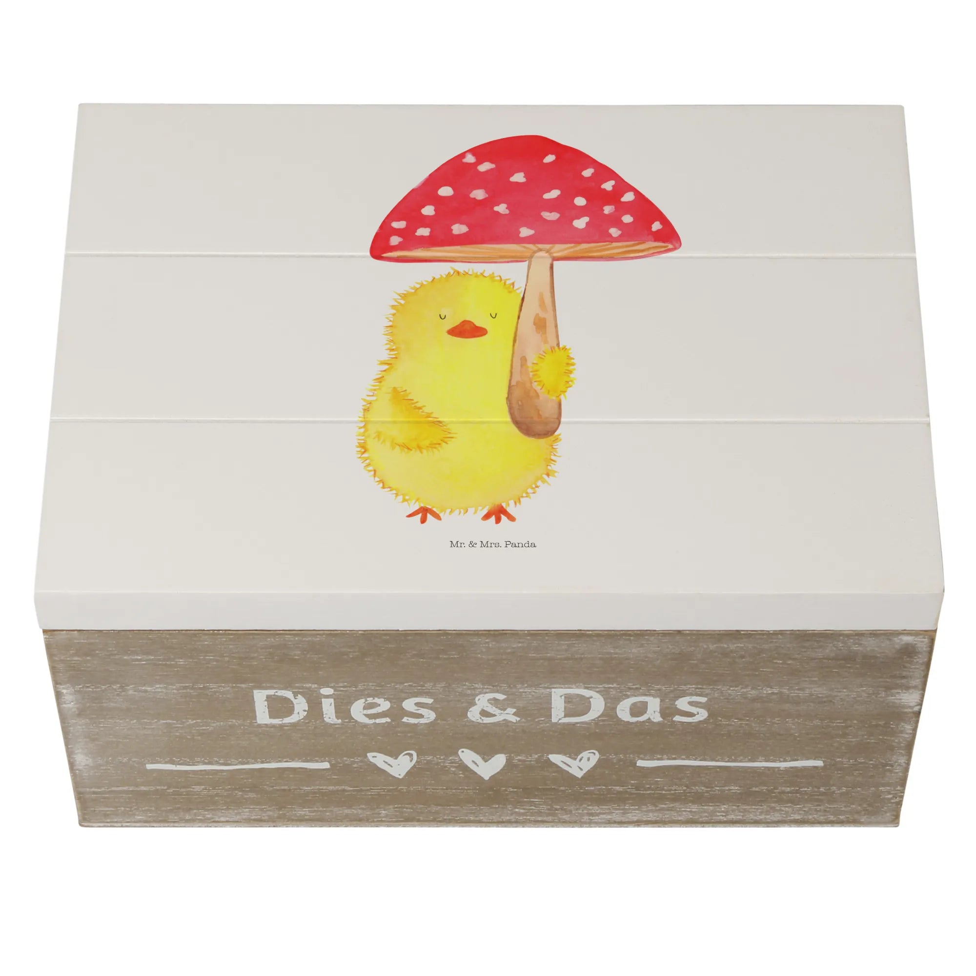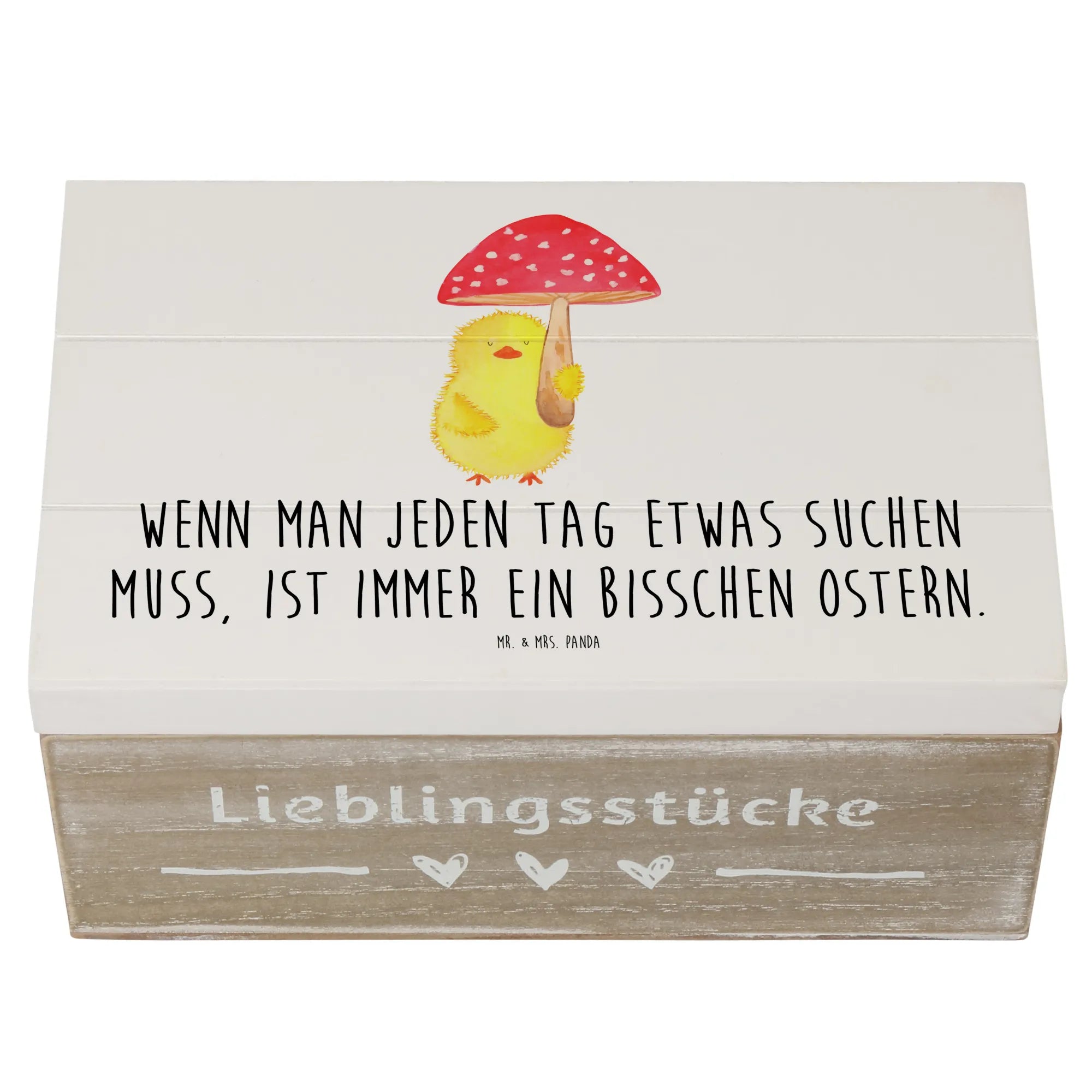 Du suchst das perfekte Geschenk für das Osterfest oder eine besondere Gelegenheit? Die wunderschöne Holzkiste mit dem süßen Küken Fliegenpilz-Motiv von Mr. & Mrs. Panda ist genau das richtige!