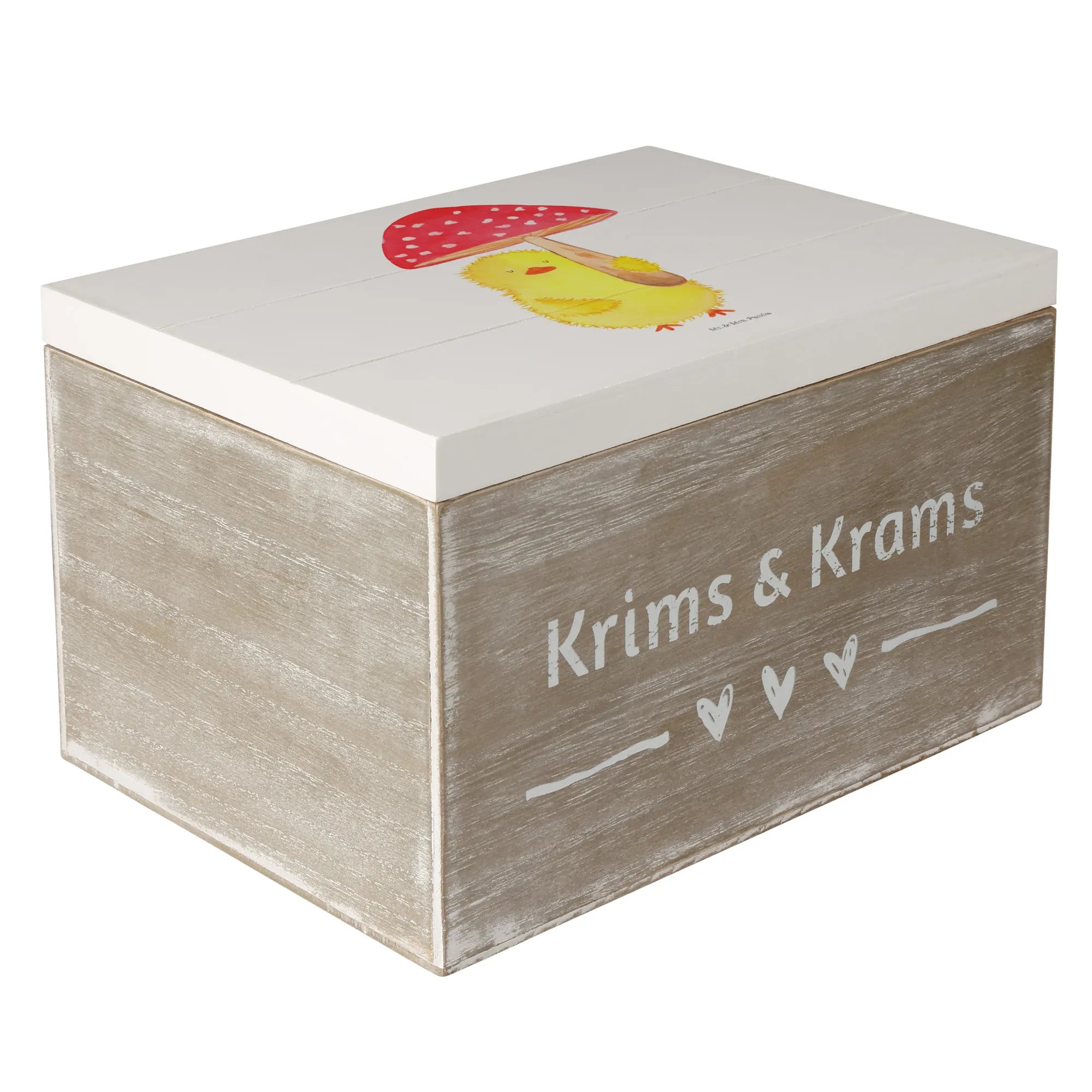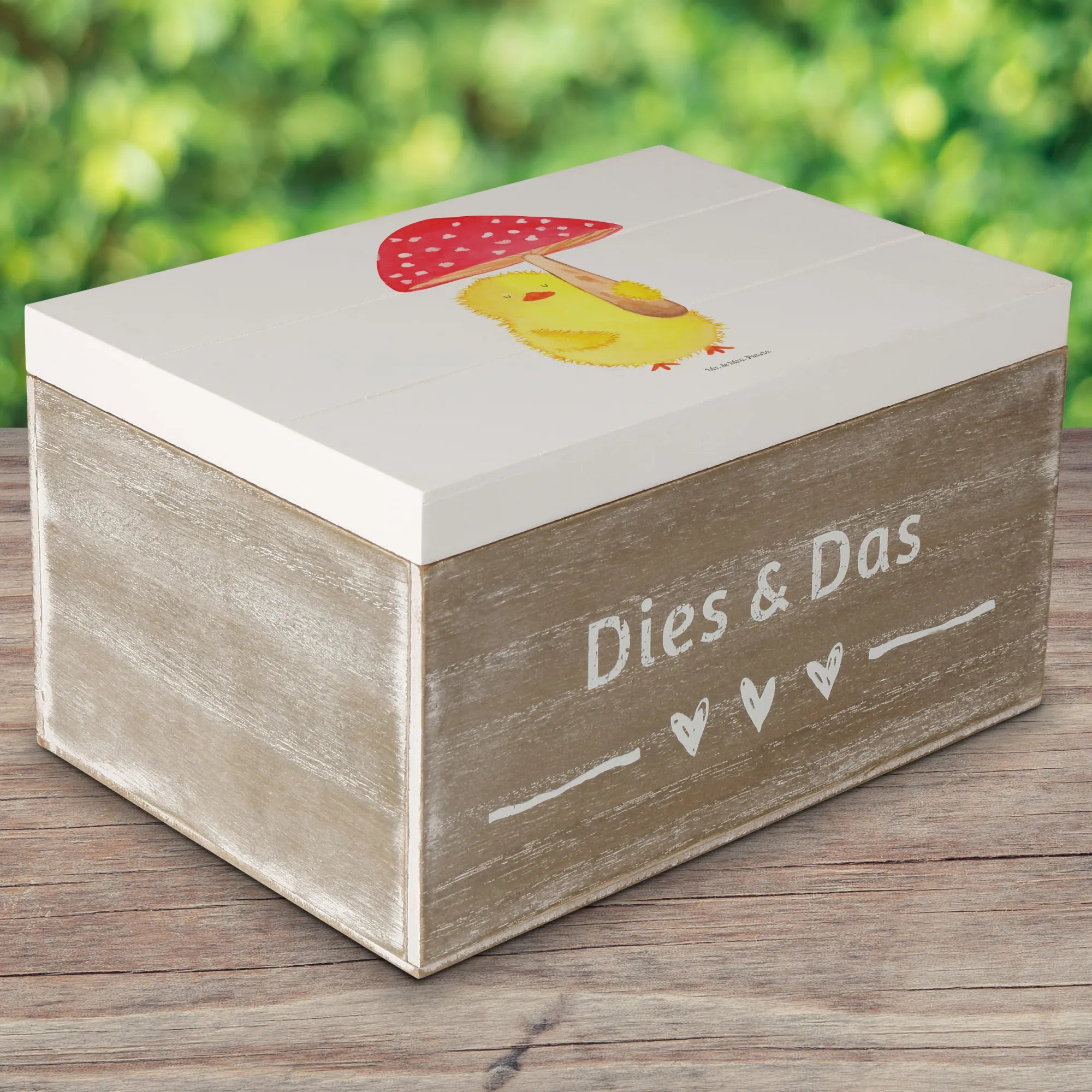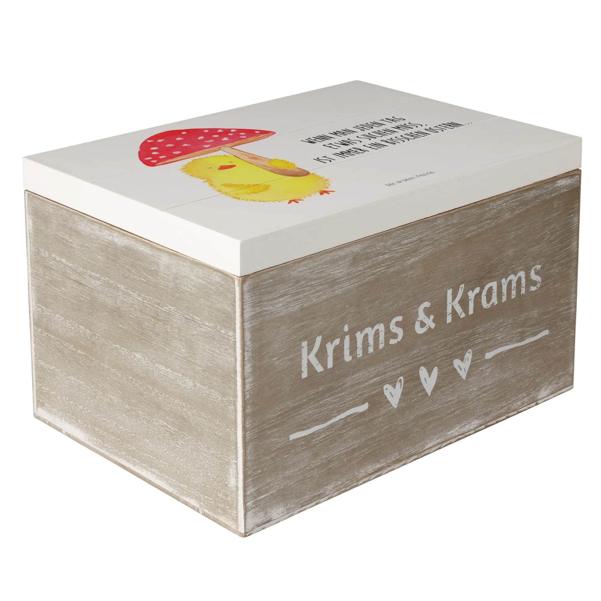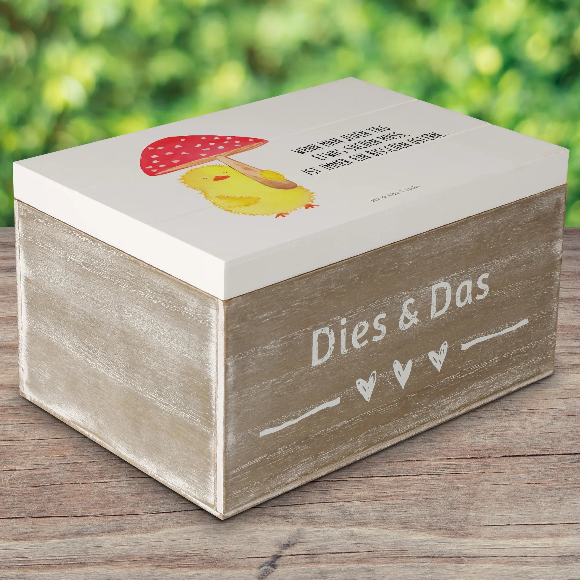 Du suchst das perfekte Geschenk für das Osterfest oder eine besondere Gelegenheit? Die wunderschöne Holzkiste mit dem süßen Küken Fliegenpilz-Motiv von Mr. & Mrs. Panda ist genau das richtige!
