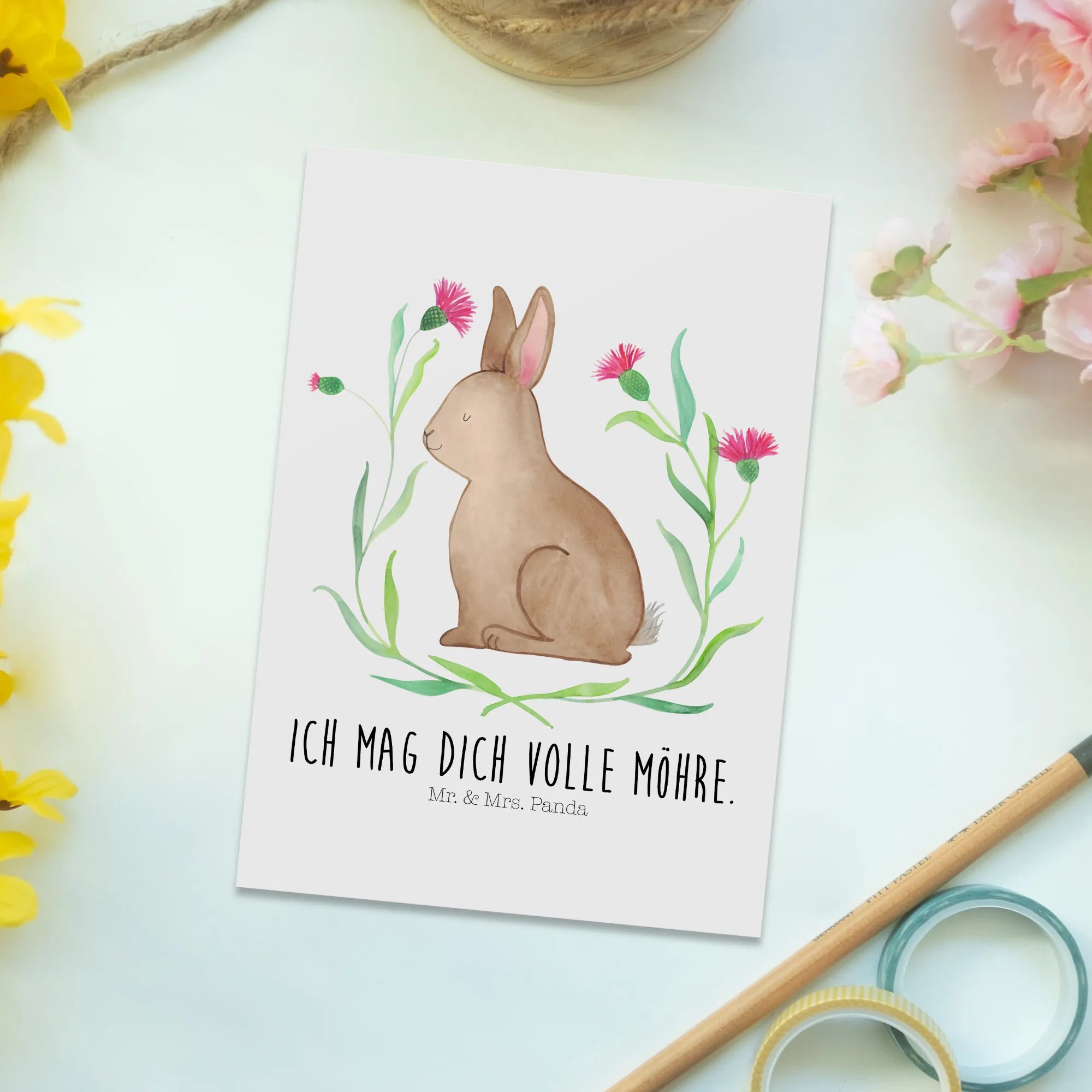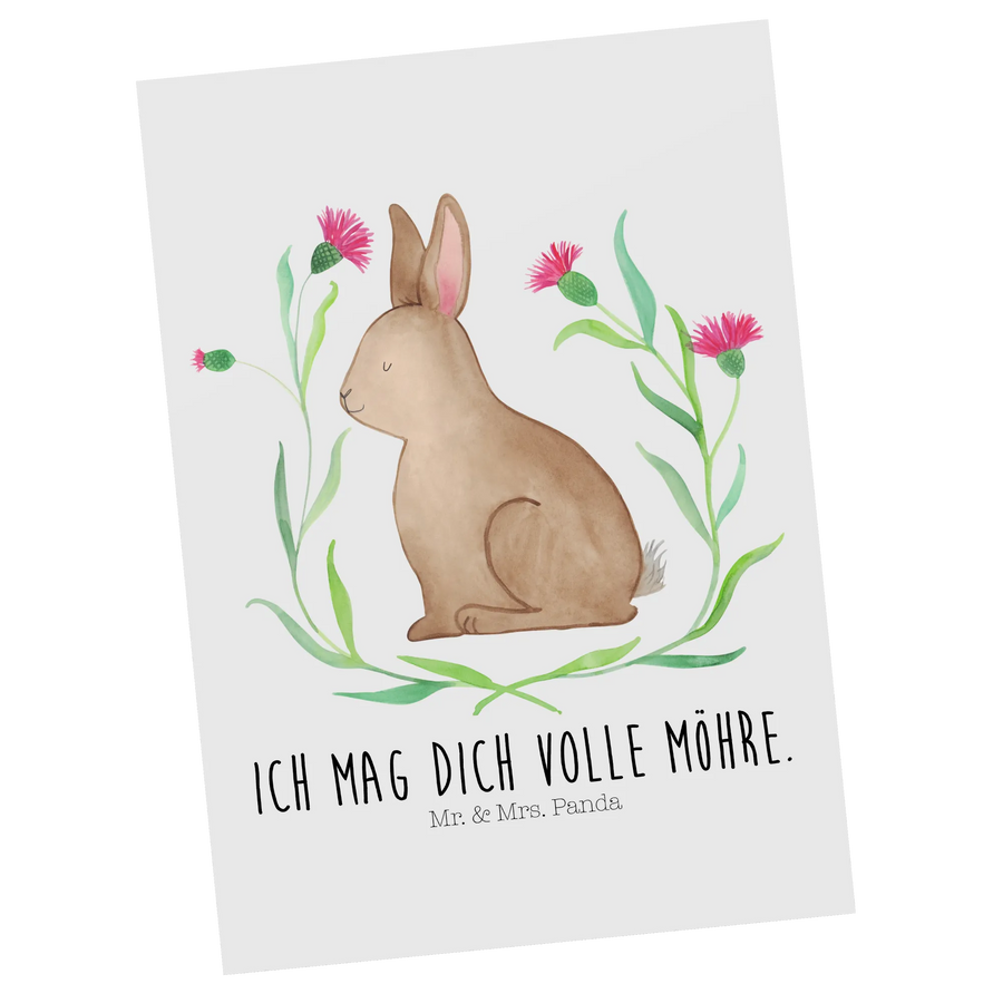 Die bezaubernde Postkarte mit dem sitzenden Hasen aus der Ostern-Kollektion von Mr. & Mrs. Panda ist der perfekte Ausdruck deiner Ostergrüße! Diese einzigartig bedruckte Karte, mit einem fröhlichen Bild eines kleinen Hasen, der glücklich zwischen bunten Blumen sitzt, wird deine Liebsten verzaubern.