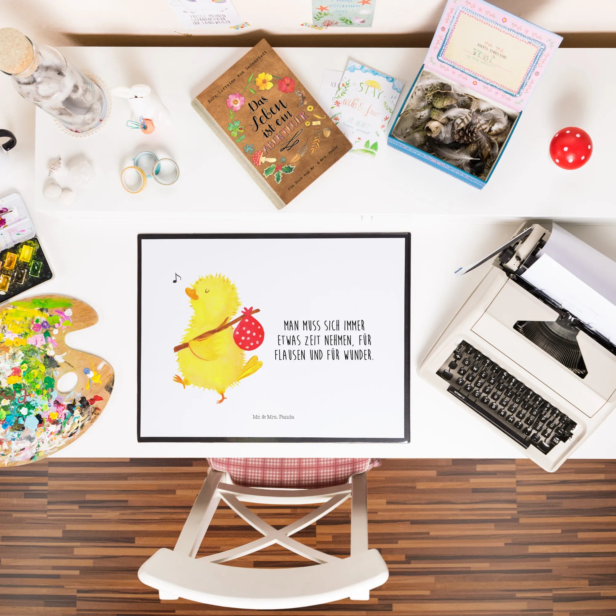 Verschenke die "Küken Wanderer" Schreibtischunterlage zu Ostern oder einfach als kleine Aufmerksamkeit an einen lieben Menschen. Sie ist das perfekte Ostergeschenk und bringt Freude und Liebe in jeden Haushalt. Mit dem Spruch „Man muss sich immer etwas Zeit Nehmen, für Flausen und für Wunder“ inspiriert sie dazu, die kleinen Dinge im Leben zu schätzen.