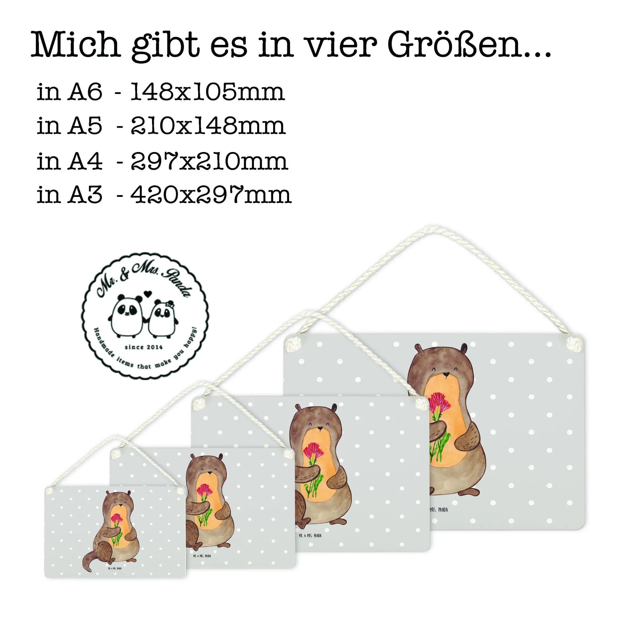 Das Deko Schild "Otter Blumenstrauß" von Mr. & Mrs. Panda ist das perfekte Geschenk für alle Otter-Fans und Liebhaber niedlicher Dekoration. Der süße kleine Otter hält stolz einen kunterbunten Blumenstrauß in seinen Pfötchen und schaut dich mit einem fröhlichen Gesichtsausdruck an. Dieses wunderschöne Wandschild bringt nicht nur Farbe in dein Zuhause, sondern verbreitet auch eine herzliche, positive Atmosphäre. Egal, ob du es an die Wand hängst oder an deiner Tür platzierst, es wird garantiert Köpfe drehen und für viele Lächeln sorgen!