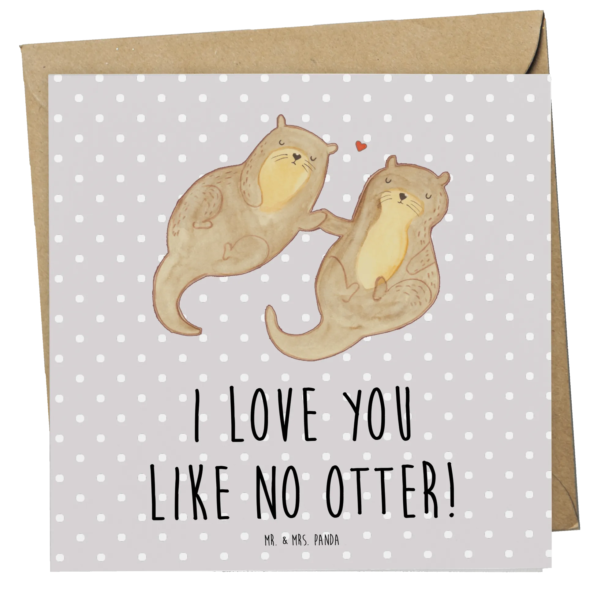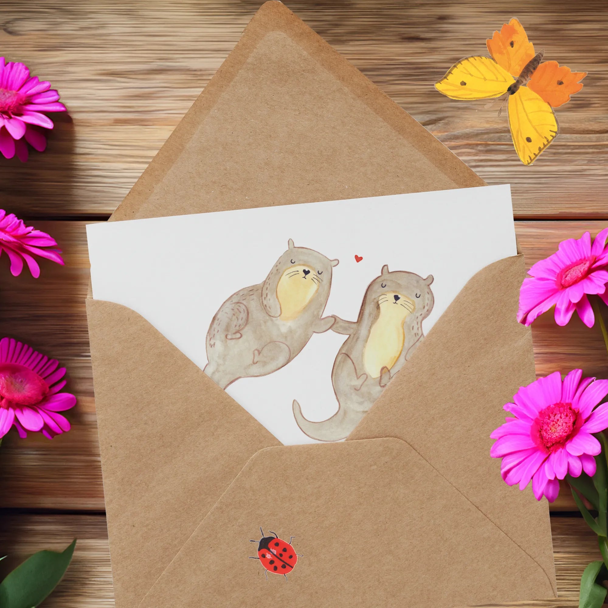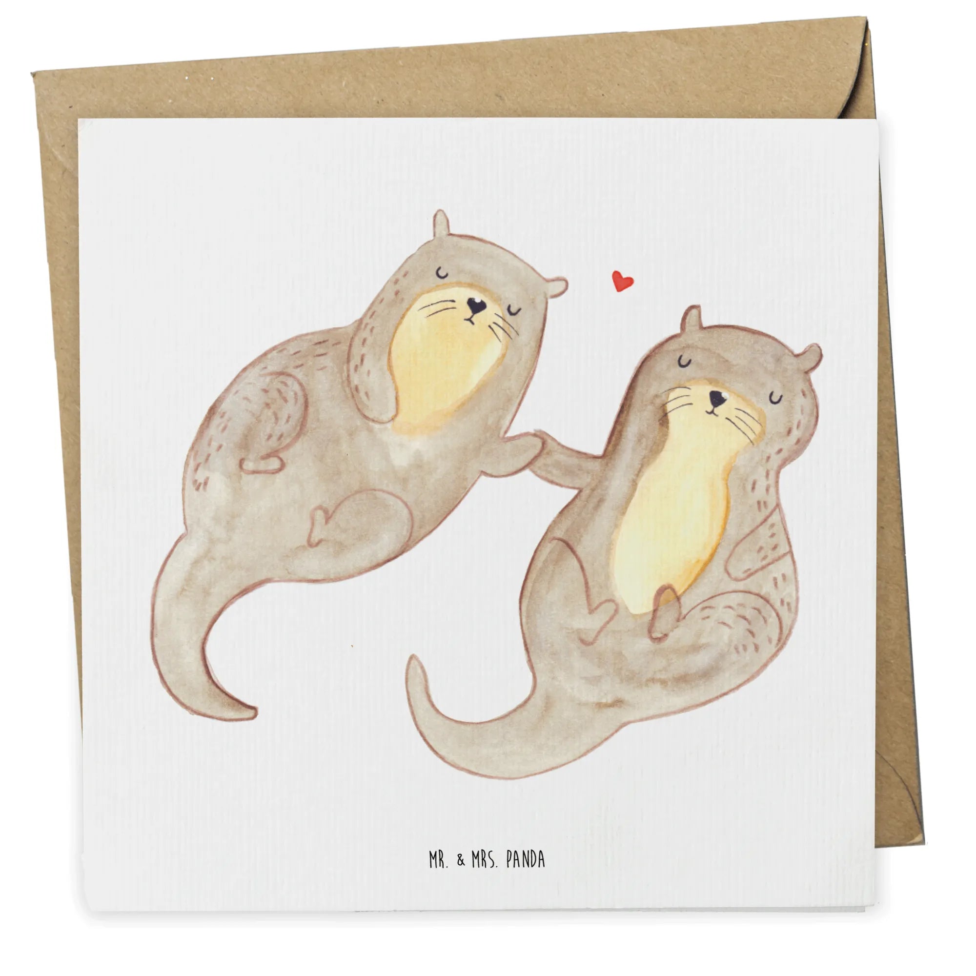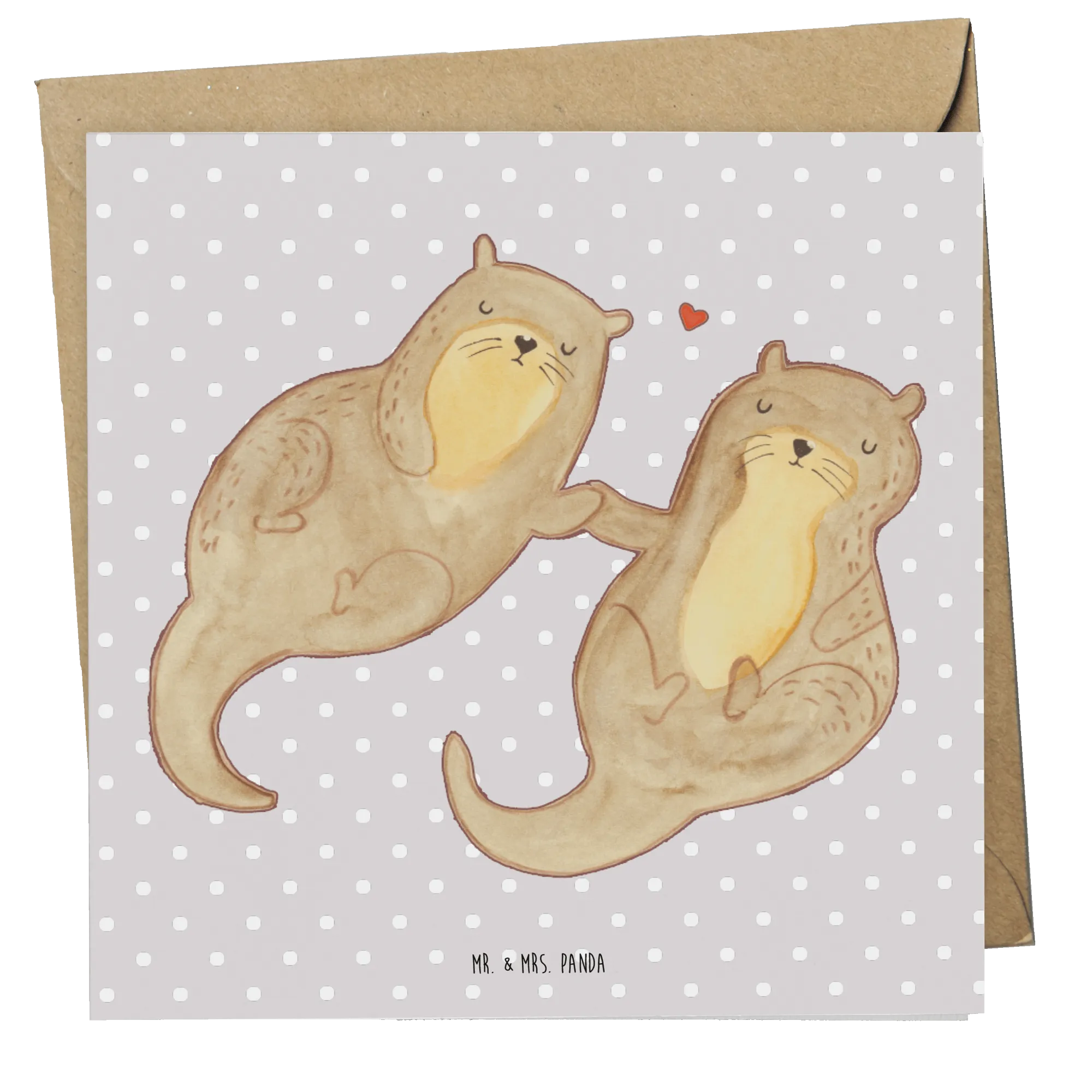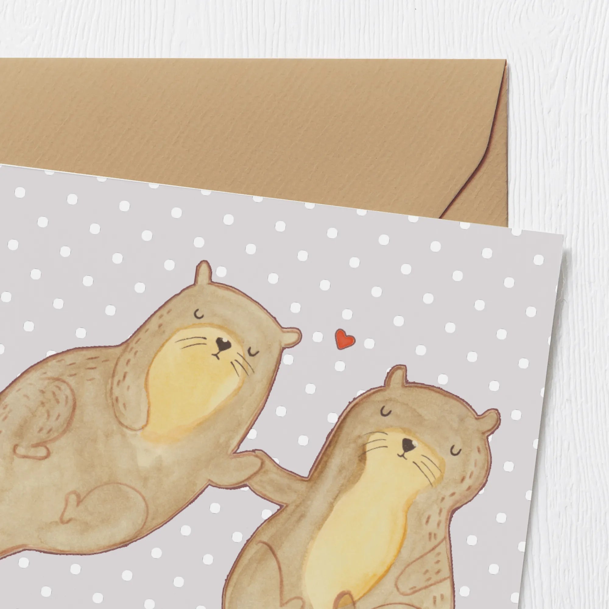 Entdecke die perfekte Grußkarte von Mr. & Mrs. Panda mit einem liebevollen Motiv von zwei händchenhaltenden Ottern. Diese Deluxe Karte ist nicht nur ein einfacher Gruß, sondern ein Stück Herz, das du teilen kannst!