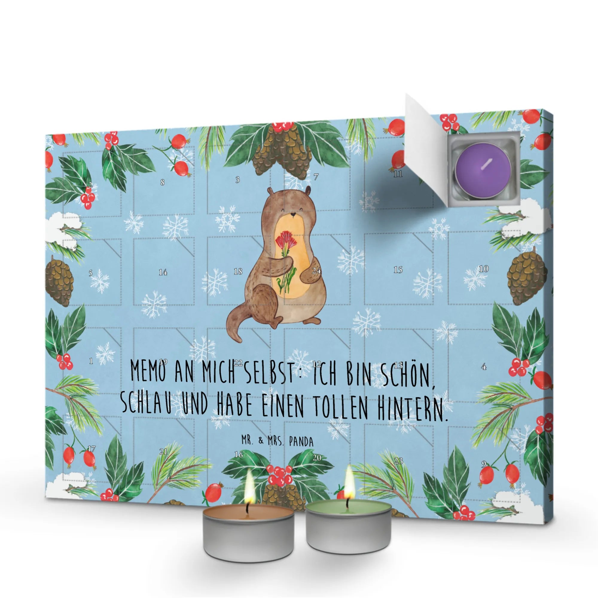 Der Duftkerzen Adventskalender mit dem zauberhaften Motiv 'Otter Blumenstrauß' von Mr. & Mrs. Panda ist das perfekte Geschenk für alle, die die Weihnachtszeit liebevoll und duftend erleben möchten.