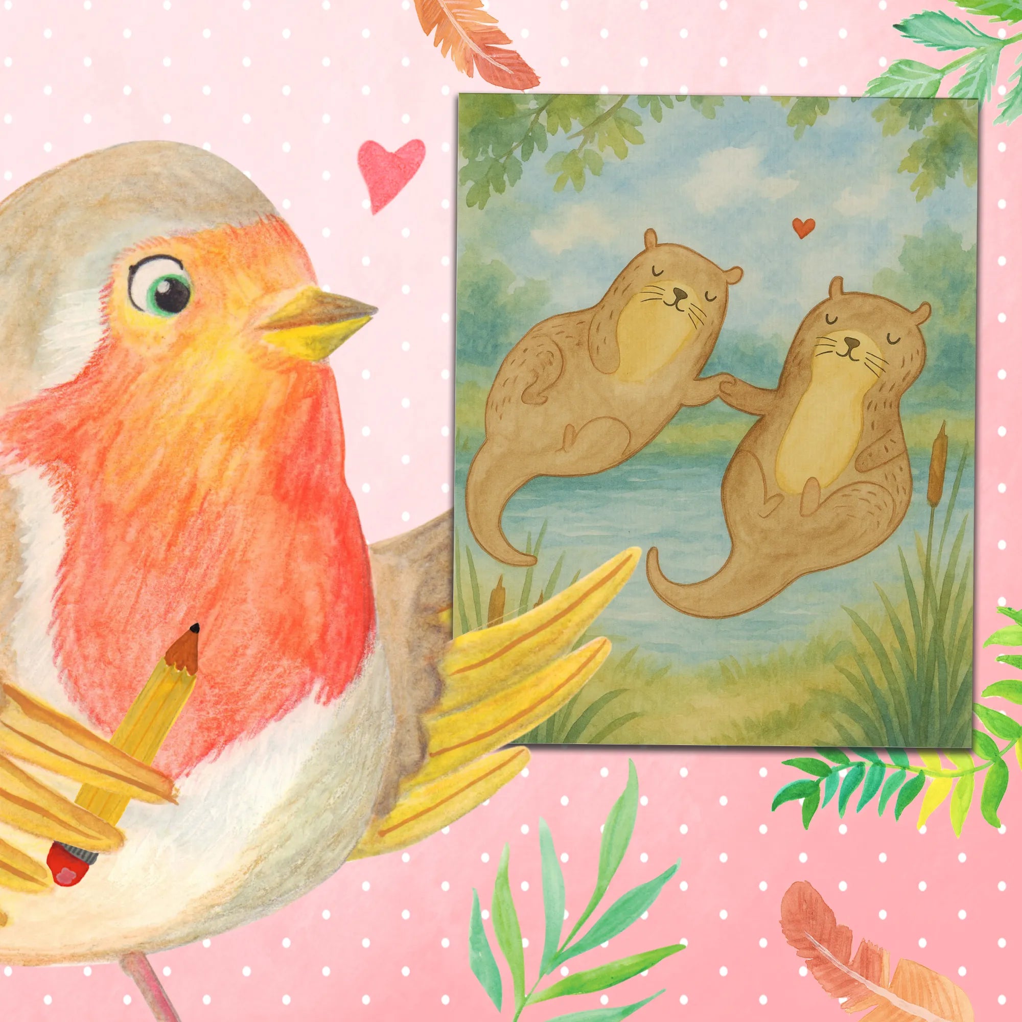 Zwei Otter und zwei Seeotter in einem liebevollen Motiv: Sie liegen auf dem Rücken, halten Händchen und zeigen, wie schön Verbundenheit aussehen kann. Die Kombination von flauschigen Ottern und den charakteristischen Merkmalen der Seeotter macht das Motiv besonders charmant. Es erzählt von kleinen Ritualen, von gemeinsamem Schweben im Wasser und vom Glück, jemanden zu haben, an den man sich anlehnen kann.
