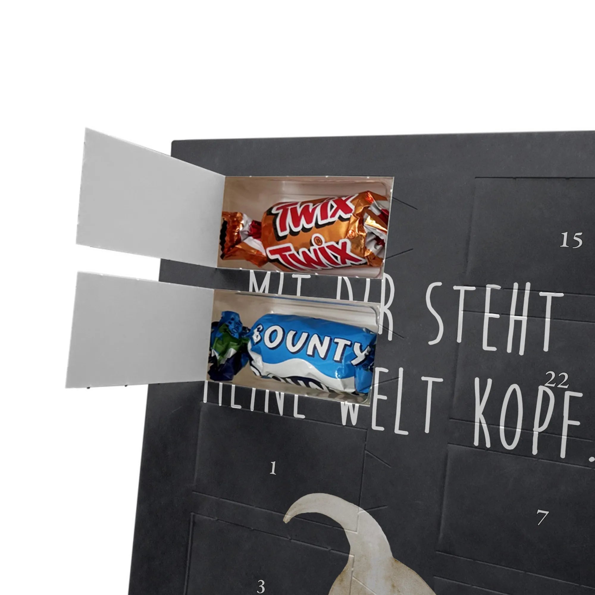 Charmanter Personalisierter Adventskalender mit Schoko-Foto von Mr. & Mrs. Panda – eine liebevolle Art, die Adventszeit zu personalisieren. Der Kalender ist mit den typischen Mr. & Mrs. Panda Motiven und herzlichen Sprüchen bedruckt; du kannst die Vorderseite mit deinem Lieblingsfoto gestalten. Achte auf eine hohe Auflösung deines Fotos, damit das Druckbild schön scharf wird, und kontrolliere den Bildausschnitt, damit keine wichtigen Details verloren gehen. Bitte lade nur Bilder hoch, für die du die Bildrechte besitzt oder eine Erlaubnis zur Nutzung vorliegt. Die Verarbeitung ist hochwertig: brillante Druckqualität, seidenmatte Oberflächenveredelung und bedruckte Seitenflächen für ein rundes Design. Maße: 325 mm x 225 mm x 27 mm. Der Kalender kann aufgehängt oder aufgestellt werden – ganz nach Belieben. Wichtig: Die Fotos werden nicht nachbearbeitet oder zugeschnitten; personalisierte Foto-Artikel sind vom Widerruf ausgenommen. Gefüllt ist der Adventskalender mit Celebrations Schokolade – 24 feine Füllungen in 8 verschiedenen Sorten (Maltesers, Mars, Snickers, Twix, Milky Way, Bounty, Galaxy, Galaxy Caramel). Ein persönliches Geschenk, das Erinnerungen und Genuss wunderbar verbindet.