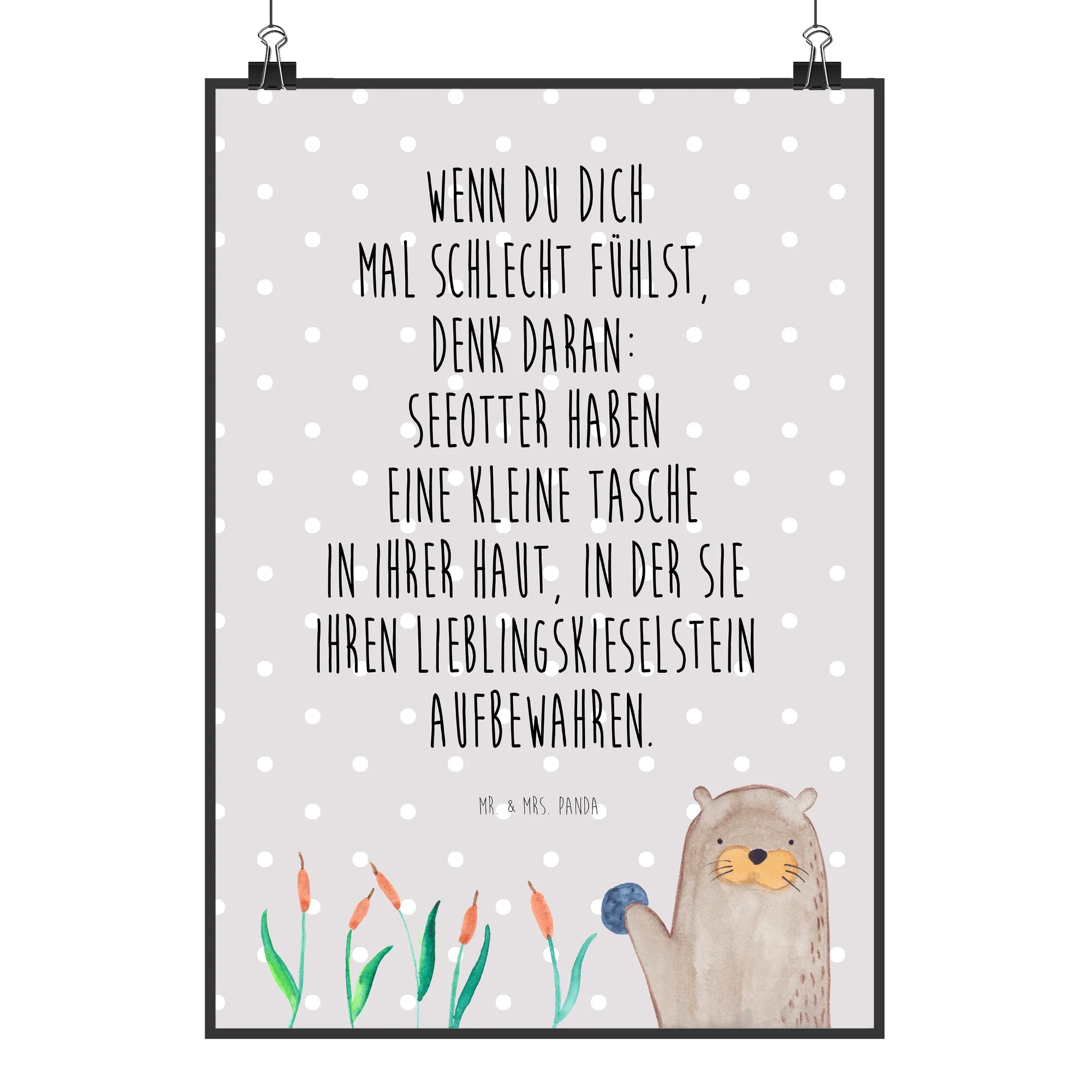 Wenn du dich mal schlecht fühlst, denk daran: Seeotter haben eine kleine Tasche in ihrer Haut, in der sie ihren Lieblingskieselstein aufbewahren. Diese liebevolle Botschaft wird weitergetragen durch das handgezeichnete Design von Mrs. Panda. Das Poster ist in einem lebendigen grau-pastell Hintergrund gestaltet, der sich wunderbar in jedes Kinderzimmer, Klassenzimmer oder Schlafzimmer einfügt.