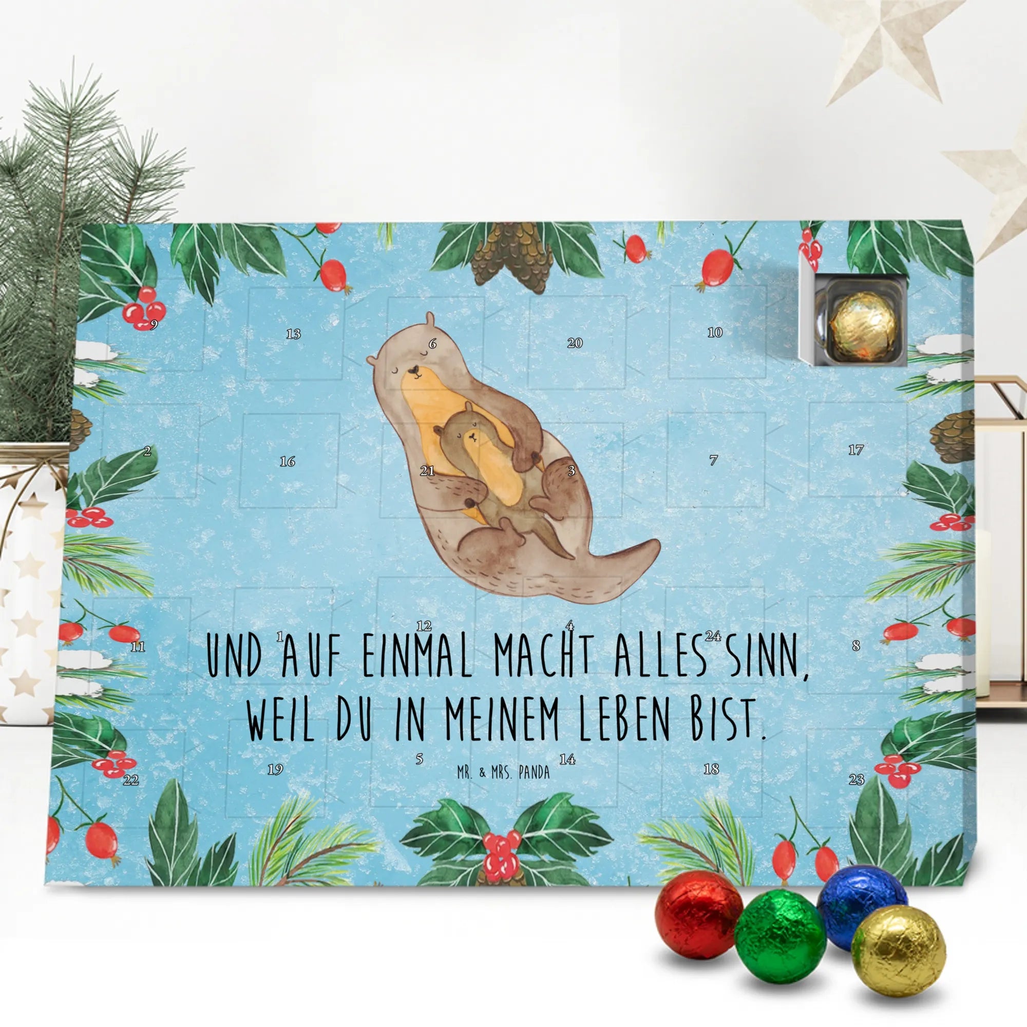 Wunderschöner Adventskalender mit Schokolade von Mr. & Mrs. Panda – für alle, die Advent und Design lieben. Dieser Adventskalender mit Schokolade ist liebevoll bedruckt mit wunderschönen Motiven & Sprüchen von Mr. & Mrs. Panda und ist nicht personalisierbar, aber mit viel Liebe zum Detail gefertigt. Brillante Druckqualität mit seidenmatter Oberflächenveredelung sorgt für einen edlen Look, und die bedruckten Seitenflächen geben dem Kalender eine besondere Optik. Maße: 233 mm x 178 mm x 24 mm. Dank seiner stabilen Verarbeitung kannst du ihn aufstellen oder ganz einfach aufhängen – Besonderheit: kann aufgehängt oder aufgestellt werden. Gefüllt mit MARKENNAMEN Schokolade und leckeren Schokoladenkugeln, bringt er jeden Tag ein kleines Glückserlebnis. Wichtige Hinweise: (Kann Spuren von Haselnüssen, Mandeln, Gluten und Soja enthalten!), bitte kühl und trocken lagern. Ob als Geschenk, Mitbringsel oder Adventsdeko – dieser Kalender zaubert ein Lächeln und sorgt für gemütliche Vorfreude. Viel Freude beim Entdecken der süßen Überraschungen wünscht dir Mr. & Mrs. Panda!