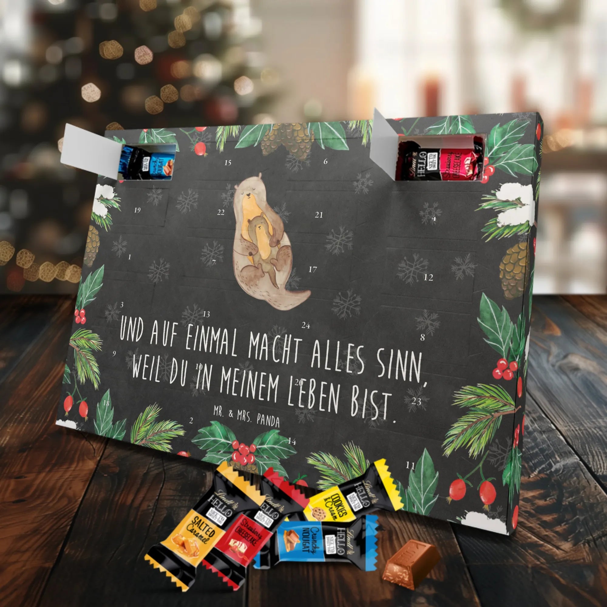 Wunderschöner Schoko Adventskalender von Mr. & Mrs. Panda – perfekt, wenn du dir oder deinen Liebsten die Adventszeit mit süßen Überraschungen versüßen willst. Unser liebevoll gestalteter Schokoladen Adventskalender ist bedruckt mit bezaubernden Motiven und frechen Sprüchen von Mr. & Mrs. Panda und sorgt jeden Tag für ein Lächeln. Der Kalender ist nicht personalisierbar, dafür aber in brillanter Druckqualität mit seidenmatter Oberflächenveredelung gefertigt. Auch die Seitenflächen sind vollständig bedruckt, was dem Design noch mehr Tiefe verleiht. Maße: 325 mm x 225 mm x 27 mm. Besonders praktisch: Der Kalender kann aufgehängt oder aufgestellt werden – so findest du immer den idealen Platz bei dir zu Hause. Gefüllt mit Lindt Hello Schokolade: 24 einzeln verpackte Schokoladen Mini Sticks in vier verschiedenen Sorten – Karamell-Schokoladenkuchen, Kekse, Knuspriger Nougat und Erdbeer-Cheesecake. Zutaten und Allergene findest du auf der Verpackung; wichtige Hinweise: enthält Milcheiweiß, Milchzucker, Soja, Weizen und Haselnüsse, kann Mandeln und andere Schalenfrüchte enthalten. Dieser Adventskalender ist eine liebevolle Geschenkidee für Freunde, Familie und alle Schoko-Fans, die jeden Tag bis Weihnachten mit feinem Schoko-Genuss feiern möchten.