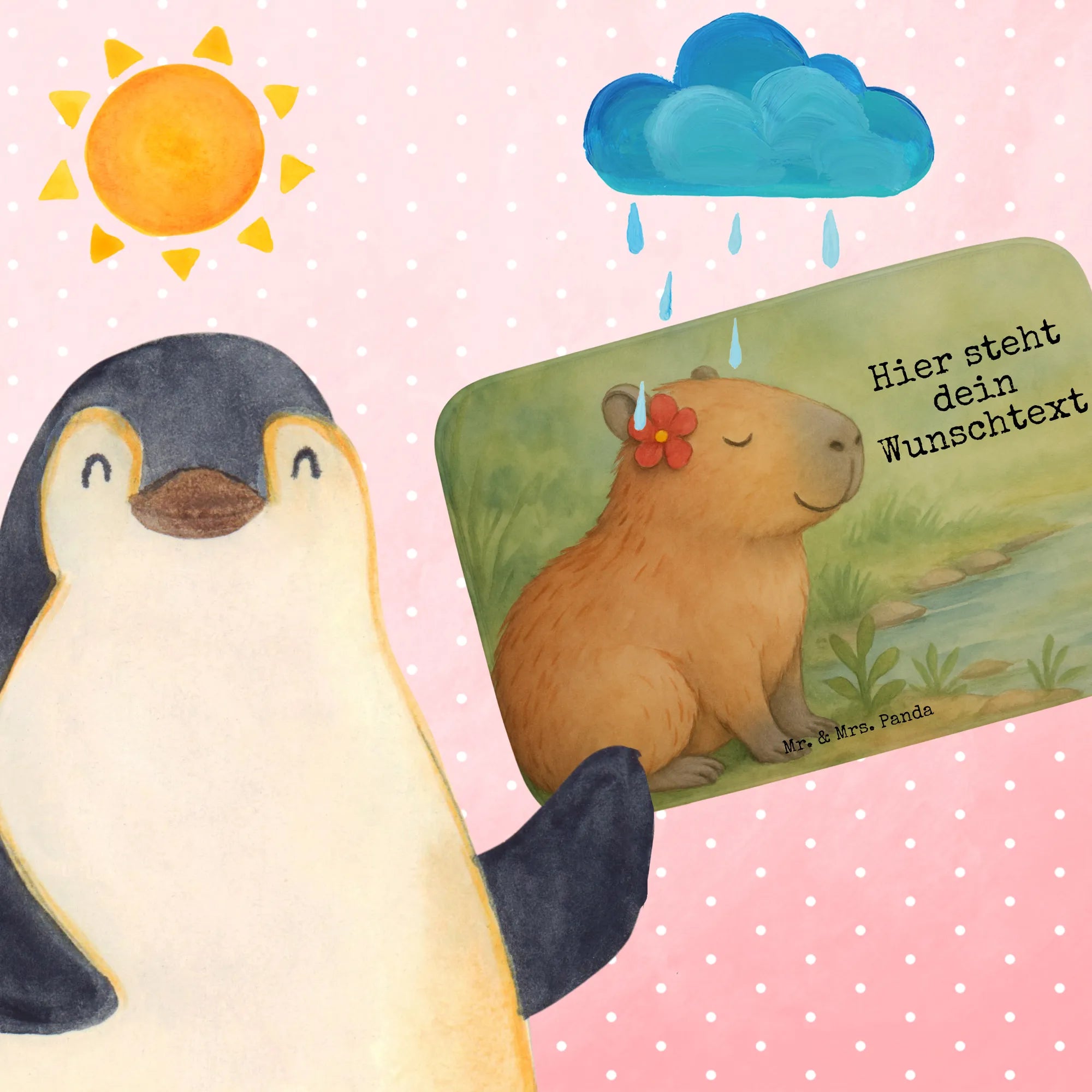 In der Welt von Mr. & Mrs. Panda finden sich immer wieder kleine Oasen der Freude und Ruhe, und das Motiv 'Capybara Blume' ist eine solche Oase. Das Bild, das ein ruhendes Capybara zeigt – entspannt und mit einem zufriedenen Lächeln, das Glück ausstrahlt – ist eine Einladung, innezuhalten und die kleine Freuden des Lebens zu erkennen. Die rote Blume mit der gelben Mitte, die das Capybara schmückt, ist ein Farbtupfer, der Optimismus und Lebensfreude verkörpert. Über dem Capybara schwebt ein kleines Herz, ein Symbol für Liebe und Wärme, das die liebevolle Atmosphäre dieses Motives perfekt unterstreicht. Das Motiv ist nicht nur eine Hommage an die Entspannung und die Suche nach dem persönlichen Glück, sondern auch eine Anleitung zum Glücklichsein, eingebettet in die sanften Farben und die Harmonie des Bildes. Lassen Sie sich von diesem Motiv inspirieren und folgen Sie Ihrem Herzen auf dem Weg zu den kleinen Glücksmomenten im Leben.