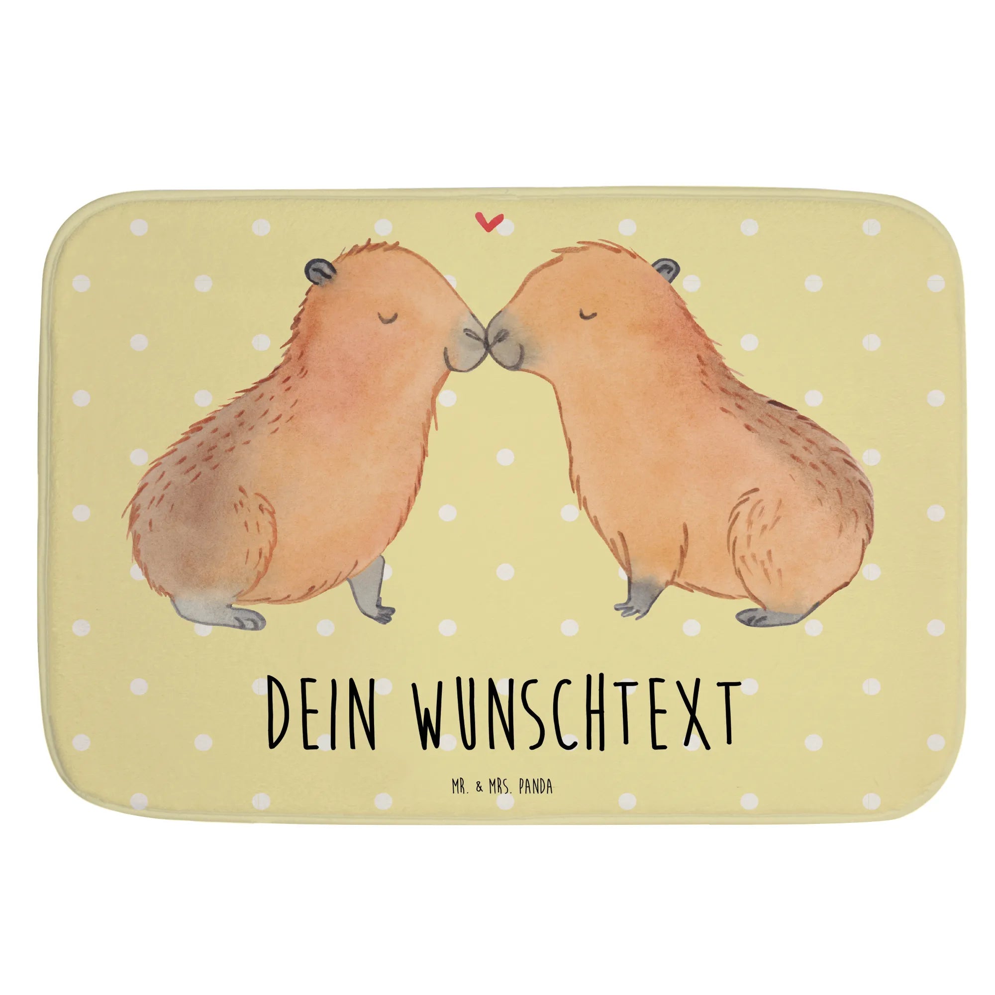Die süßen Capybaras mit den geschlossenen Augen und dem kleinen rotem Herz darüber strahlen pure Zuneigung aus. Durch die Möglichkeit, die Badematte mit deinem Wunschnamen zu personalisieren, wird das Geschenk noch individueller und persönlicher.