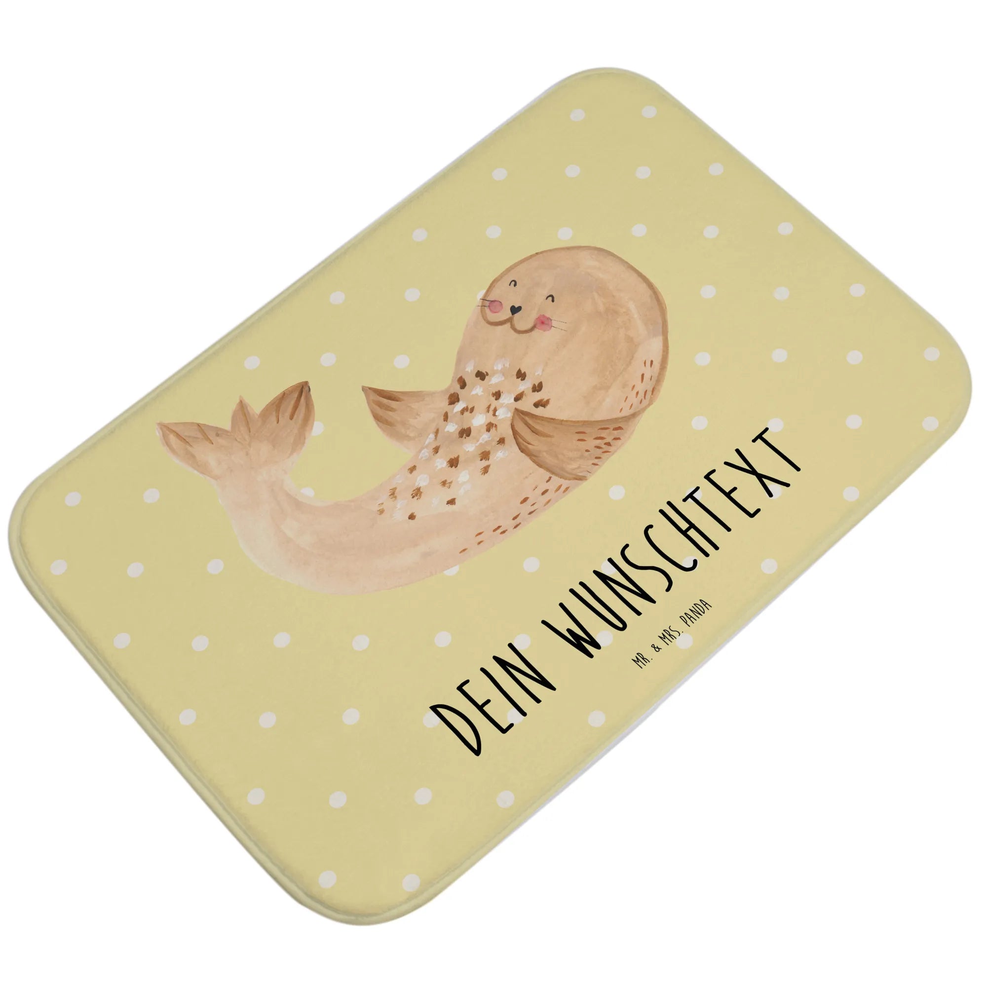 Hol dir mit unserem personalisierten Badvorleger von Mr. & Mrs. Panda ein Stück Persönlichkeit in dein Badezimmer! Er hat die perfekten Maße von 590 mm x 400 mm und wird mit zauberhaften Motiven und deinem gewünschten Text bedruckt. Der Badteppich aus flauschiger Premium Kunstfaser gibt deinem Badezimmer nicht nur eine tolle Optik, sondern sorgt durch die rutschfeste Gummibeschichtung auch für Sicherheit. Ideal für den Einsatz nach einem entspannenden Bad oder einer erfrischenden Dusche. Unsere liebevolle Gestaltung macht den Badvorleger zu einem ganz besonderen Geschenk, das für Freude sorgt. Zudem ist er besonders saugstark und pflegeleicht: Einfach bei 30°C in der Waschmaschine waschen und schon erstrahlt er wieder in neuem Glanz!