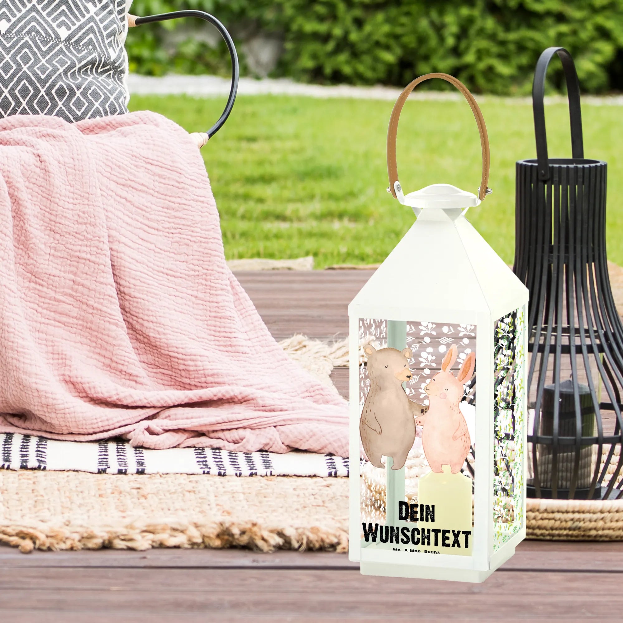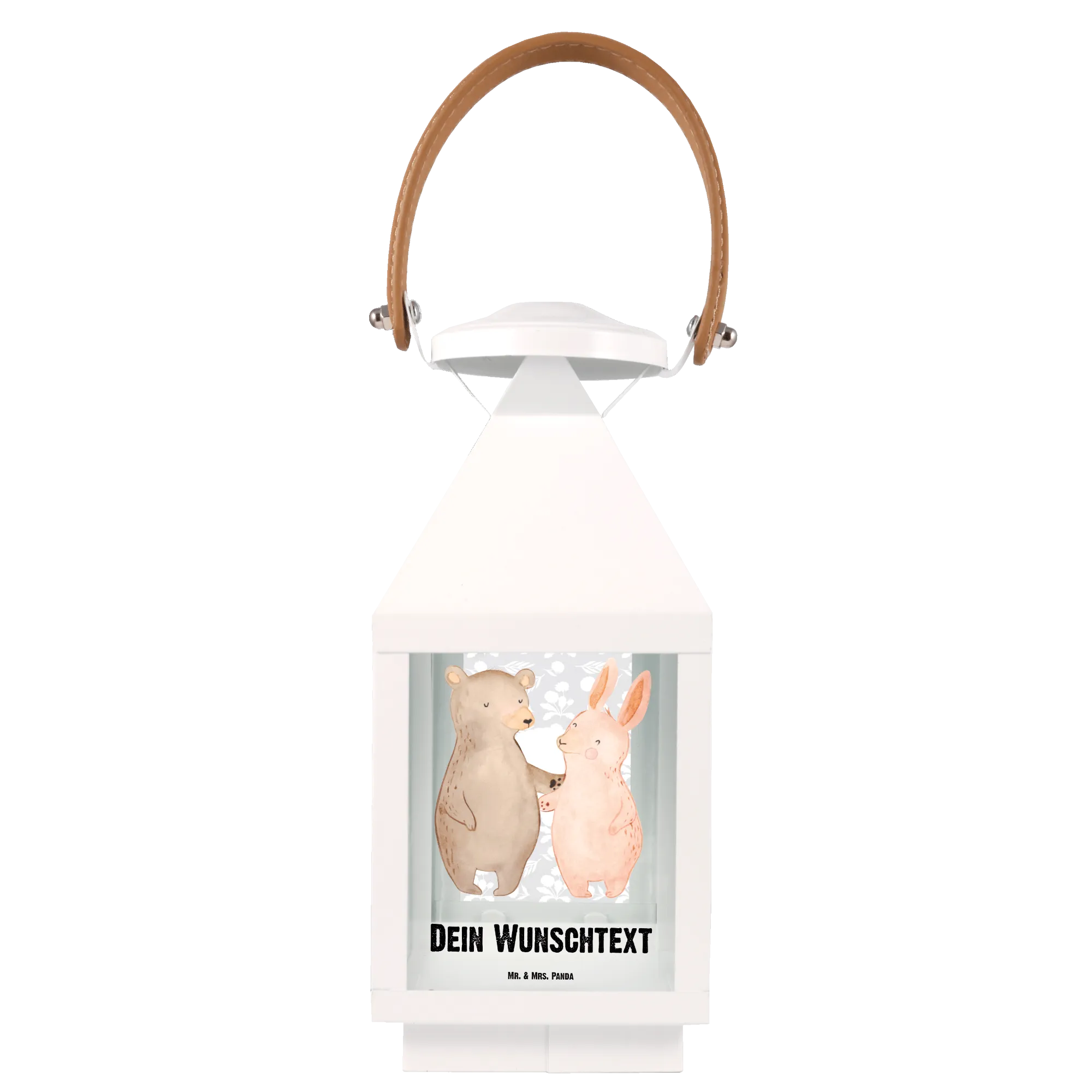 Die personalisierte Deko Laterne mit dem liebevollen Motiv "Bär und Hase Umarmen" ist der perfekte Begleiter für romantische Abende. Diese charmante Laterne aus hochwertigem, weiß lackiertem Metall und robustem Glas verleiht deinem Garten oder Balkon eine ganz besondere Atmosphäre.