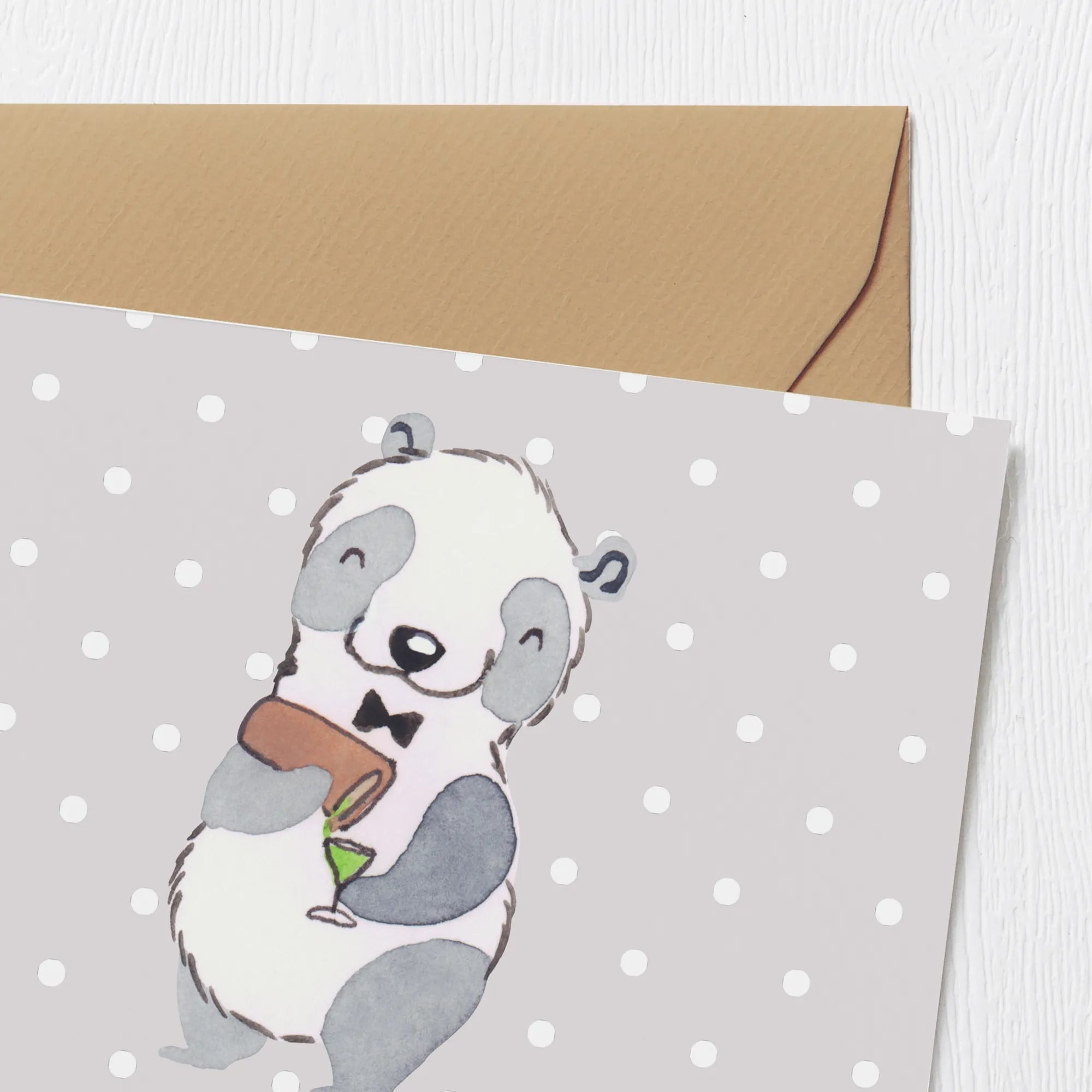 Die liebevoll illustrierte Karte mit dem charmanten Motiv zeigt einen süßen Panda, der Cocktails mixt, und ist mit dem Spruch "Du bist nur ein halber Mensch, wenn du kein Barkeeper bist" veredelt. Die Karte bietet viel Platz für persönliche Nachrichten und Glückwünsche, was sie ideal für feierliche Anlässe wie Geburtstage, Hochzeiten, berufliche Jubiläen oder als Dankeschön macht.