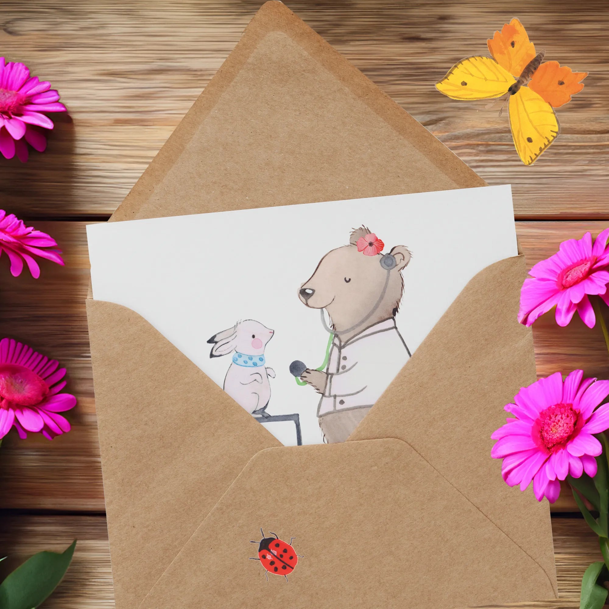 Die Karte hat eine glänzende Vorderseite und eine matte Innenseite, ideal zum Eintragen Deiner individuellen Glückwünsche. Du kannst sie wunderbar zu Anlässen wie Geburtstagen, Hochzeiten oder Jubiläen verschenken. Das süße Motiv zeigt einen Bären in einem weißen Kittel, der ein Kaninchen behandelt, und wird gewiss für ein Lächeln sorgen.