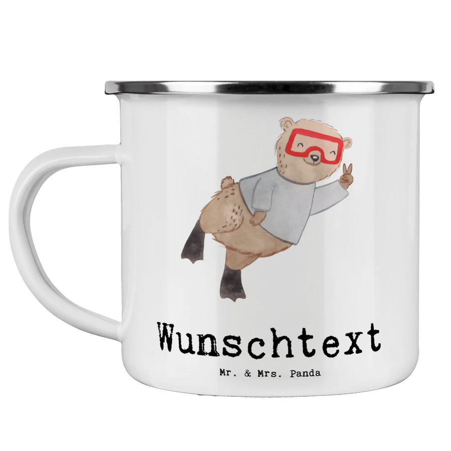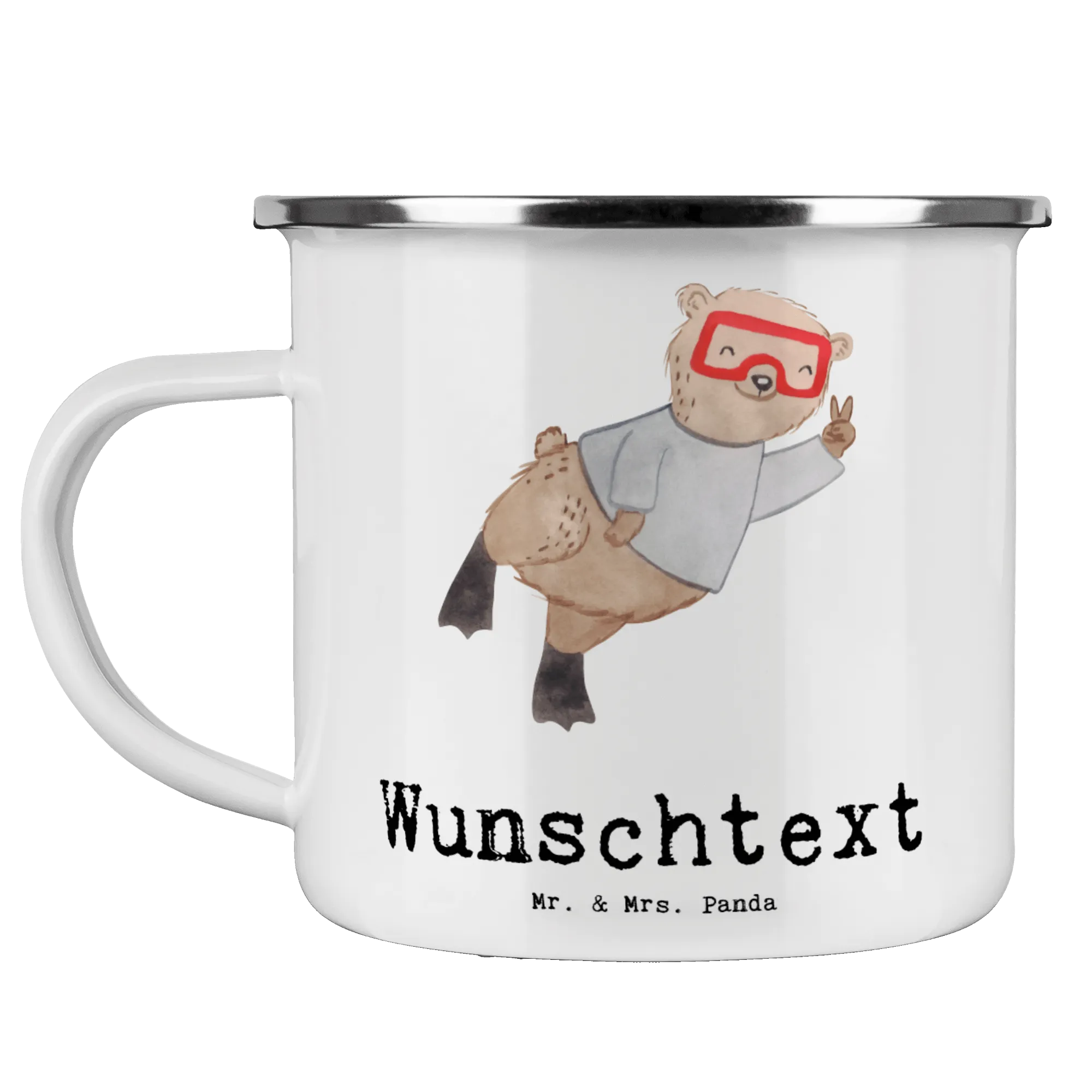 Mr. & Mrs. Panda Personalisierte Emaille Tasse „Bär Tauchen Tage“ – die perfekte Campingtasse für Taucher, Schnorchler und alle, die das Wasser lieben. 🐻🤿 Das liebevoll aquarellierte Motiv zeigt einen süßen Bären mit Taucherbrille und Flossen, kombiniert mit dem frechen Spruch: Es gibt schlechte Tage, und es gibt Tage, an denen ich tauche.