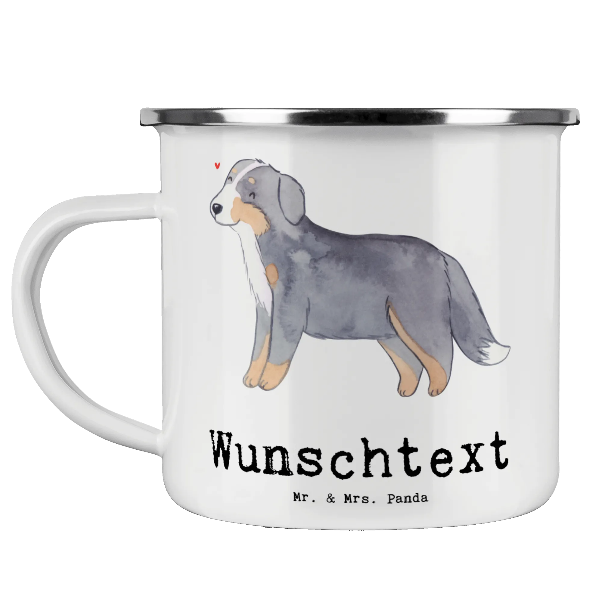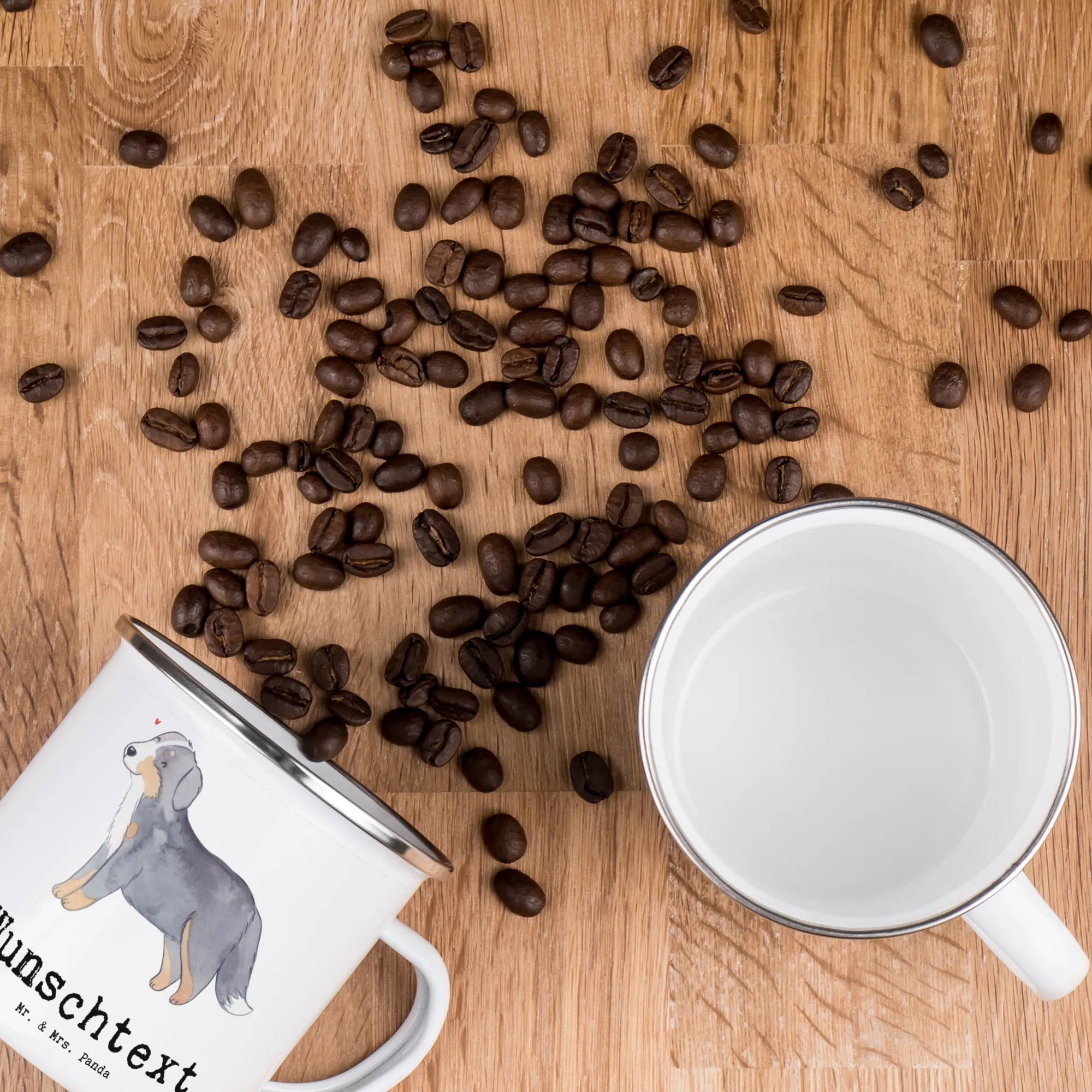 Du suchst das perfekte Geschenk für einen Hundeliebhaber? Dann ist unsere personalisierte Emaille Tasse mit dem Motiv "Mein Lebensretter ist ein Berner Sennenhund" genau das richtige für Dich!