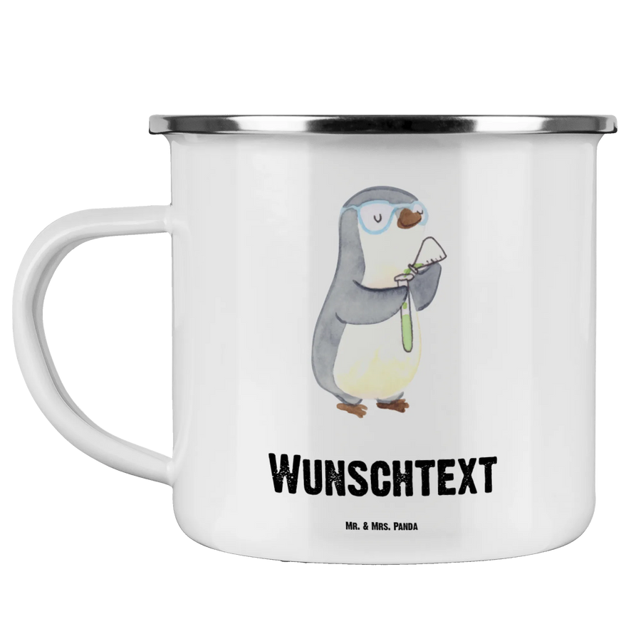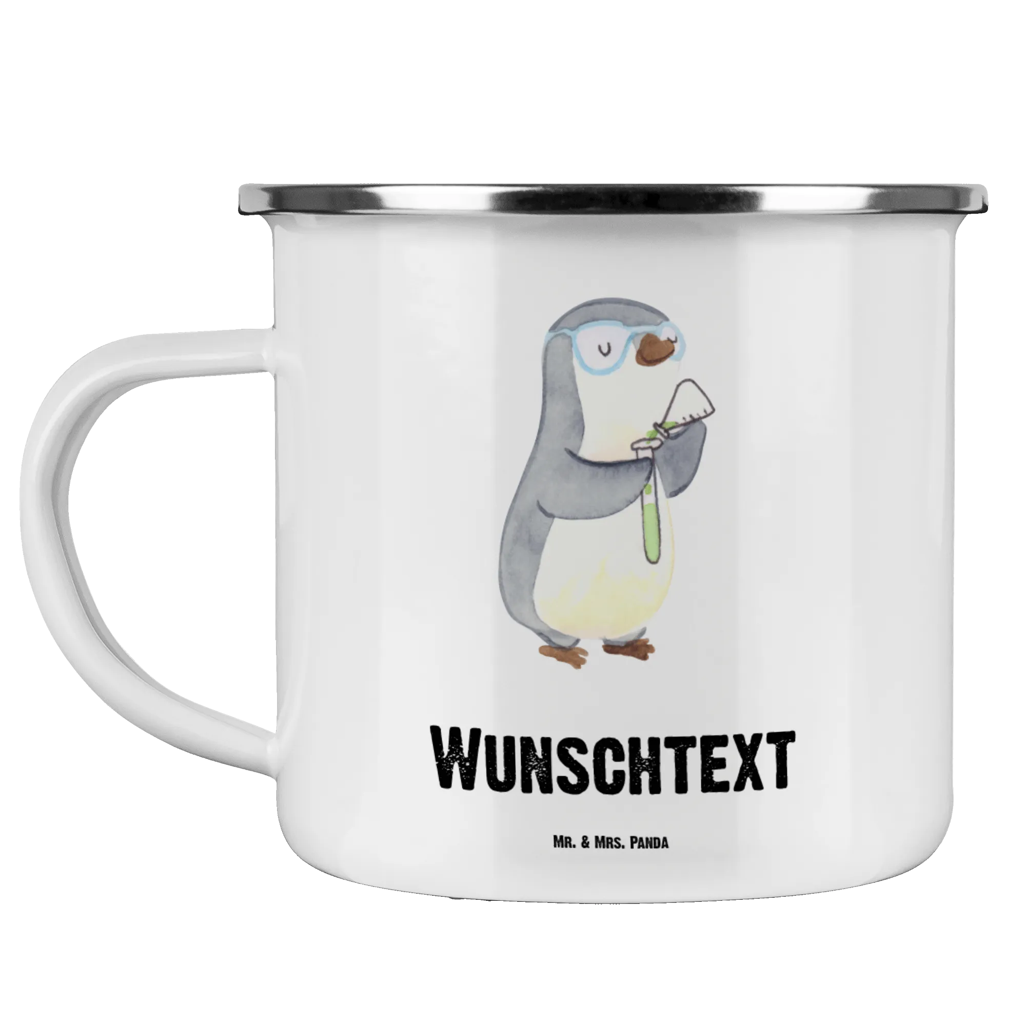 Die personalisierte Emaille Tasse "Chemiker mit Herz" von Mr. & Mrs. Panda ist das ideale Geschenk für jeden Chemiker, Wissenschaftler oder Laborant. Mit einem niedlichen Motiv eines kleinen Pinguins, der stolz sein Reagenzglas hält, bringt diese Tasse mit einem liebevollen Spruch "Du bist nur ein halber Mensch, wenn du kein Chemiker bist" Freude in jeden Arbeitsplatz.