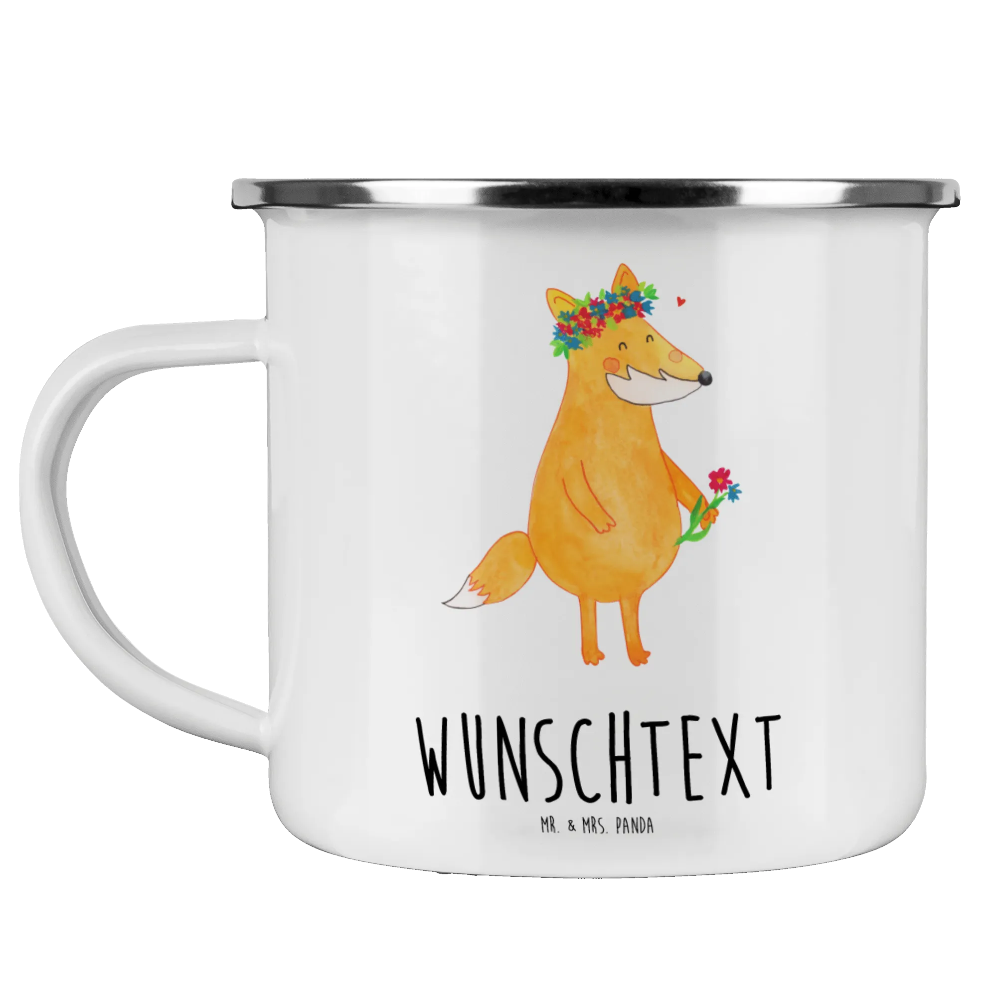 Entdecke die wunderbare, personalisierte Emaille Tasse "Fuchs Blumenliebe" von Mr. & Mrs. Panda! Diese bezaubernde Tasse ist nicht nur ein praktischer Begleiter für Deine Campingabenteuer, sondern auch ein liebevolles Geschenk für Freunde und Familie.