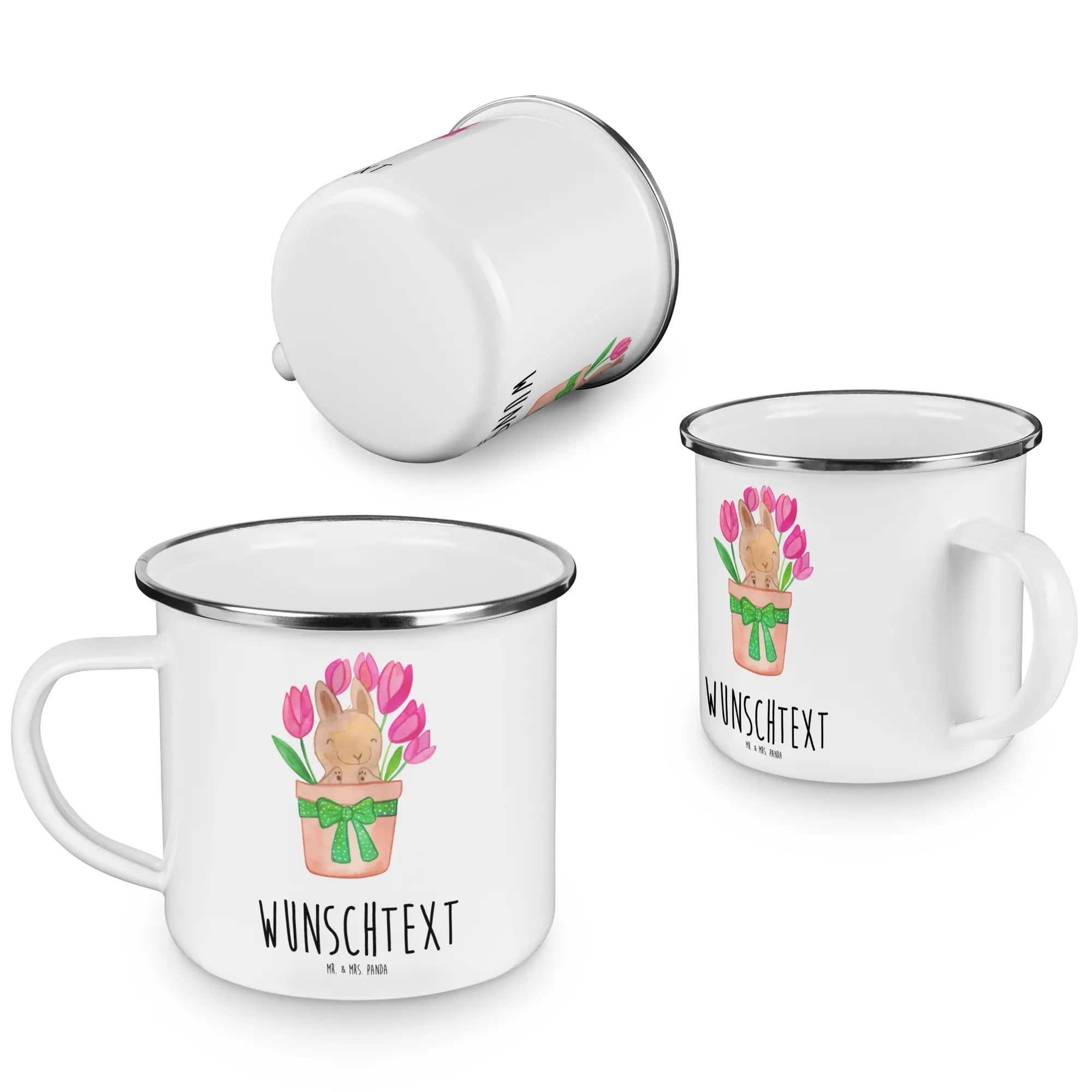 Entdecke die wunderbare personalisierte Emaille Tasse mit dem fröhlichen Motiv Hase und Tulpen aus der Ostern-Kollektion von Mr. & Mrs. Panda! Diese Tasse ist nicht nur ein praktisches Alltagsprodukt, sondern auch ein ganz besonderes Geschenk für deine Liebsten an Ostern.