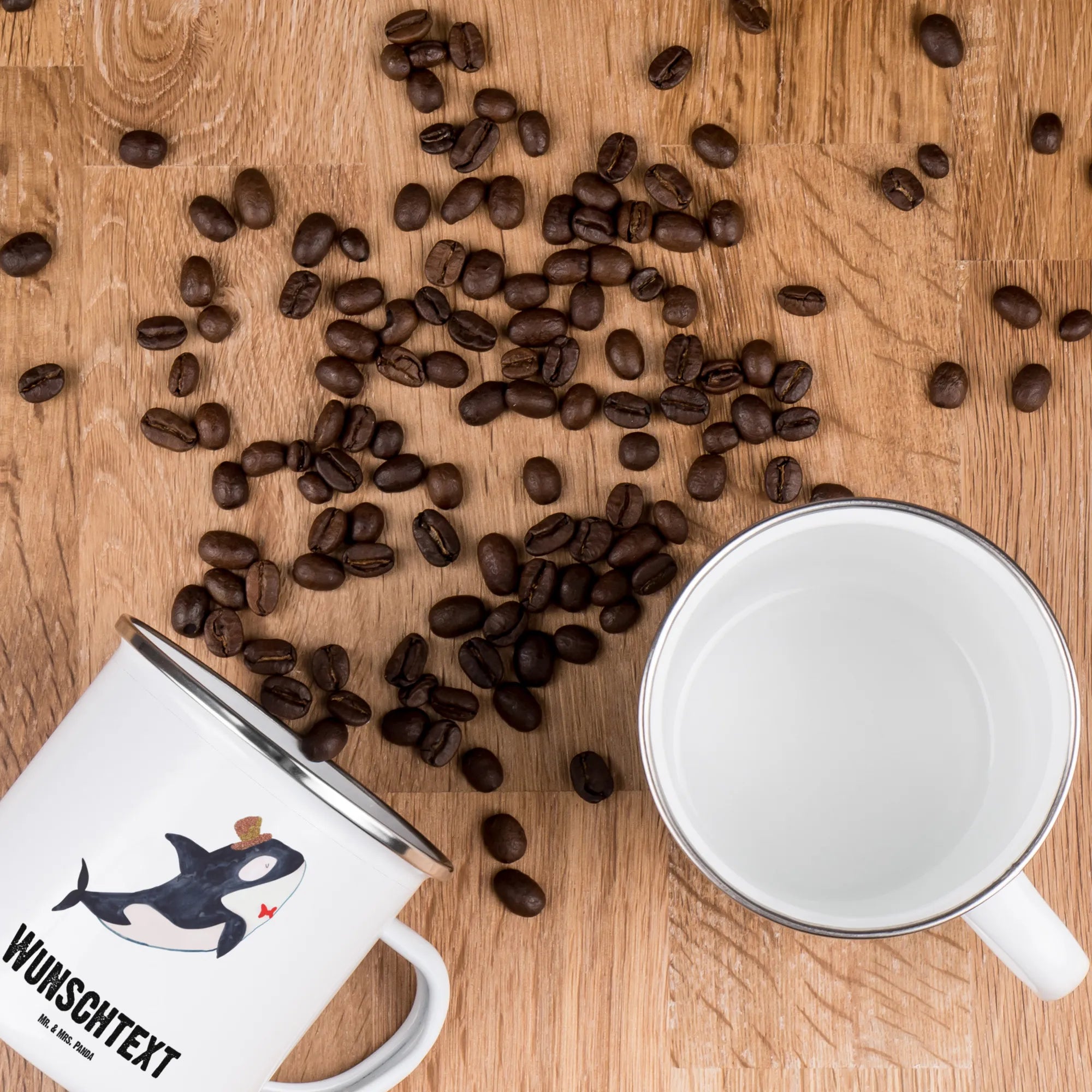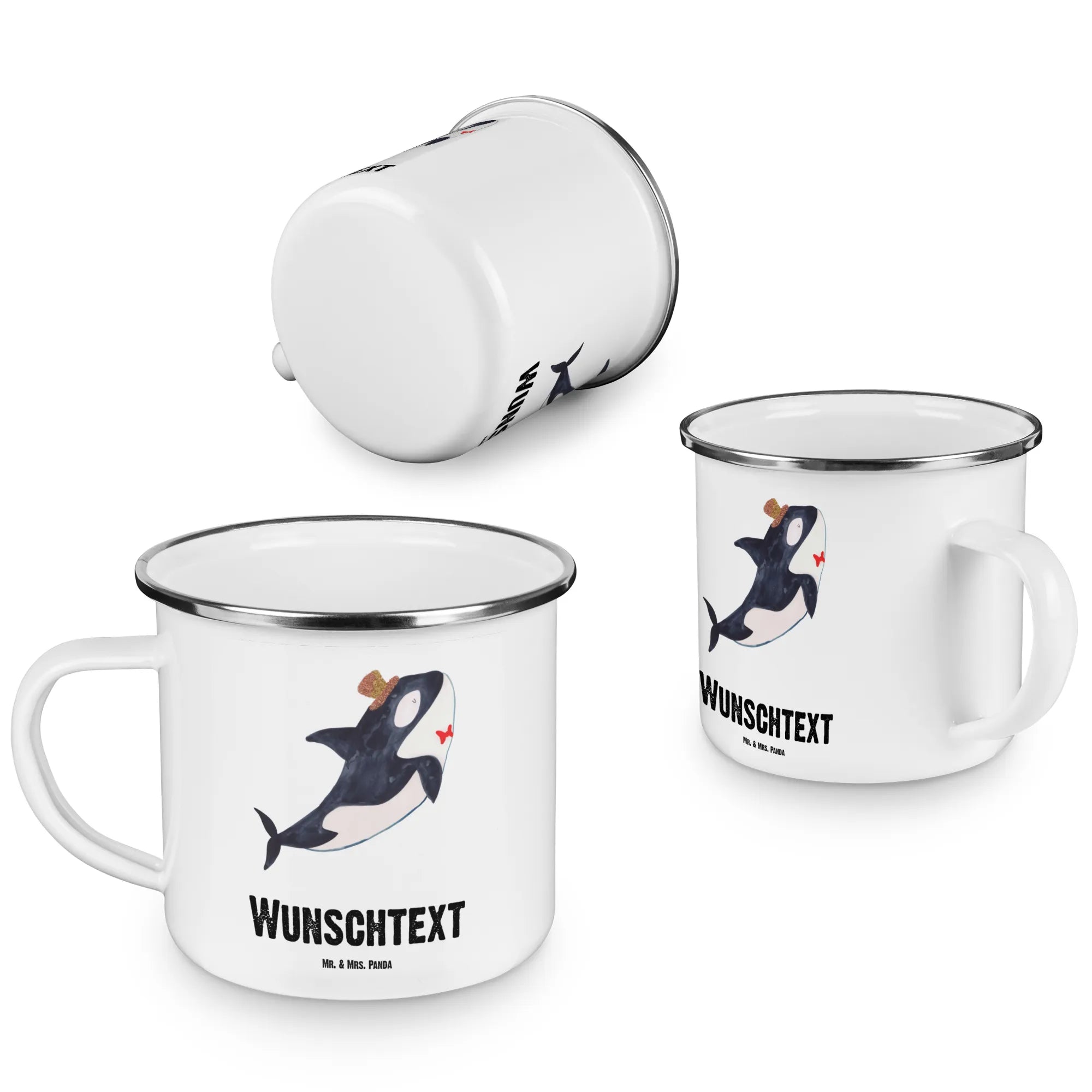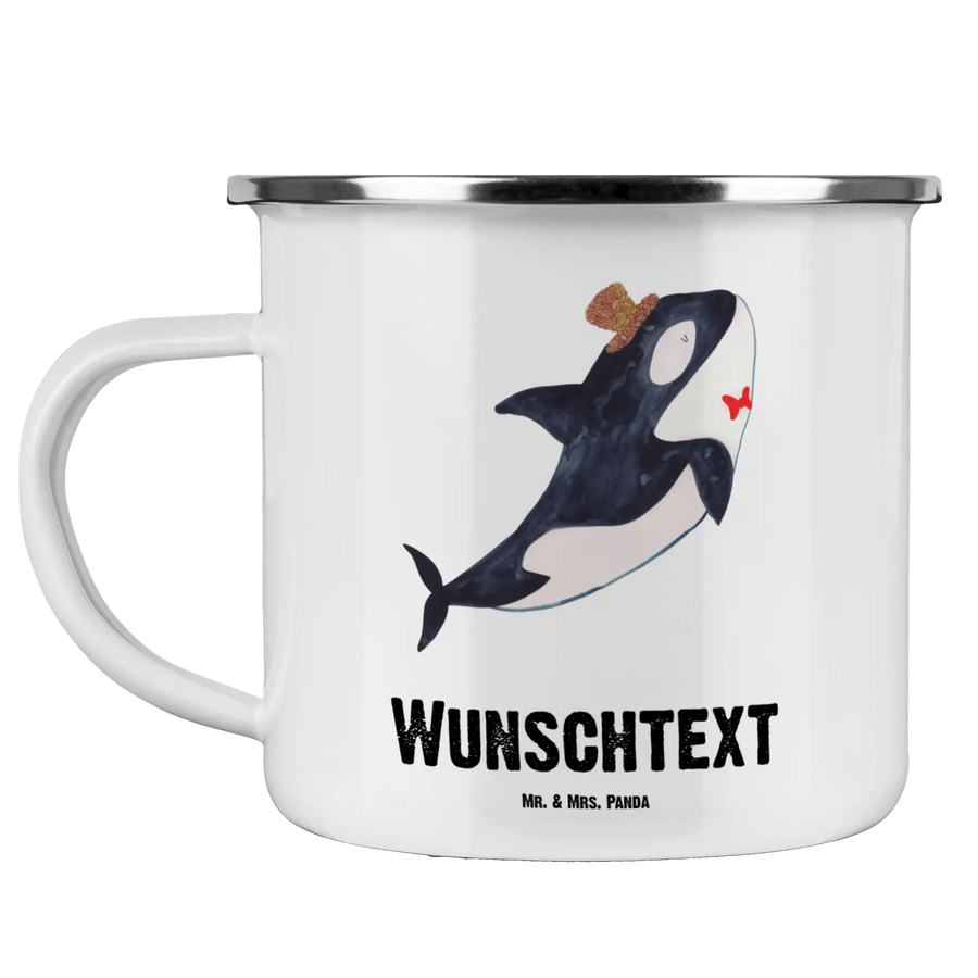 Mr. & Mrs. Panda präsentiert: Die personalisierte Emaille Tasse „Orca Zylinder“ aus der liebevollen Meerestiere-Kollektion. 🌊🖤 Ein freundlicher Orca im skizzierten Aquarell-Stil trägt einen verspielten Zylinder mit Blumenverzierung, begleitet von einem kleinen roten Fischchen – eine Illustration, die gute Laune macht.