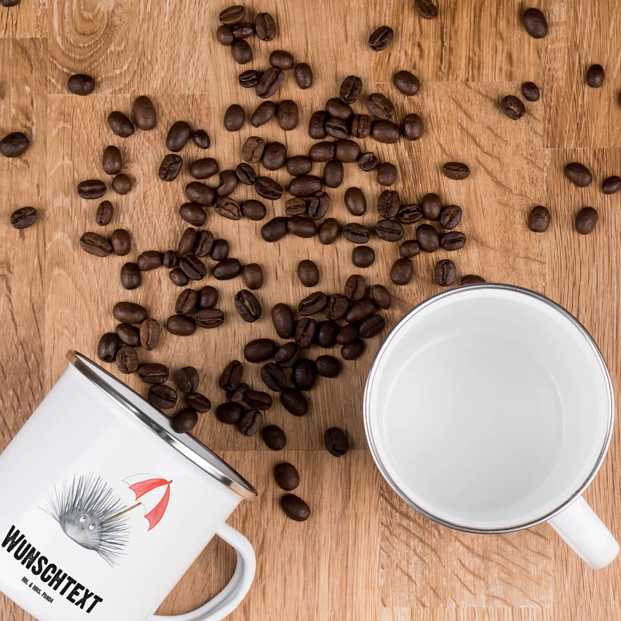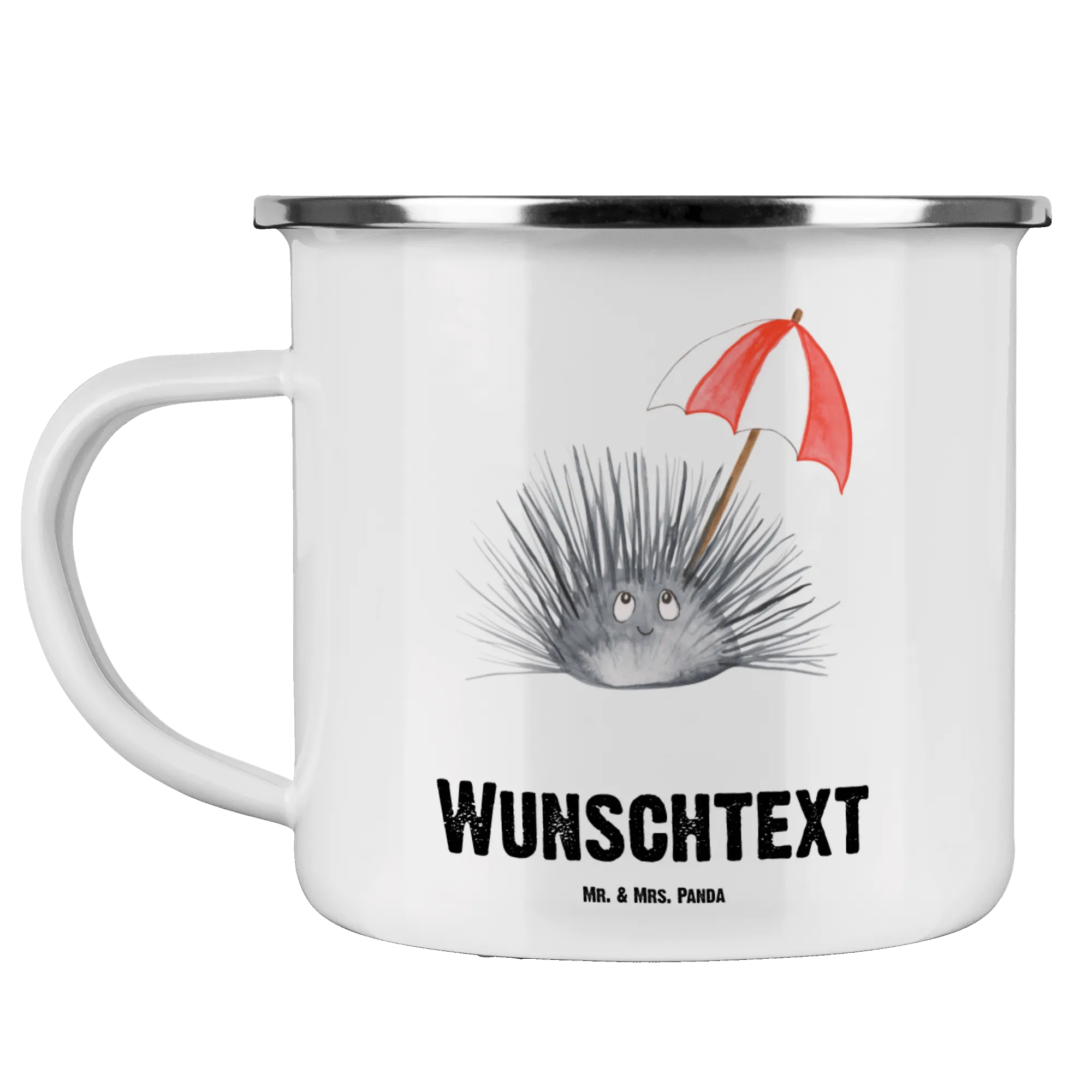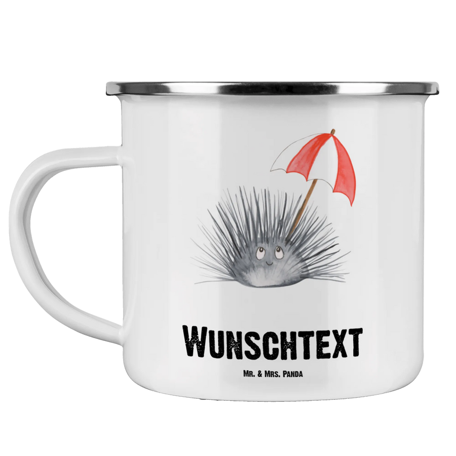 Die personalisierte Emaille Tasse Seeigel von Mr. & Mrs. Panda ist das perfekte Geschenk für alle, die das Meer und die Freiheit von Campingausflügen lieben. Mit ihrem niedlichen Motiv eines freundlichen Seeigels, der mit einem kleinen roten Schirmchen in der Hand die Sonnenstrahlen genießt, bringt diese Tasse ein Stück Urlaub in jeden Alltag.