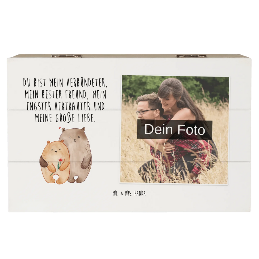 Die perfekte Möglichkeit, deine schönsten Erinnerungen zu bewahren, ist die personalisierte Foto Holzkiste von Mr. & Mrs. Panda! Mit einem traumhaften Motiv von verliebten Bären und dem inspirierenden Spruch 'Du bist mein Verbündeter, Mein bester Freund, mein engster Vertrauter und meine große Liebe.' verkörpert diese Kiste die tiefen Emotionen der Liebe.