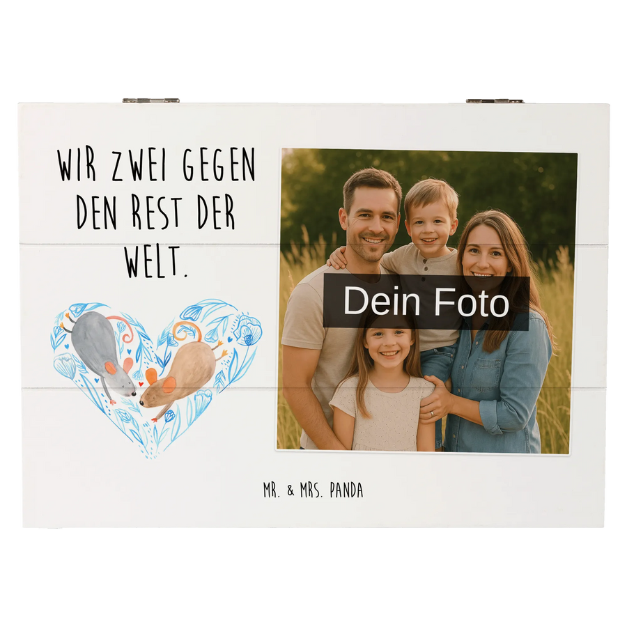 Die personalisierte Foto Holzkiste Mäuse Herz von Mr. & Mrs. Panda ist der perfekte Liebesbeweis für all jene, die ihre Erinnerungen in etwas besonders Einzigartiges verwandeln möchten. Mit einem zauberhaften Motiv von zwei niedlichen Mäusen, die zusammen ein Herz bilden, überbringt diese Kiste eine liebevolle Botschaft: 'Wir zwei gegen den Rest der Welt.' Sie ist nicht nur ein wunderschöner Aufbewahrungsort für Fotos und persönliche Schätze, sondern auch ein emotionales Geschenk, das unvergessliche Momente festhält.