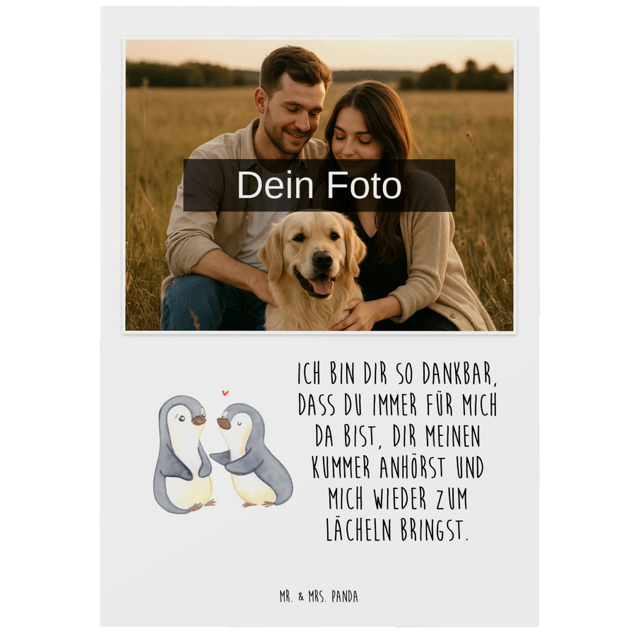 Die beiden niedlichen Pinguine, die sich zärtlich zuneigen, verkörpern Geborgenheit und Trost. Mit dem liebevollen Slogan: "Ich bin dir so dankbar, dass du immer für mich da bist, dir meinen Kummer anhörst und mich wieder zum Lächeln bringst", versendest du nicht nur eine Postkarte, sondern ein Stück deiner Seele. Jeder kann sie personalisieren, indem er ein eigenes Foto hinzufügt.