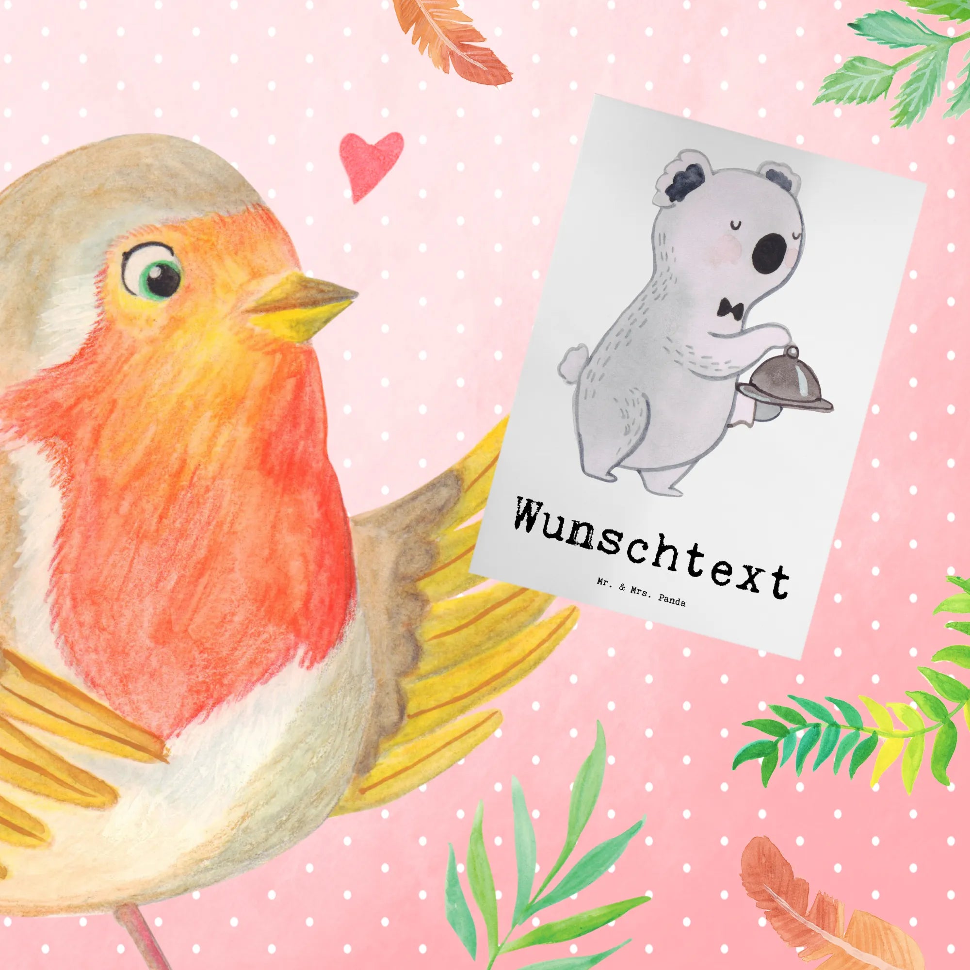 Mit dem liebevoll designten Motiv eines kleinen Koalas, der köstliches Essen serviert, versprüht die Karte pure Freude. Die Vorderseite ist hochglänzend veredelt und bietet Platz für deinen Wunschnamen oder Wunschtext. So wird die Karte garantiert einzigartig und persönlich – perfekt, um besondere Momente zu feiern oder einfach mal nur „Danke“ zu sagen!