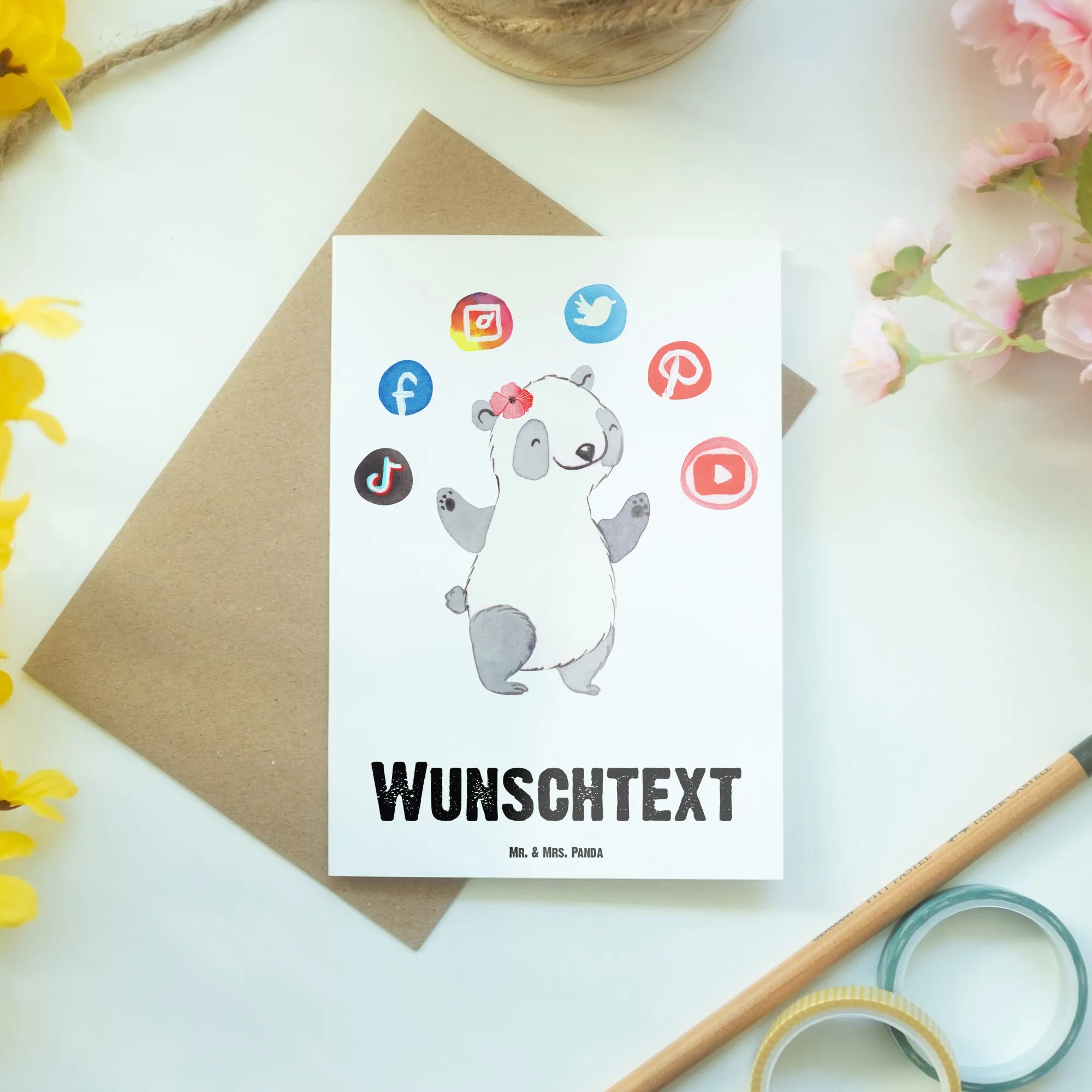 Mit einem süßen Panda-Motiv, der fröhlich mit Social Media Icons jongliert, vermittelt die Karte nicht nur einen herzlichen Gruß, sondern auch eine Portion Humor. Die Karte besteht aus hochwertigem 300 Gramm Karton, der sich durch seine matt-glänzende Oberfläche auszeichnet und somit besonders edel wirkt.