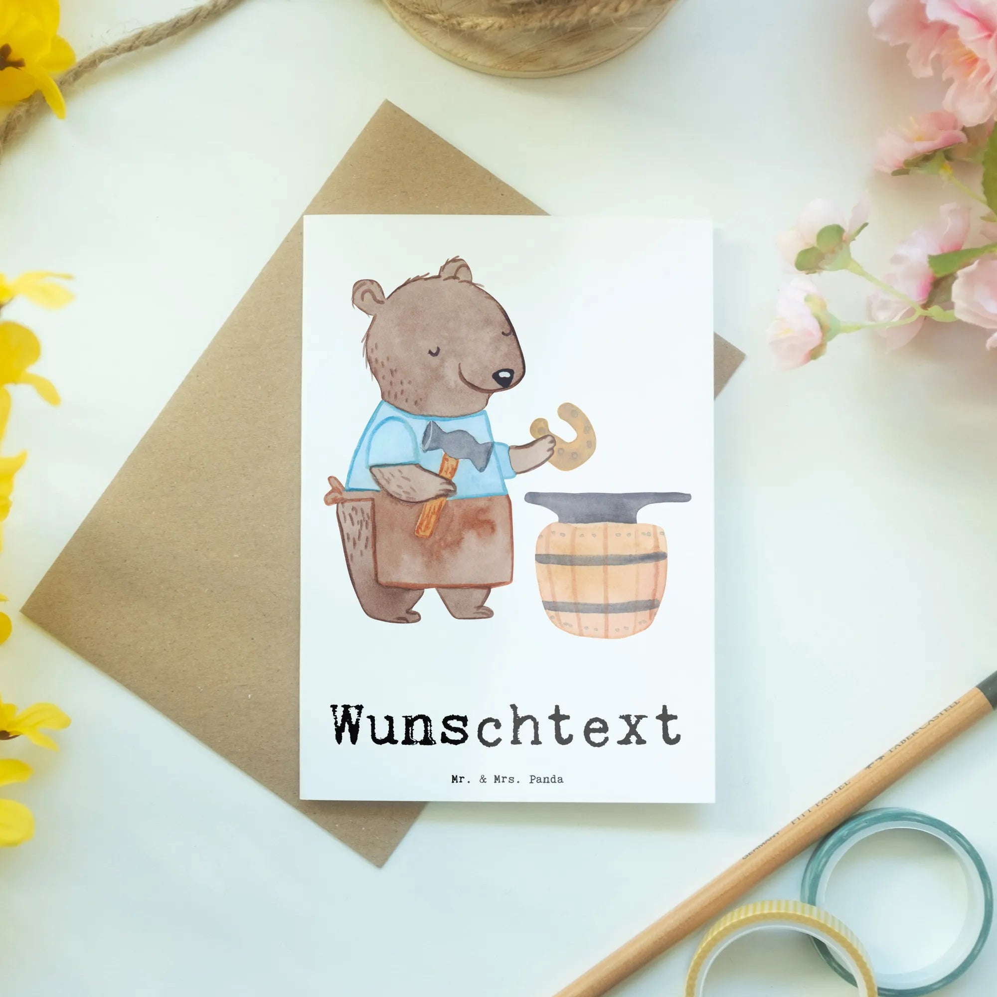 Die personalisierte Grußkarte "Schmied mit Herz" aus der einzigartigen Berufe-Kollektion von Mr. & Mrs. Panda ist das perfekte Geschenk für Schmiede und Schmiedinnen. Ganz gleich, ob Du einen Kollegen zum neuen Job gratulieren, einem Freund zum Jubiläum gratulieren oder jemandem einfach nur Danke sagen möchtest, diese Grußkarte vermittelt Deine Wertschätzung auf eine ganz besondere Art und Weise.