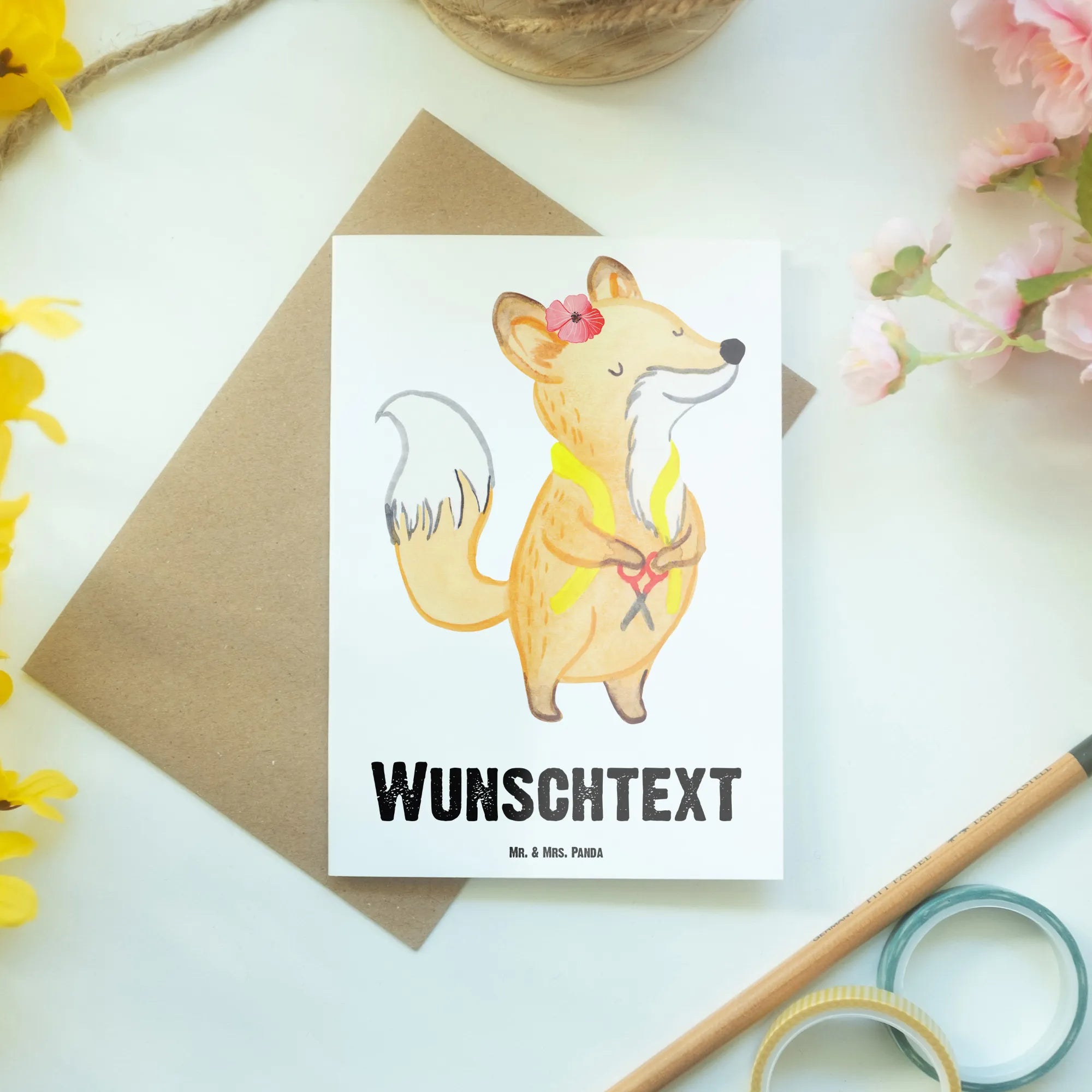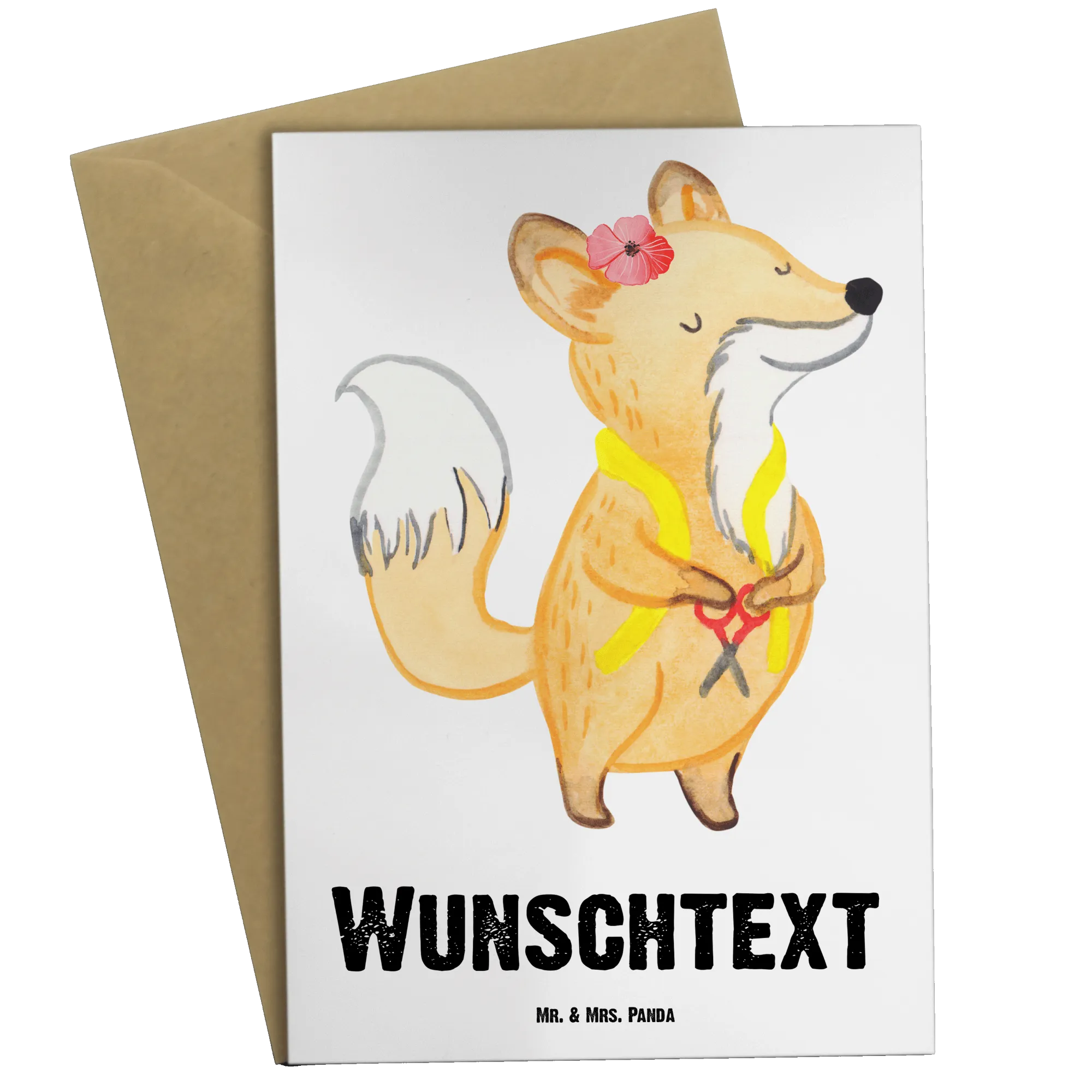 Mit der Möglichkeit, deinen Wunschnamen oder einen persönlichen Text auf die Vorderseite drucken zu lassen, ist sie ideal für besondere Anlässe wie Jubiläen, Abschiede oder einfach nur, um Danke zu sagen. Die liebevoll gestaltete Karte zeigt einen süßen Fuchs, der stolz mit einem Maßband um den Hals und einer Schere in der Hand auftritt – eine Hommage an die Leidenschaft und das Können der Schneider.