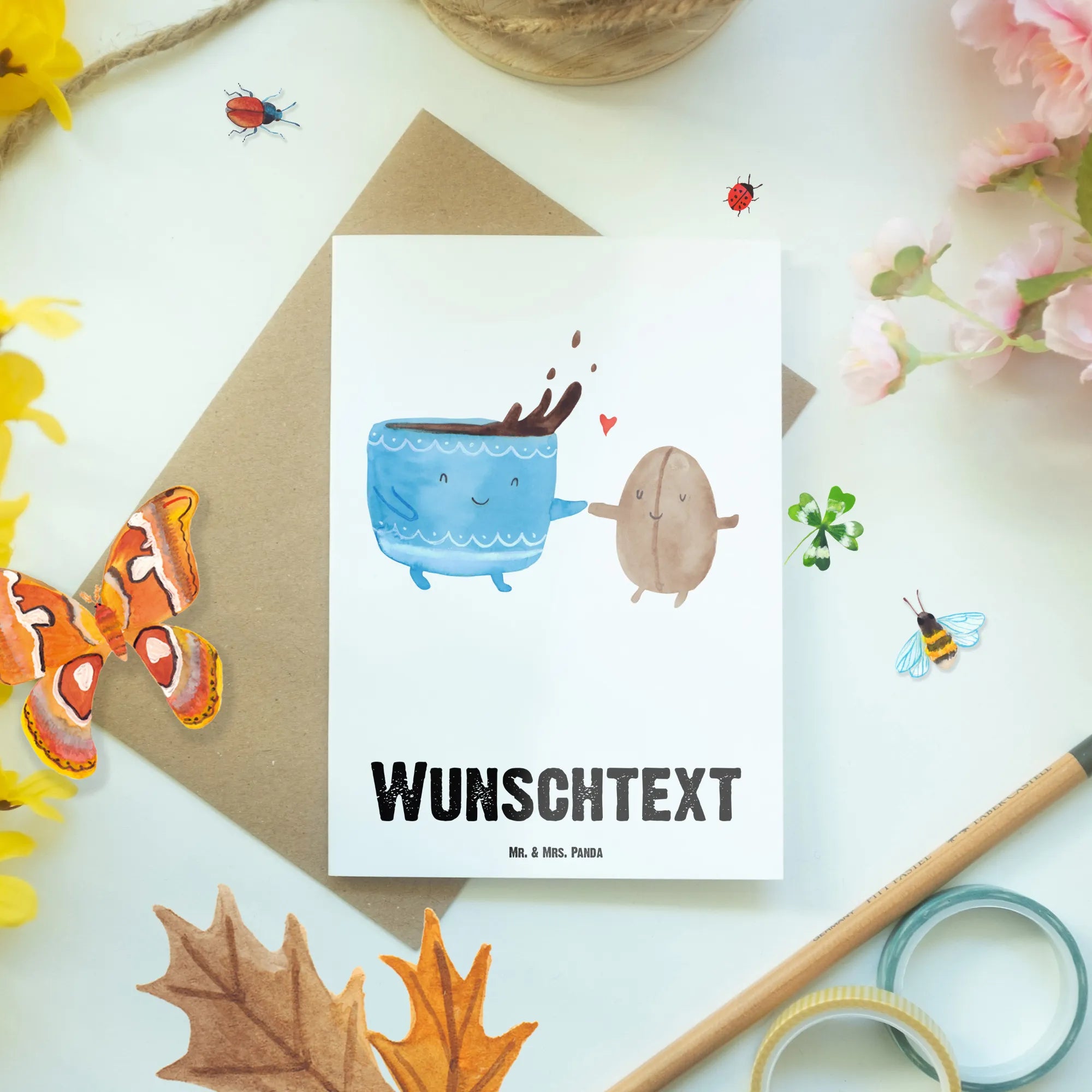 Perfekt für alle Kaffeeliebhaber: die personalisierte Grußkarte "Kaffee Bohne" aus der Small World Kollektion von Mr. & Mrs. Panda. ☕️