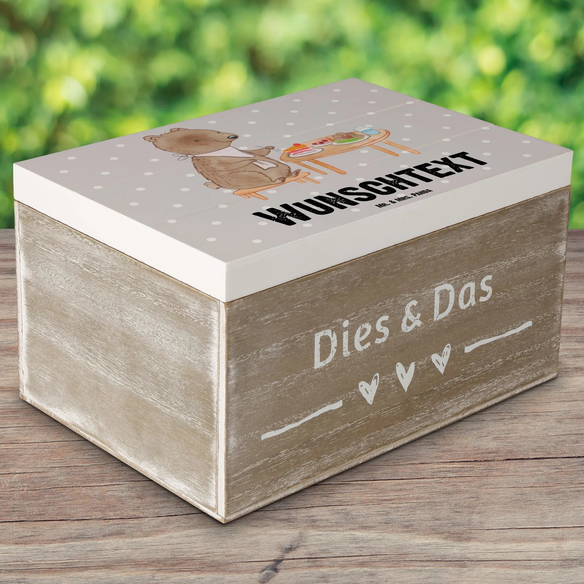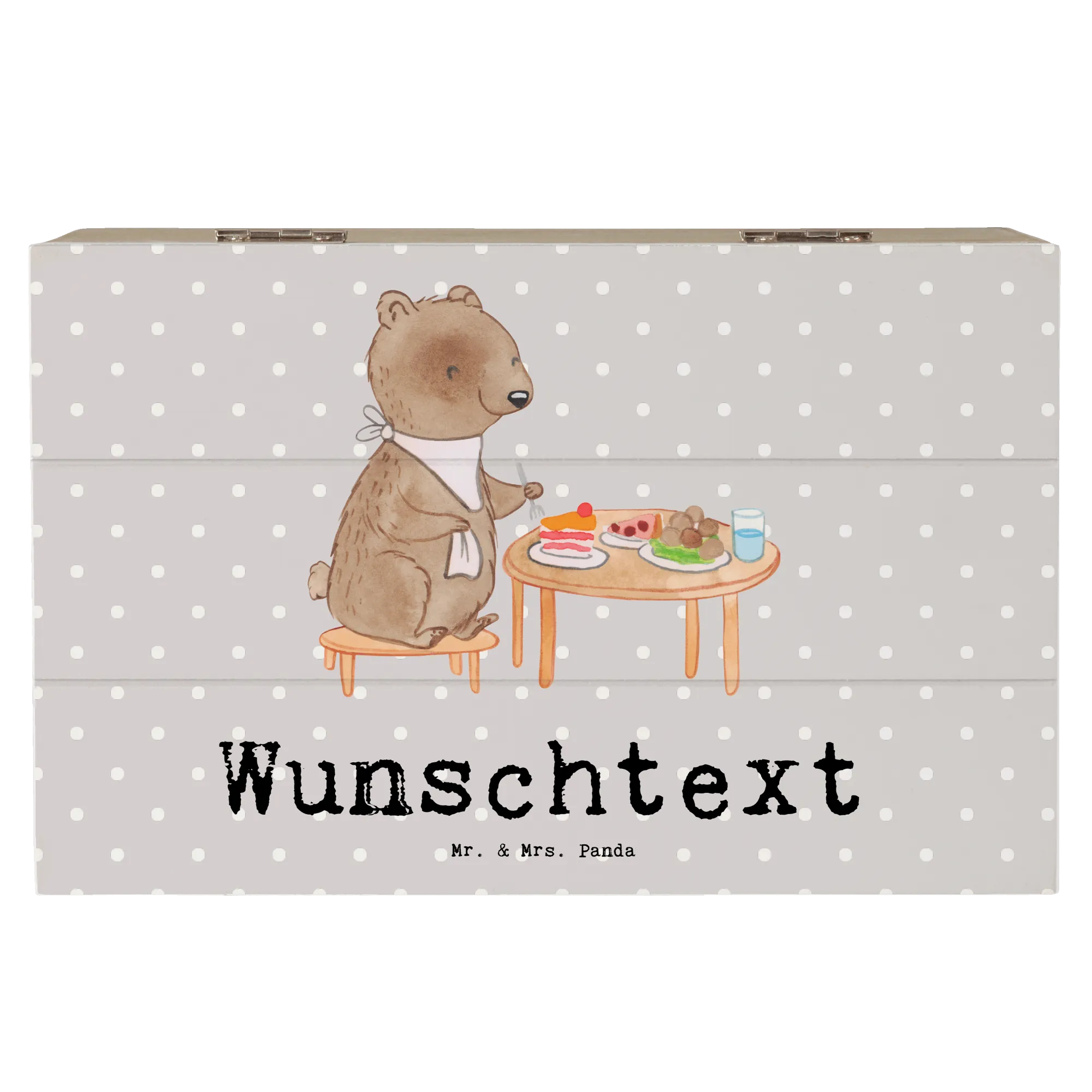 Entdecke die bezaubernde personalisierte Holzkiste "Bär Essen gehen Tage" von Mr. & Mrs. Panda! Diese wunderschöne Kiste ist das perfekte Geschenk für alle, die Essen und besondere Momente lieben. Egal, ob für den nächsten Restaurantbesuch oder einfach als Aufbewahrungsort für all deine Schätze – diese Kiste wird sofort zum Lieblingsstück.