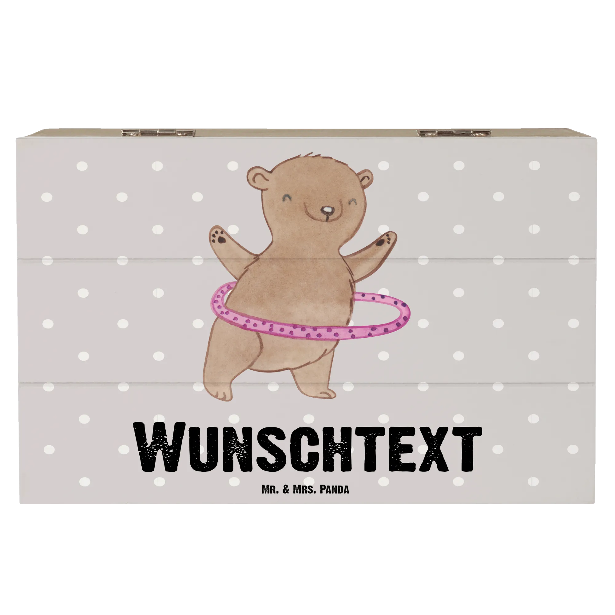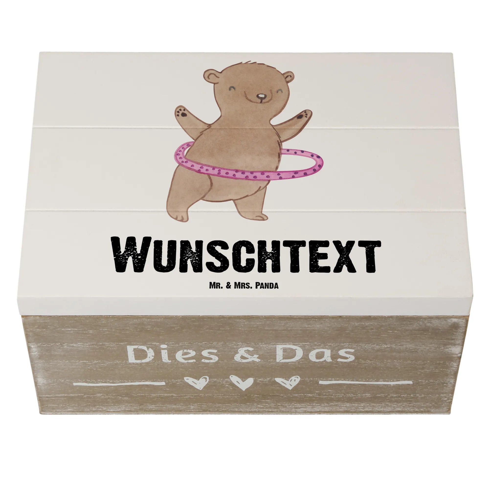 Die personalisierte Holzkiste "Bär Hula Hoop Tage" von Mr. & Mrs. Panda ist das perfekte Geschenk für alle Sportliebhaber und Hula Hoop-Fans. Sie wurde liebevoll aus hochwertiger Premium Hartfaser gefertigt, die nicht nur robust, sondern auch wasserabweisend ist. Diese Kiste ist nicht nur ein praktischer Aufbewahrungsort für deine schönsten Erinnerungen, sondern auch ein ganz besonderes Stück, das mit deinem Namen oder einem gewünschten Text personalisiert werden kann. Ob für die eigene Sammlung oder als Geschenk – diese Holzkiste ist ein absolutes Must-Have für jeden Sportler.