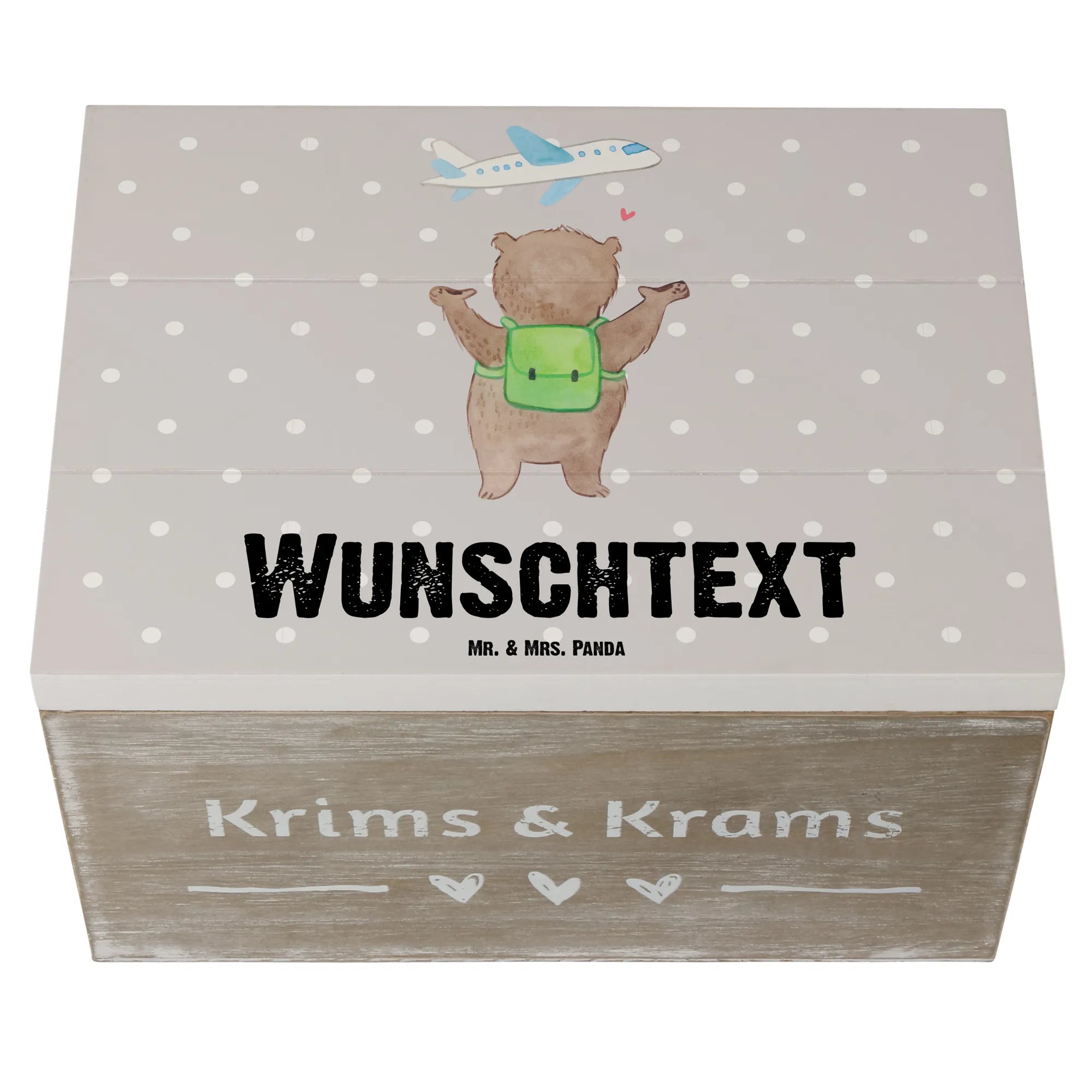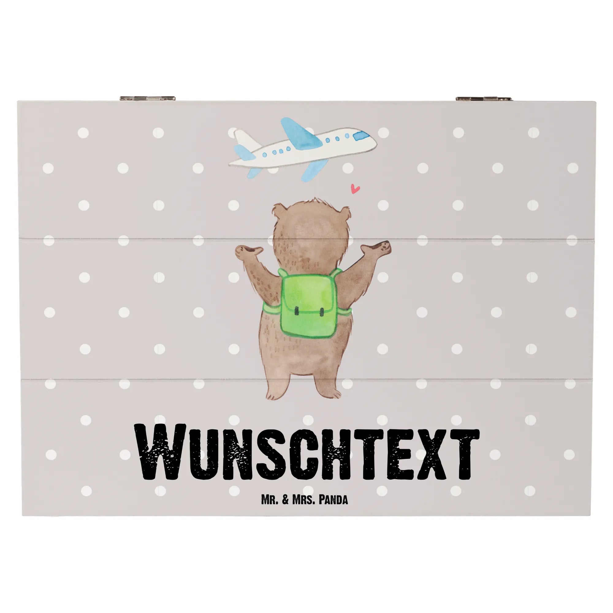 Die personalisierte Holzkiste von Mr. & Mrs. Panda, bedruckt mit dem bezaubernden Motiv "Bär Reisen Tage", ist der ideale Begleiter für all deine Schätze und Erinnerungen! Egal ob für deine aufregenden Reisen, besondere Anlässe wie Kommunion oder Geburtstage, diese Kiste ist perfekt, um all das Wertvolle unterzubringen. Der entzückende Bär, der begeisterte Arme in die Luft wirft, während er ein Flugzeug am Himmel entdeckt, symbolisiert die Freude und Abenteuerlust des Reisens.