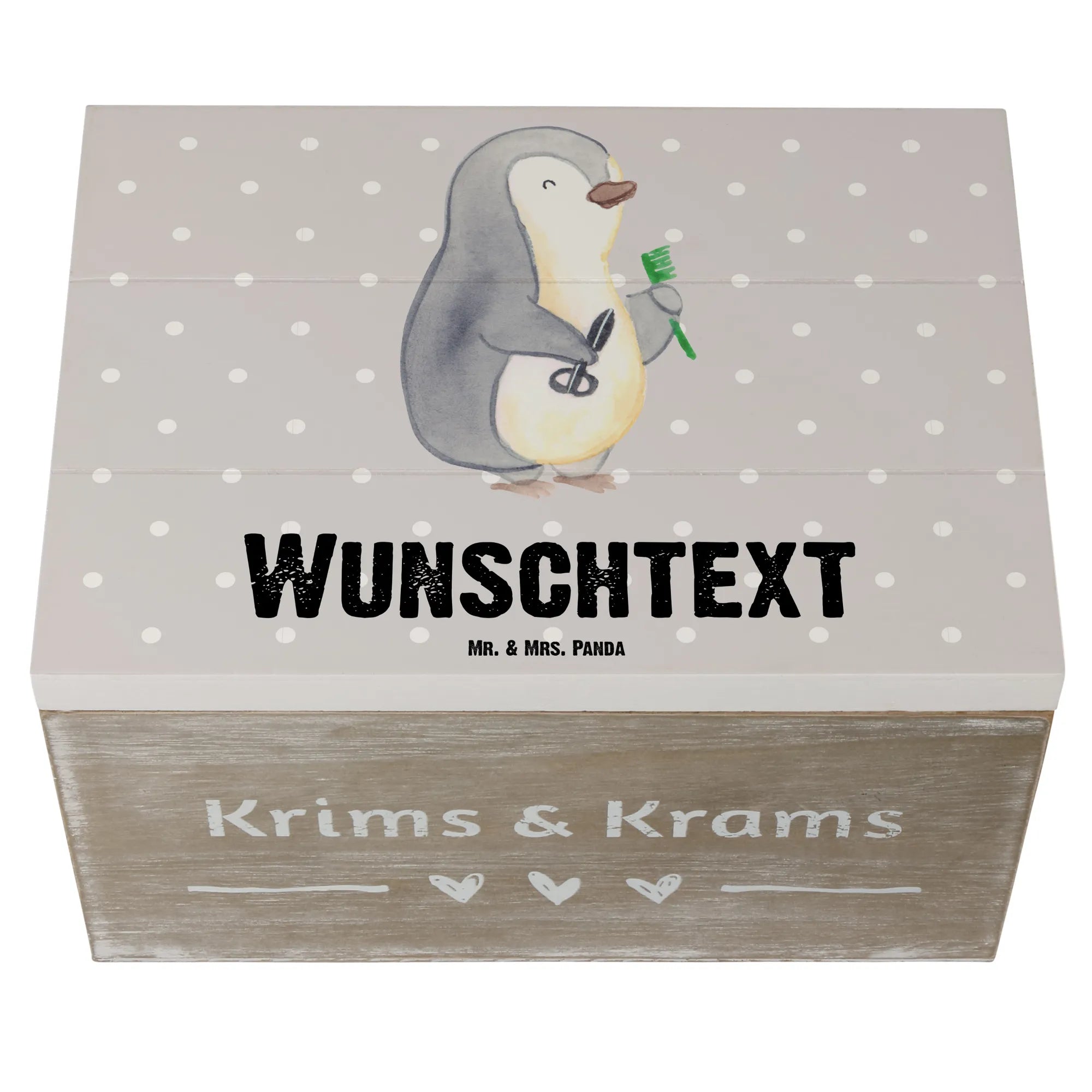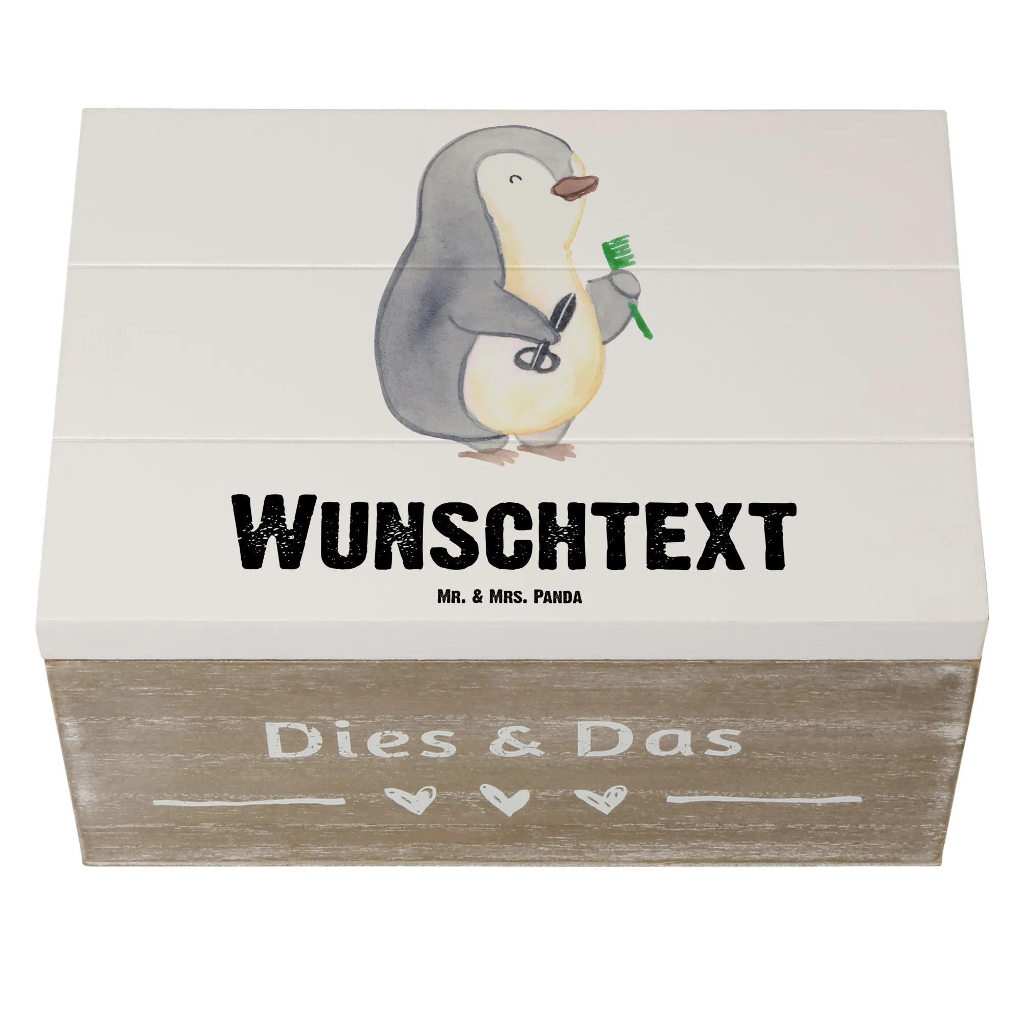 Die personalisierte Holzkiste "Hairstylist mit Herz" von Mr. & Mrs. Panda ist das perfekte Geschenk für Haarstylisten und alle Liebhaber des Friseurhandwerks. Mit einem niedlichen Motiv – einem fröhlichen Pinguin, der als Hairstylist mit einem Kamm in der Hand posiert – bringt diese Kiste eine liebevolle Note in jeden Friseursalon oder zu Hause.