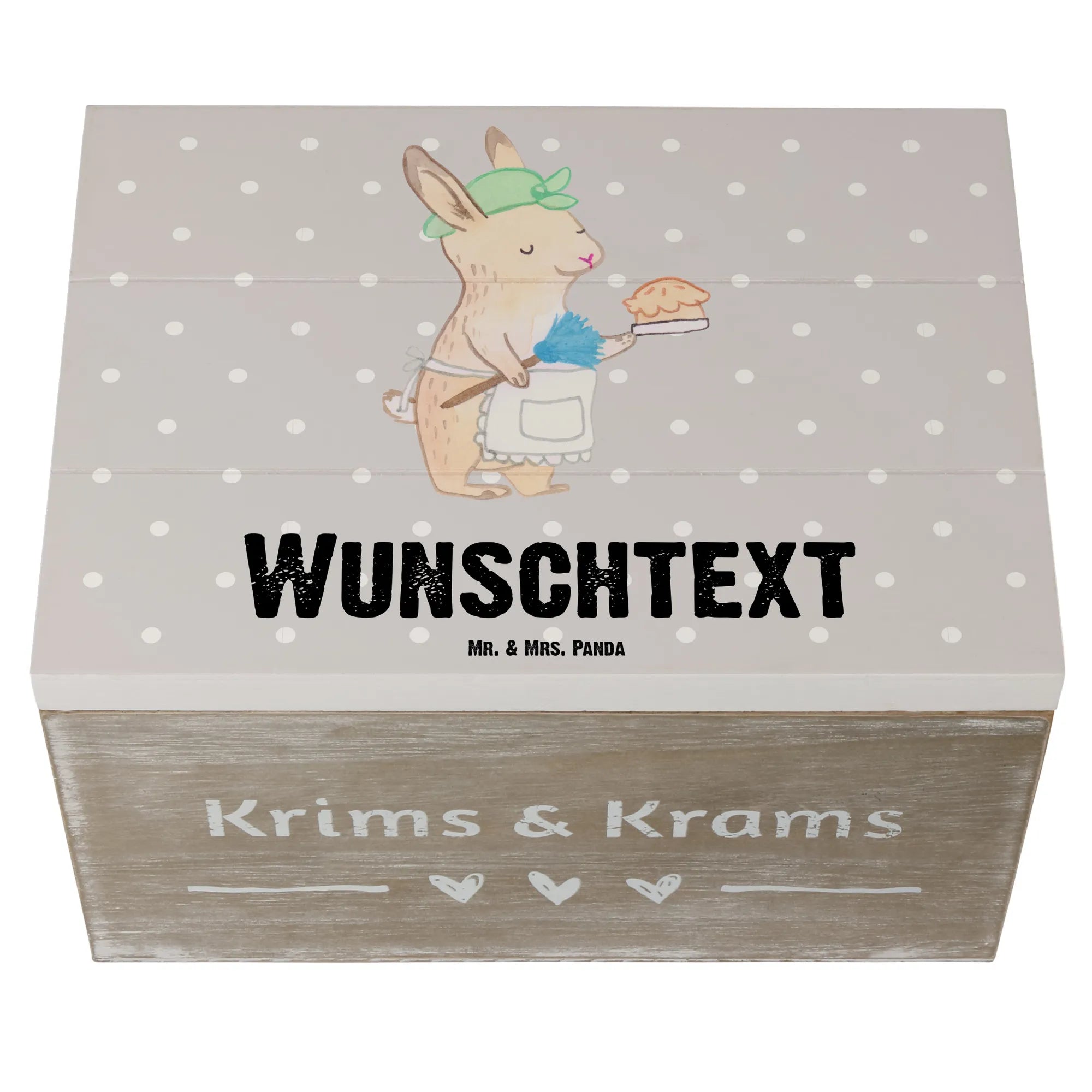 Mit einer speziellen Personalisierung kannst du den Namen deiner Lieblings-Haushaltshilfe auf die Kiste drucken lassen. Das liebevoll gestaltete Motiv zeigt einen niedlichen Hasen mit einer Schürze und einem Staubwedel, begleitet von dem witzigen Spruch "Du bist nur ein halber Mensch, wenn du keine Haushaltshilfe bist." Diese Botschaft sorgt garantiert für ein Schmunzeln und bringt Freude in den Alltag.