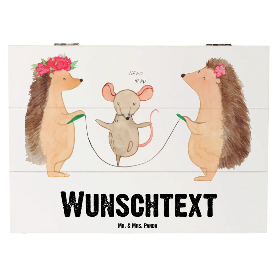 Die personalisierte Holzkiste mit dem liebevollen Motiv "Igel Seilhüpfen" von Mr. & Mrs. Panda ist das ideale Geschenk für Kinder und junggebliebene Erwachsene. Diese wunderschöne Kiste ist nicht nur ein praktischer Aufbewahrungsort für Schätze, sondern auch ein fantastisches Dekorationselement. Im Kinderzimmer, im Wohnzimmer oder sogar im Büro – die fröhlichen kleinen Igel und die niedliche Maus sorgen überall für gute Laune. Ihre tollen Sprüche und die bunten Motive machen die Kiste zu einem echten Hingucker.