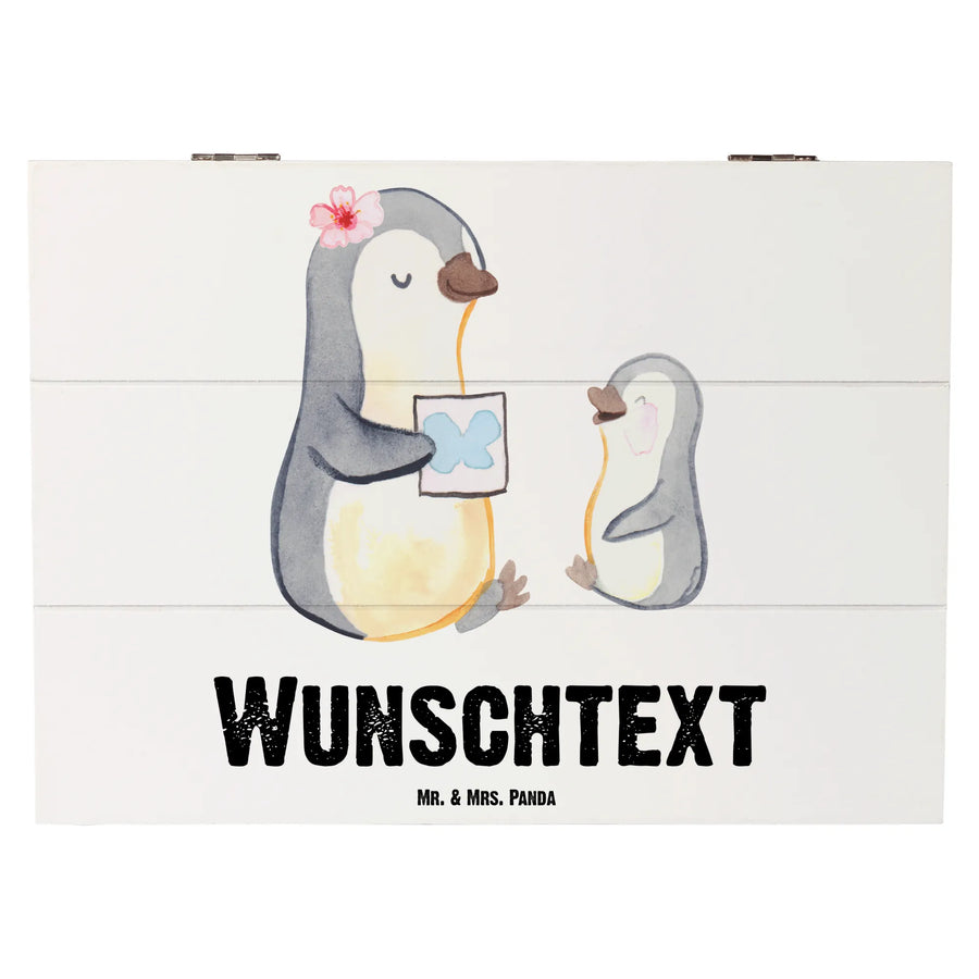 Unsere liebevoll gestaltete Holzkiste mit Namen ist das perfekte Geschenk für alle Logopädinnen: ein persönliches Erinnerungsgeschenk, das Danke sagt und zugleich Platz für kleine Schätze bietet. Das Motiv zeigt einen weiblichen Pinguin, der einem kleinen Pinguin ein Bild erklärt – ein süßes Symbol für das Lehren, Zuhören und Begleiten. Der witzige Spruch „Du bist nur ein halber Mensch, wenn du keine Logopädin bist." macht die Kiste zu einem humorvollen und zugleich warmen Geschenk.