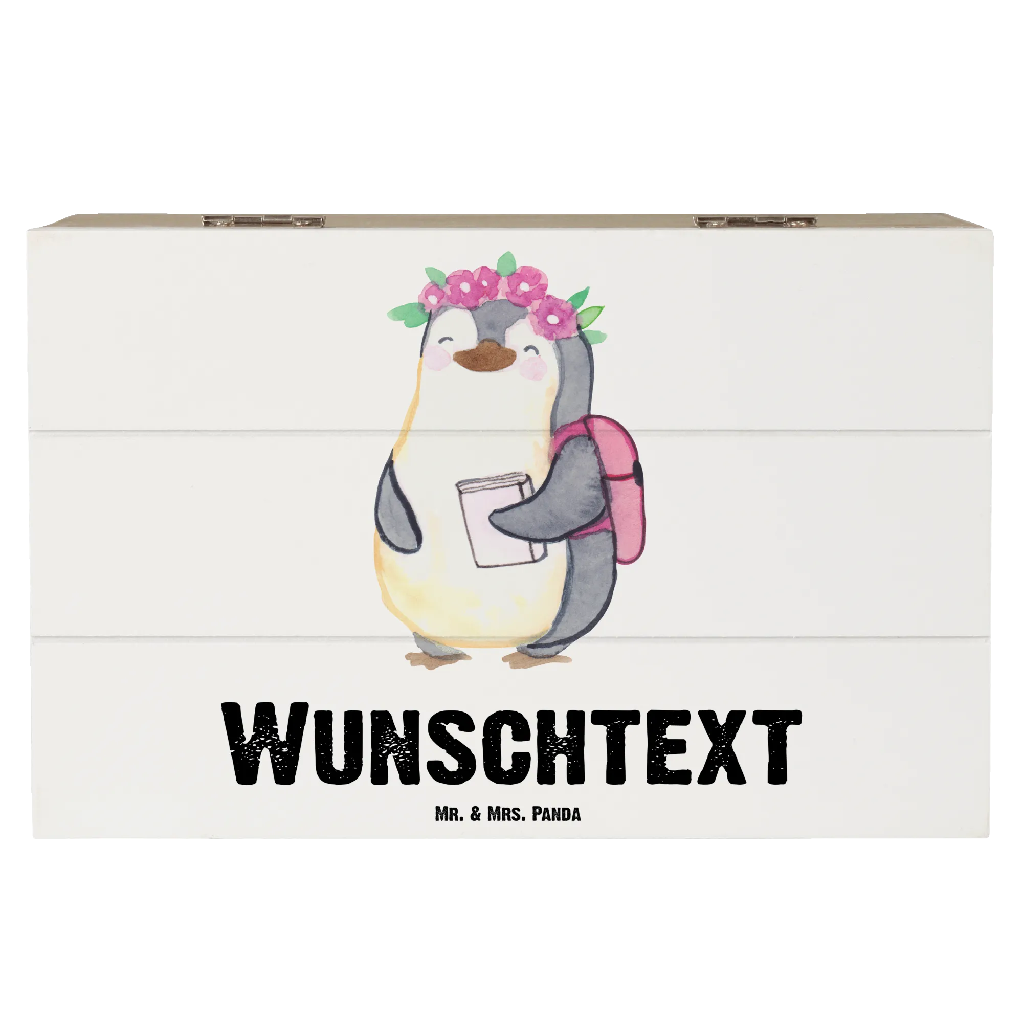 Lass den Pinguin auf der Kiste für sich sprechen! Der süße Pinguin mit Blumen auf dem Kopf und einem Rucksack hat den Spruch „Beste Studentin der Welt“ bei sich – eine tolle Erinnerung an all die harten Jahre im Studium. Das personalisierte Design macht diese Kiste einzigartig und zeigt, wie sehr du die Person wertschätzt, die sie bekommt.