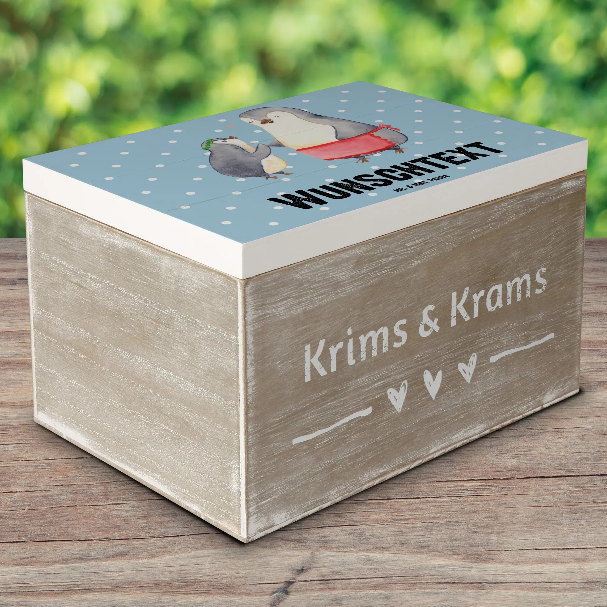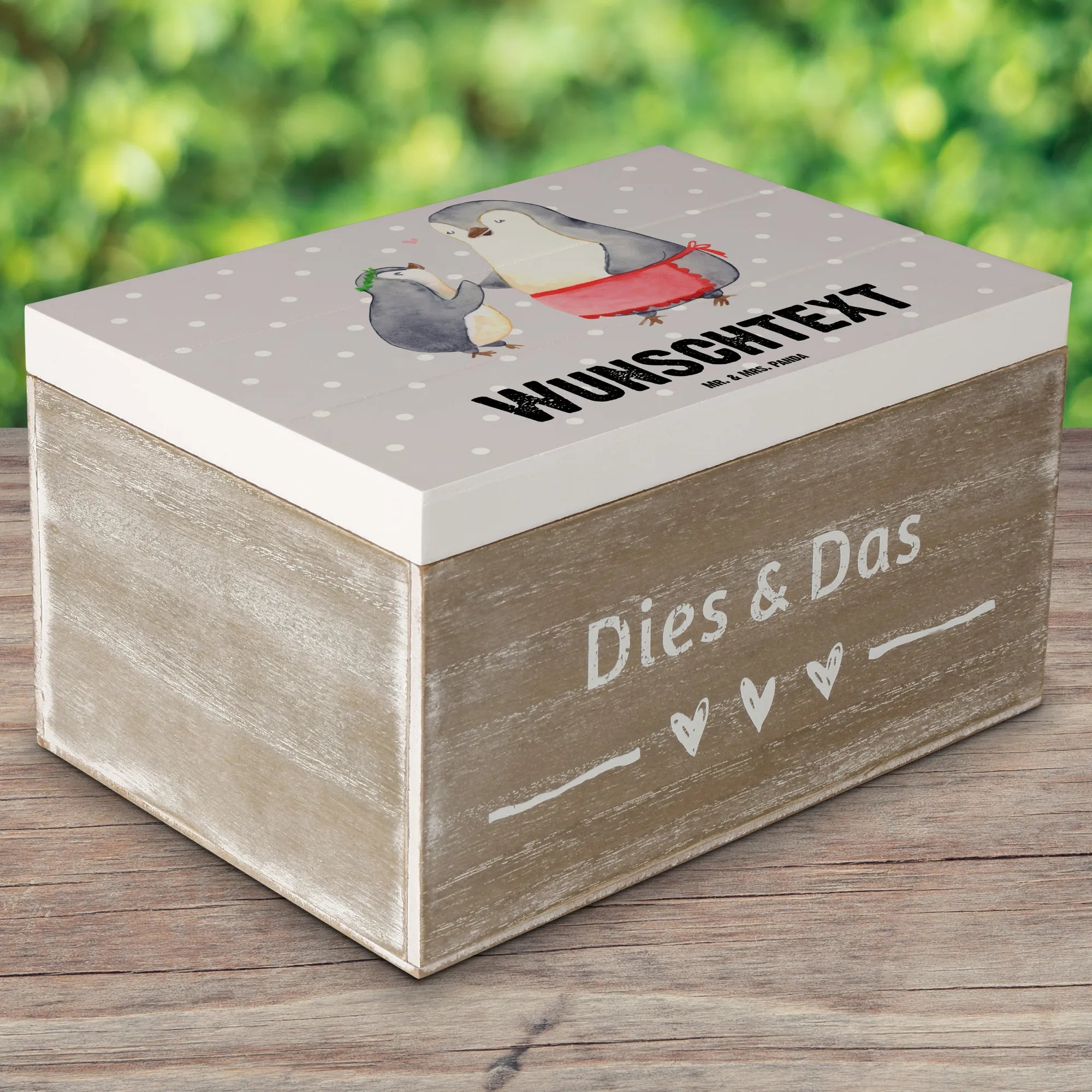 Nostalgie und Liebe liegen in der Luft! Die Holzkiste "Pinguin mit Kind" ist ein absolutes Must-Have für alle, die einen lieben Menschen beschenken möchten. Sie passt perfekt zur Familienkollektion von Mr. & Mrs. Panda, die sich um die schönen Momente im Leben dreht. Verschönere den Alltag deiner Mama mit einem ganz persönlichen Geschenk, das sie immer an die besonderen Augenblicke erinnern wird.