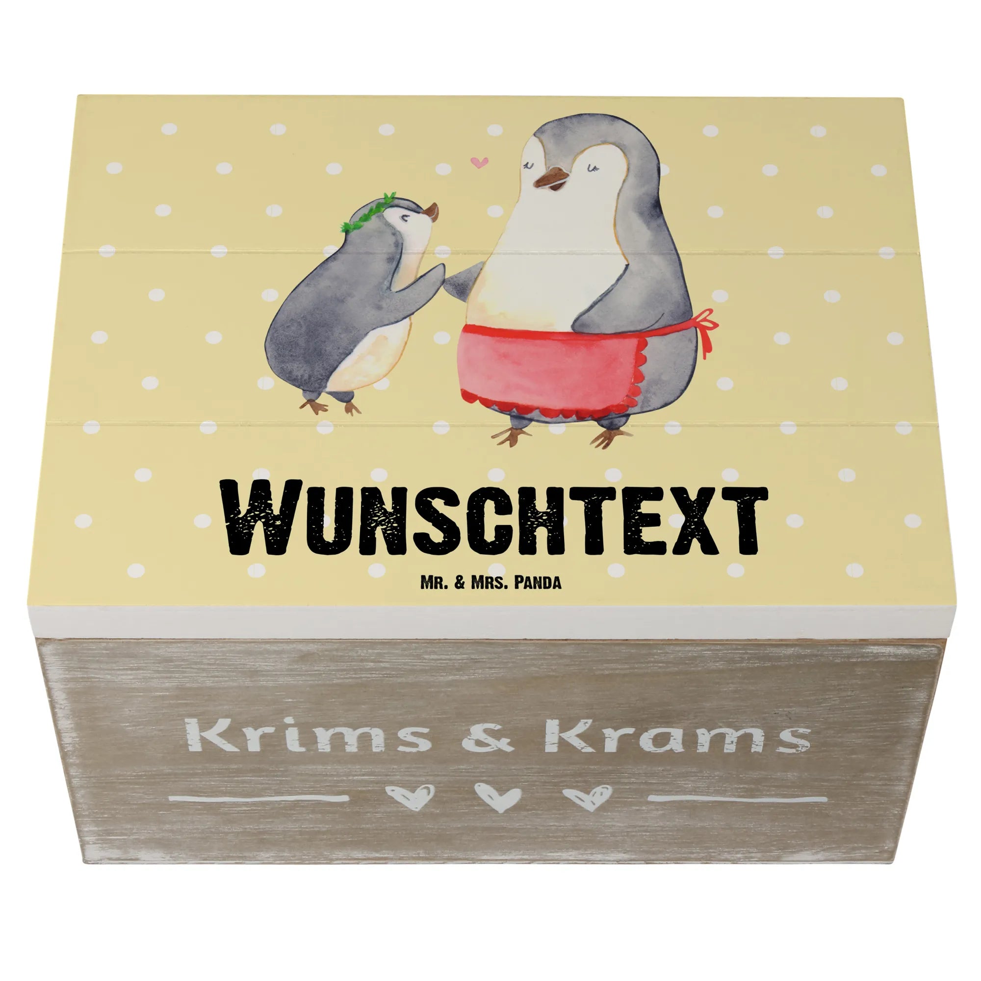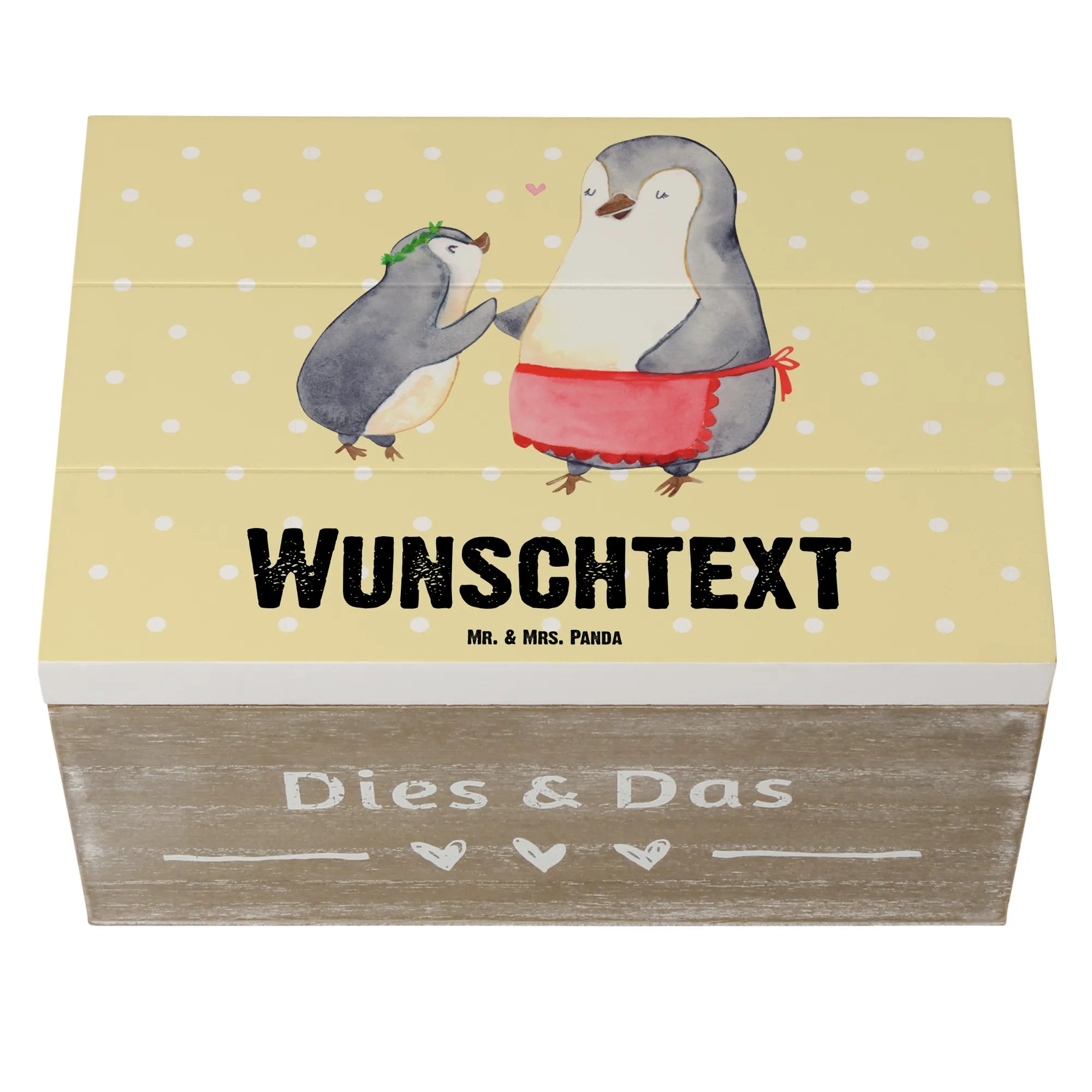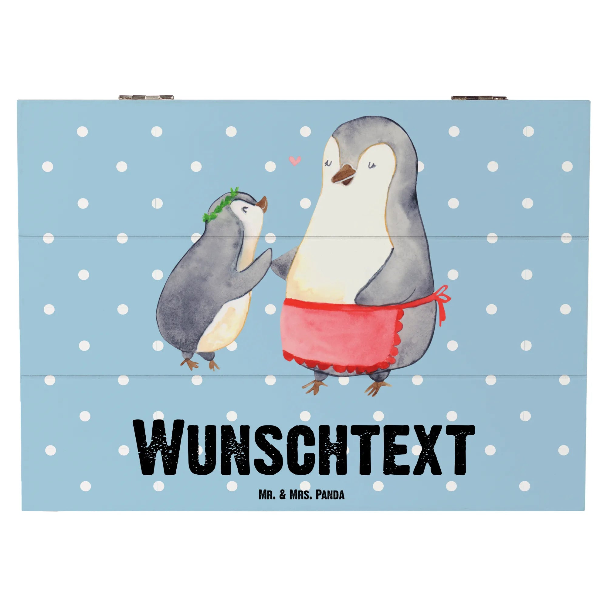 Die personalisierte Holzkiste Pinguin mit Kind von Mr. & Mrs. Panda ist das ideale Geschenk für alle, die ihrer Mutter, Mama, oder Mutti etwas ganz Besonderes schenken möchten. Ob zum Geburtstag, zum Muttertag oder einfach nur, um Danke zu sagen – diese wunderschöne Erinnerungsbox ist perfekt für jeden Anlass. Das zauberhafte Motiv zeigt zwei Pinguine in einer liebevollen Umarmung: die große Mama-Pinguin mit roter Schürze und das kleine Kind mit einem grünen Kranz. Zwischen ihnen schwebt ein kleines Herz, das die besondere Beziehung zwischen Mutter und Kind symbolisiert. Die Größe der Kiste (25 x 18 cm) bietet genug Platz, um wertvolle Erinnerungen, Fotos oder kleine Schätze aufzubewahren.