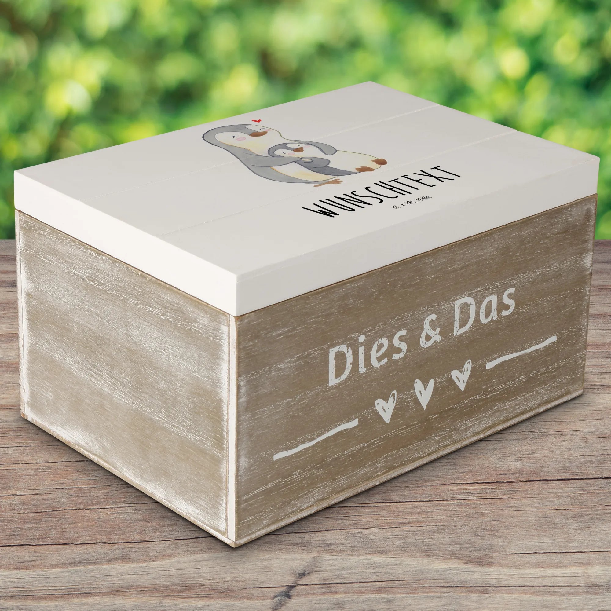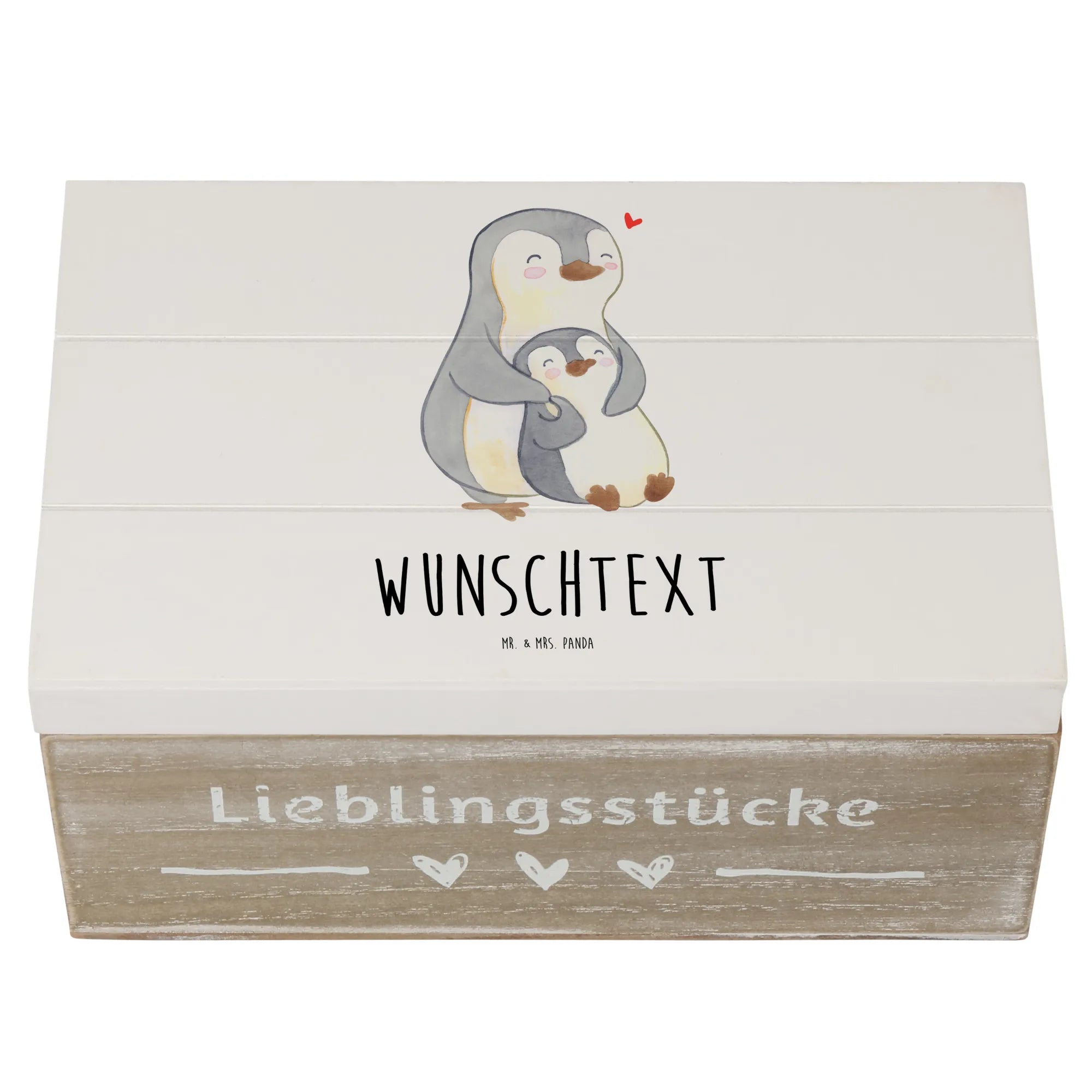 Eine liebevolle Geschenkidee für Mama: Die personalisierte Holzkiste „Pinguin Mutti“ aus der Muttertag-Kollektion von Mr. & Mrs. Panda ist mehr als eine Aufbewahrungsbox – sie ist ein kleiner Schatz voller Gefühle. Auf der hübschen Dekokiste siehst Du einen großen und einen kleinen Pinguin, die sich zärtlich aneinanderschmiegen, mit rosa Wangen und einem roten Herz über ihnen. Perfekt als Geschenk zum Muttertag, Geburtstag der Mutti oder als persönliche Erinnerung.