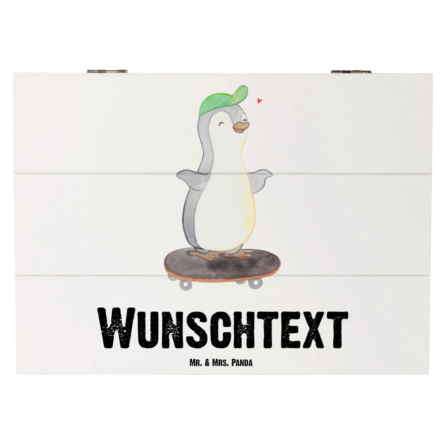 Entdecke die wundervolle, personalisierte Holzkiste mit dem süßen Motiv Pinguin Skateboarden Tage von Mr. & Mrs. Panda. Diese tolle Kiste ist perfekt für alle Skateboard-Fans und bietet einen idealen Aufbewahrungsort für die schönsten Erinnerungen.