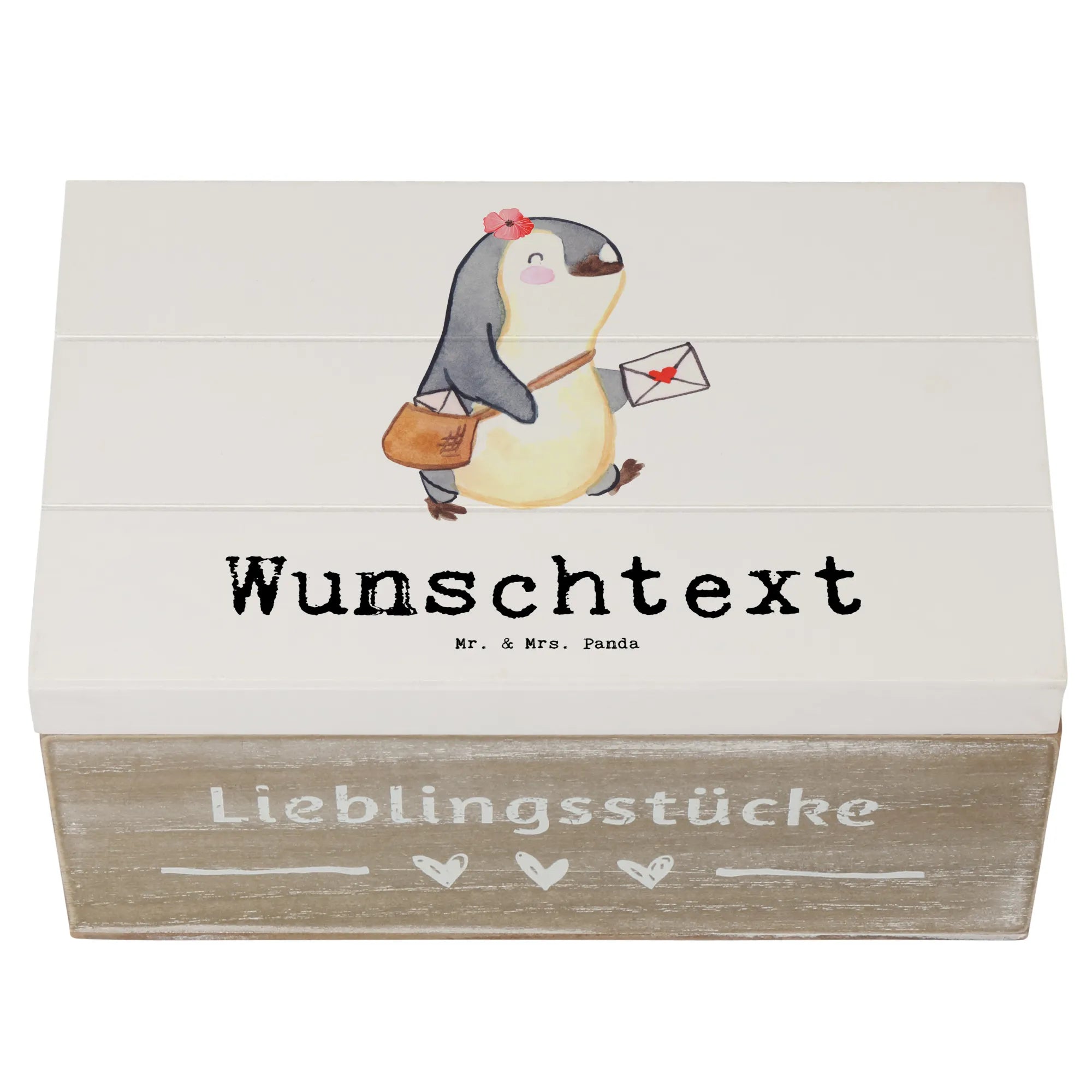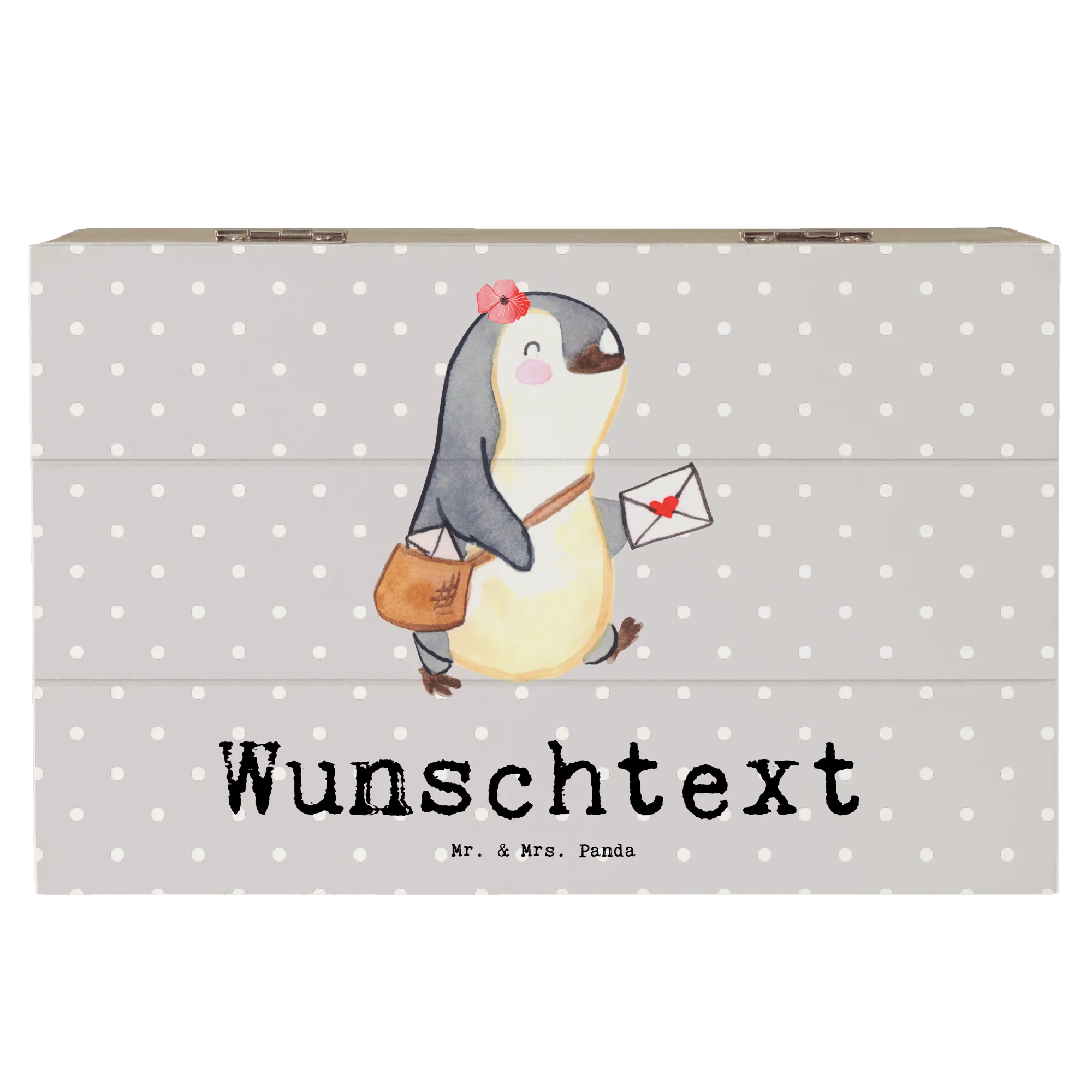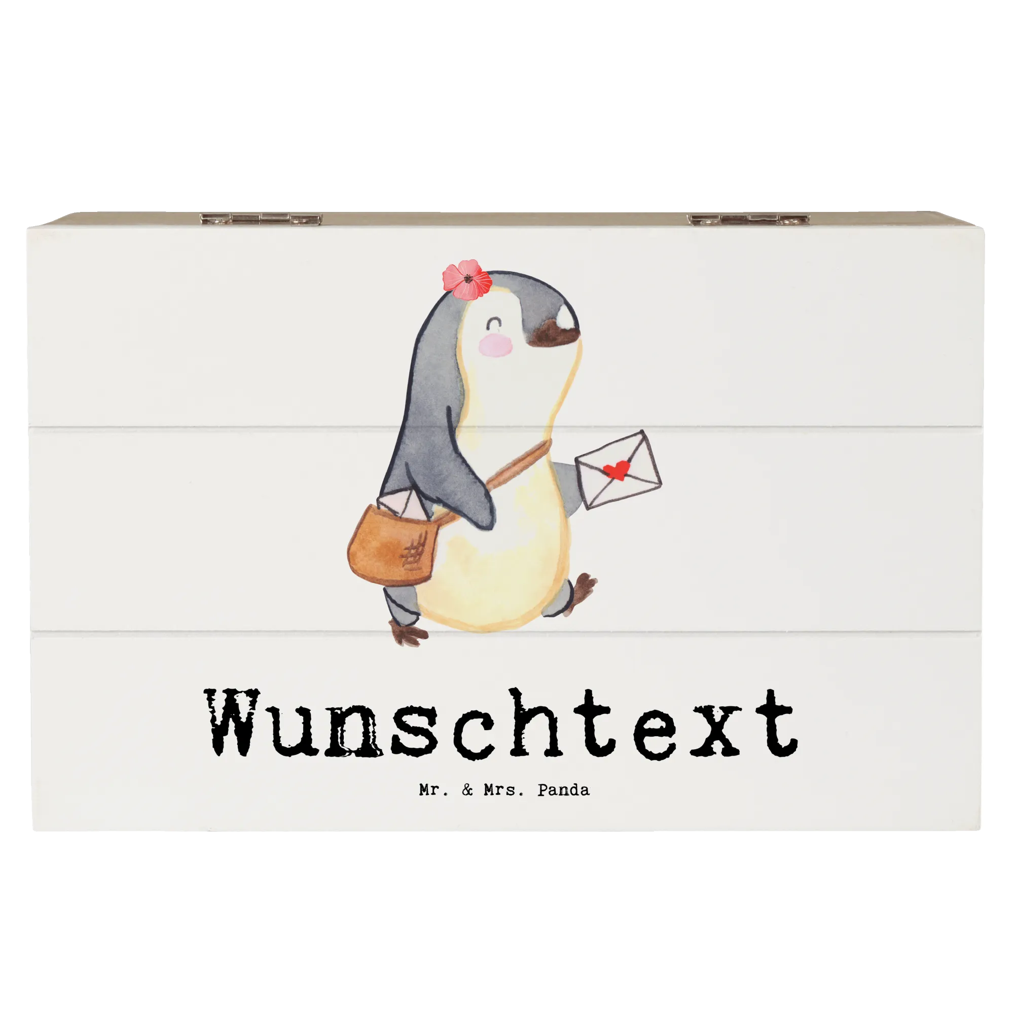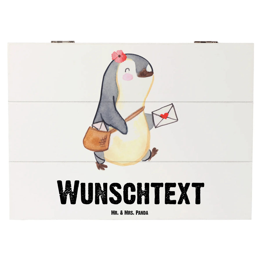 Personalisierte Holzkiste „Postbotin mit Herz“ – das liebevolle Geschenk aus der Berufe-Kollektion von Mr. & Mrs. Panda. Unser süßer Pinguin in Postuniform mit Herz und Posttasche wurde mit Aquarell liebevoll von Mrs. Panda gezeichnet. Die Kiste ist personalisierbar mit Deinem Wunschtext oder Namen und eignet sich perfekt als Schatzkiste mit Namen oder Erinnerungskiste personalisiert.