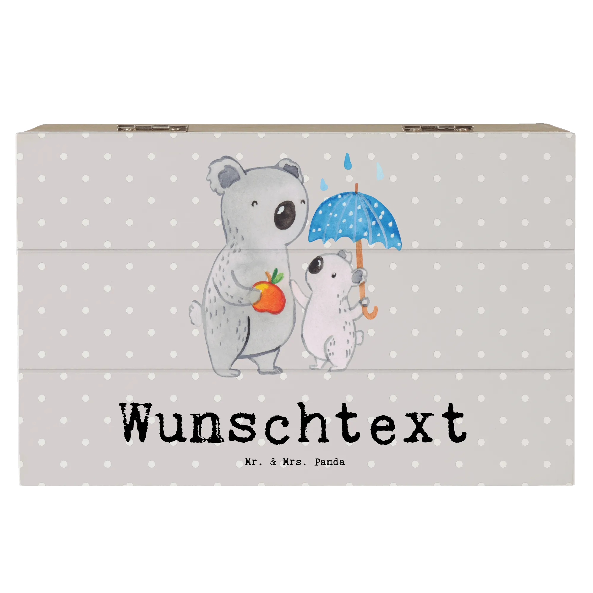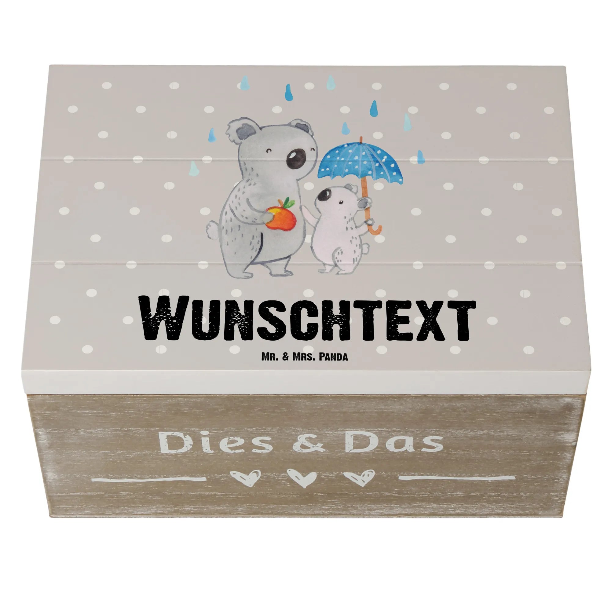 Die personalisierte Holzkiste "Tagesvater mit Herz" von Mr. & Mrs. Panda ist das perfekte Geschenk für alle Tagesväter und ihre kleinen Schützlinge! Diese wunderschöne, handverlesene Schatzkiste ist nicht nur aus stabiler Premium Hartfaser gefertigt, sondern ebenfalls mit einem zauberhaften Motiv bedruckt. Der süße Koala, der mit einem kleinen Koala-Kind unterm Regenschirm steht, ist ein liebevolles Symbol für die Fürsorge, die Tagesväter ihren Kindern bieten.