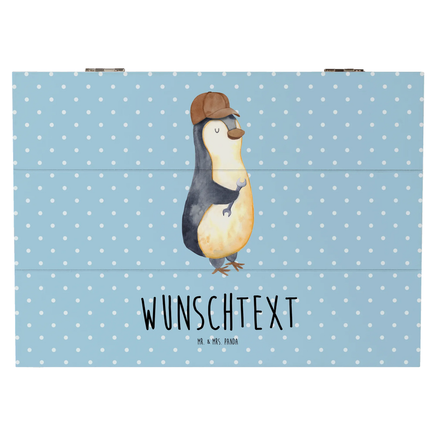 Sie ist mit einem stilvollen Pinguinmotiv versehen, der mit einem charmanten Grinsen und einem Schraubenschlüssel seine handwerklichen Fähigkeiten demonstriert. Diese Erinnerungskiste ist nicht nur praktisch, sondern auch ein echter Hingucker in jeder Wohnung.