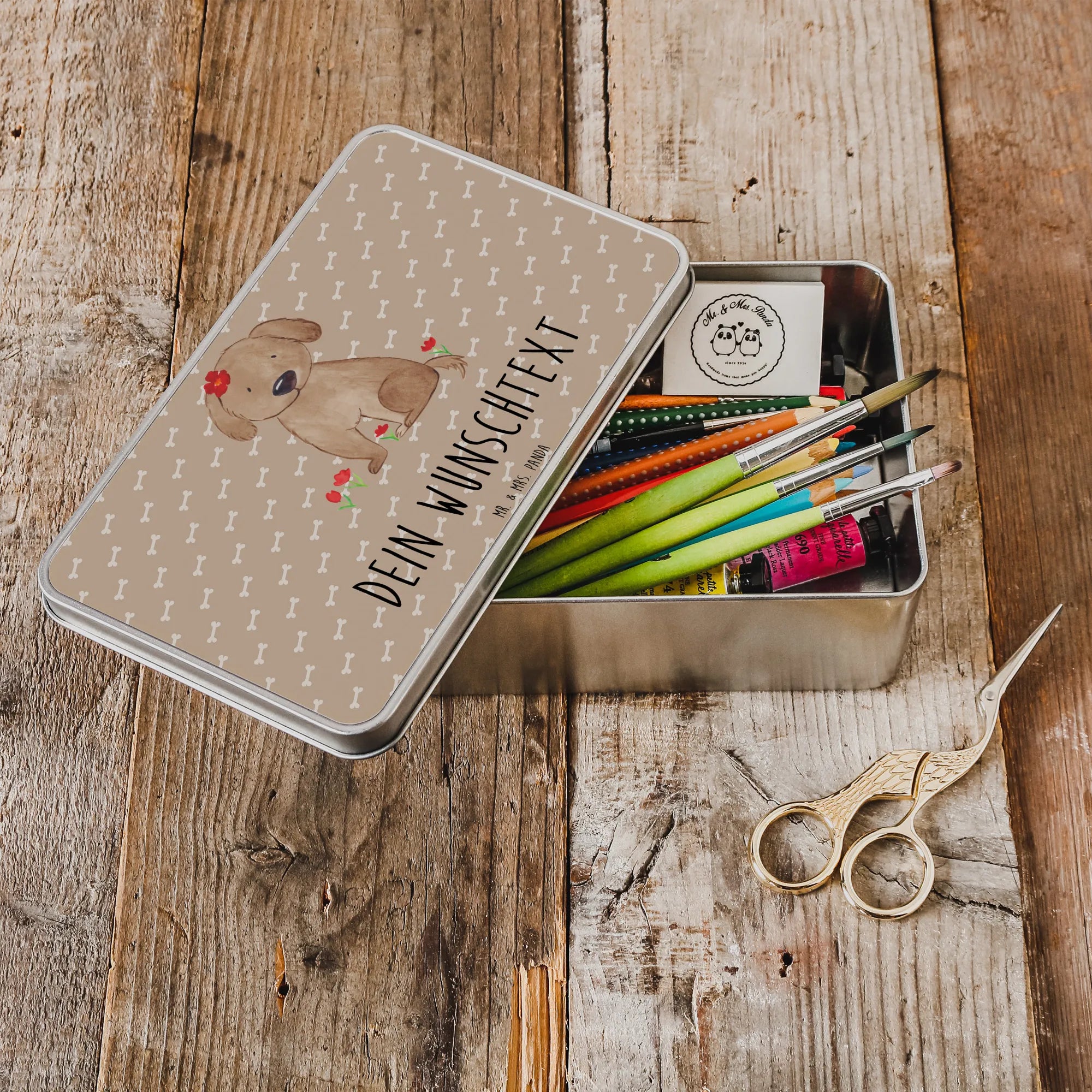 Zeige deine kreative Seite mit der personalisierten Metalldose von Mr. & Mrs. Panda! Diese einzigartige Dose hat die Maße 198 mm x 128 mm x 50 mm und wiegt 180 g. Das hochwertige Metall sorgt für eine besonders hohe Stabilität und Langlebigkeit. Mit zauberhaften Druckmotiven führt diese Metalldose in die Welt von Mr. & Mrs. Panda und lässt sich ganz nach deinen Wünschen personalisieren. Ob du sie für Kekse, wichtige Erinnerungen oder als formschöne Geschenkbox nutzen möchtest – diese Dose ist in jedem Fall ein Hingucker. Die glänzende Oberfläche unterstreicht den hochwertigen Eindruck. Zur Pflege empfehlen wir die Handspülung, damit du lange Freude an deiner Dose hast.